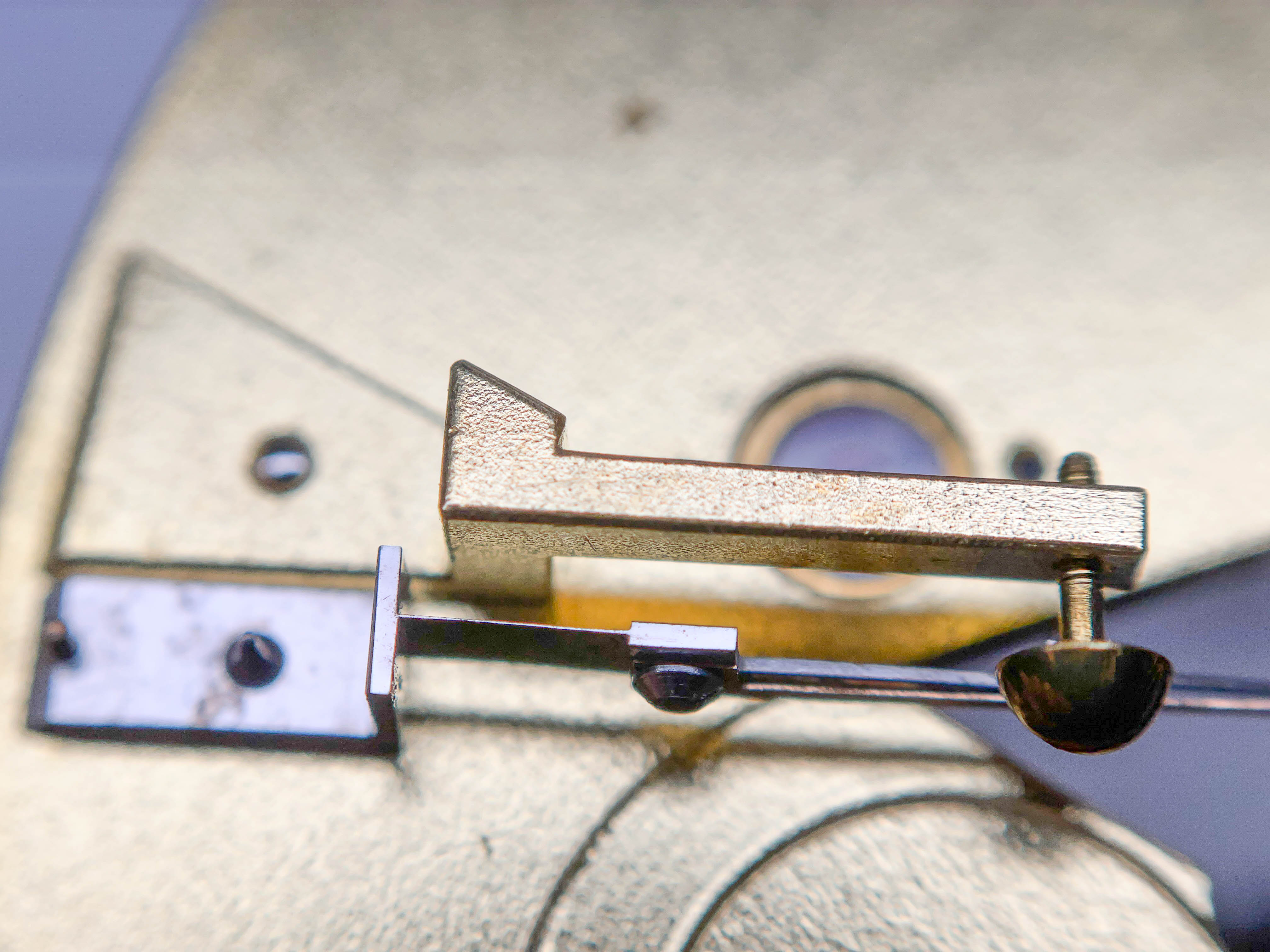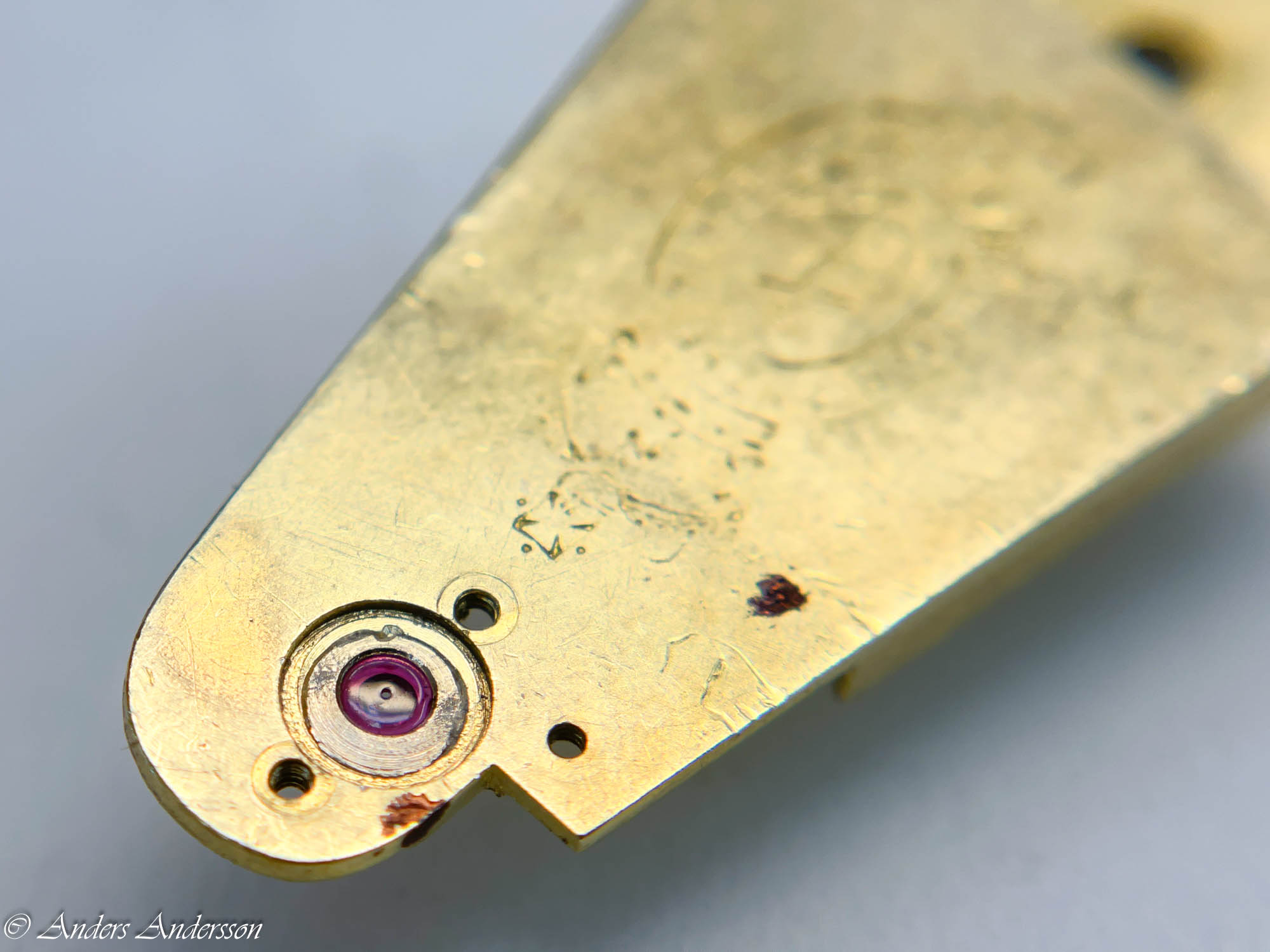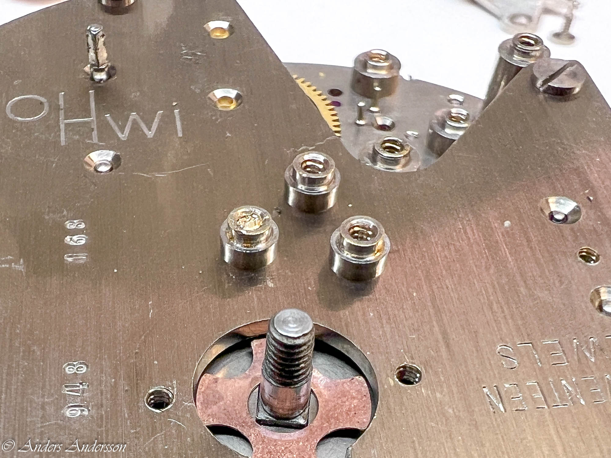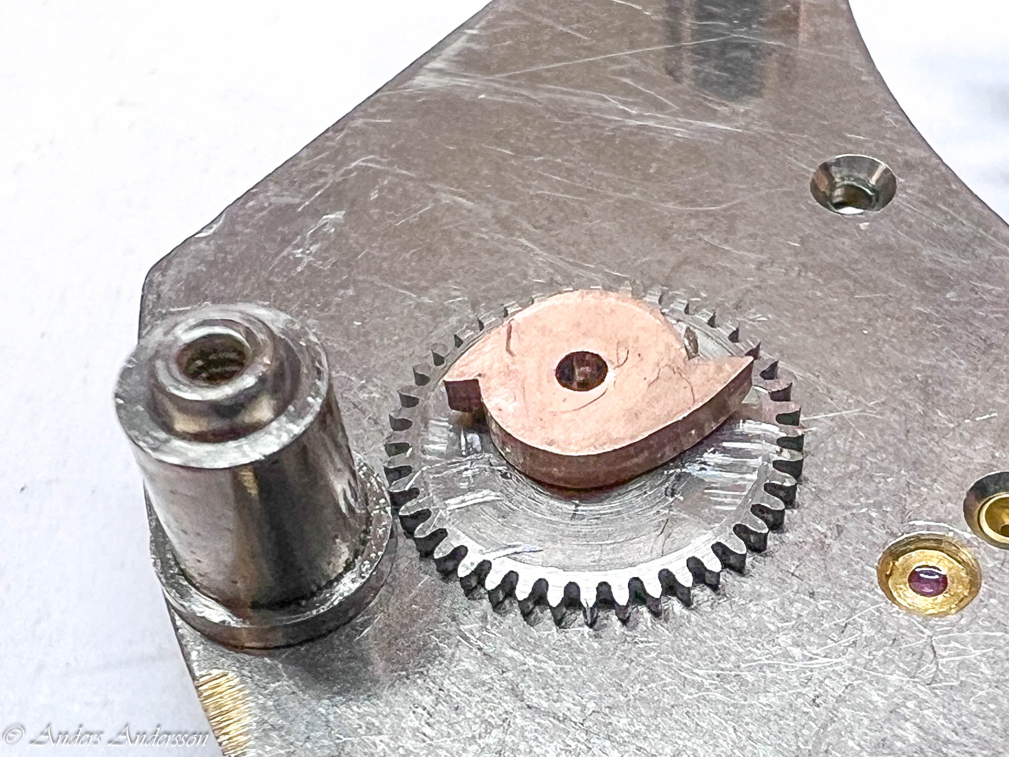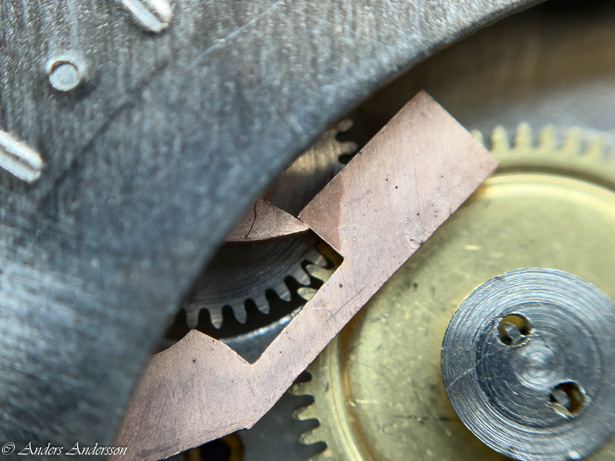 Ganska snart upptäckte jag att verket blivit utsatt för misshandel av en ”så kallad urmakare”. Jag upptäckte många fel och slitage, men även tidigare reparationer av någon med kunskap. På ovanstående bild ser man att hakstenen är flyttad uppåt parallellt med haken.