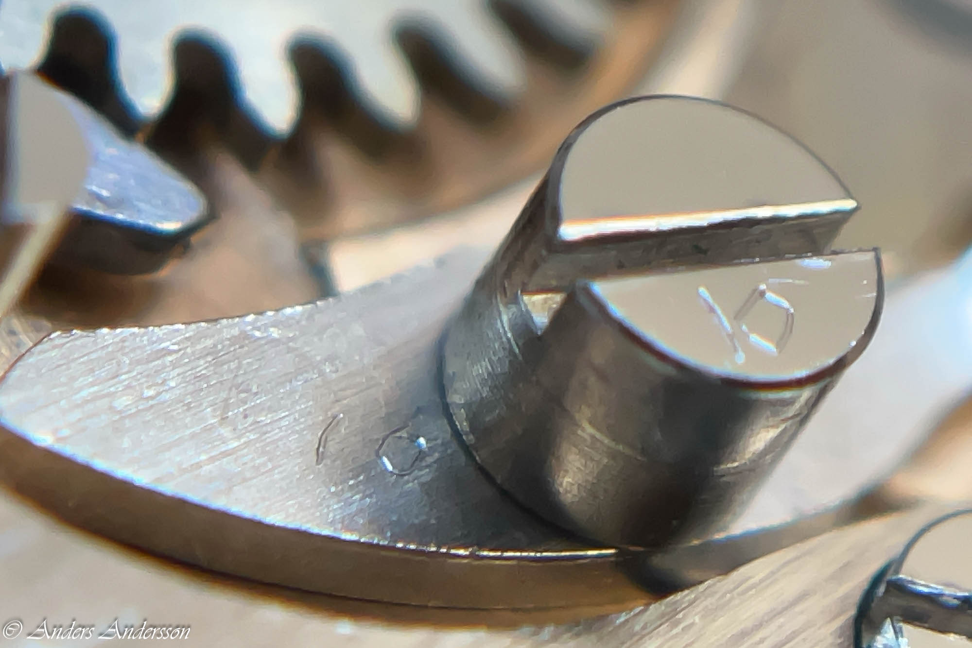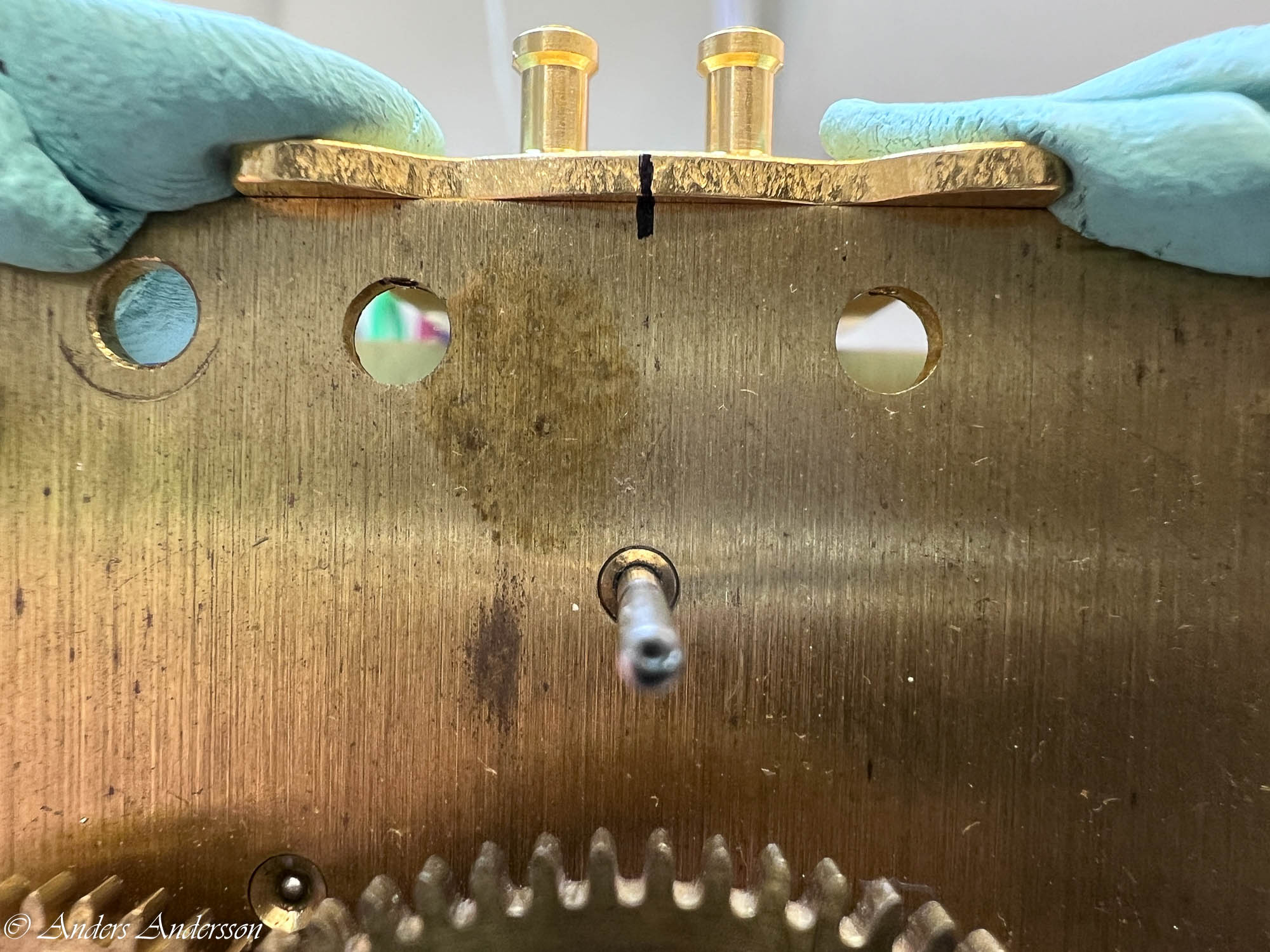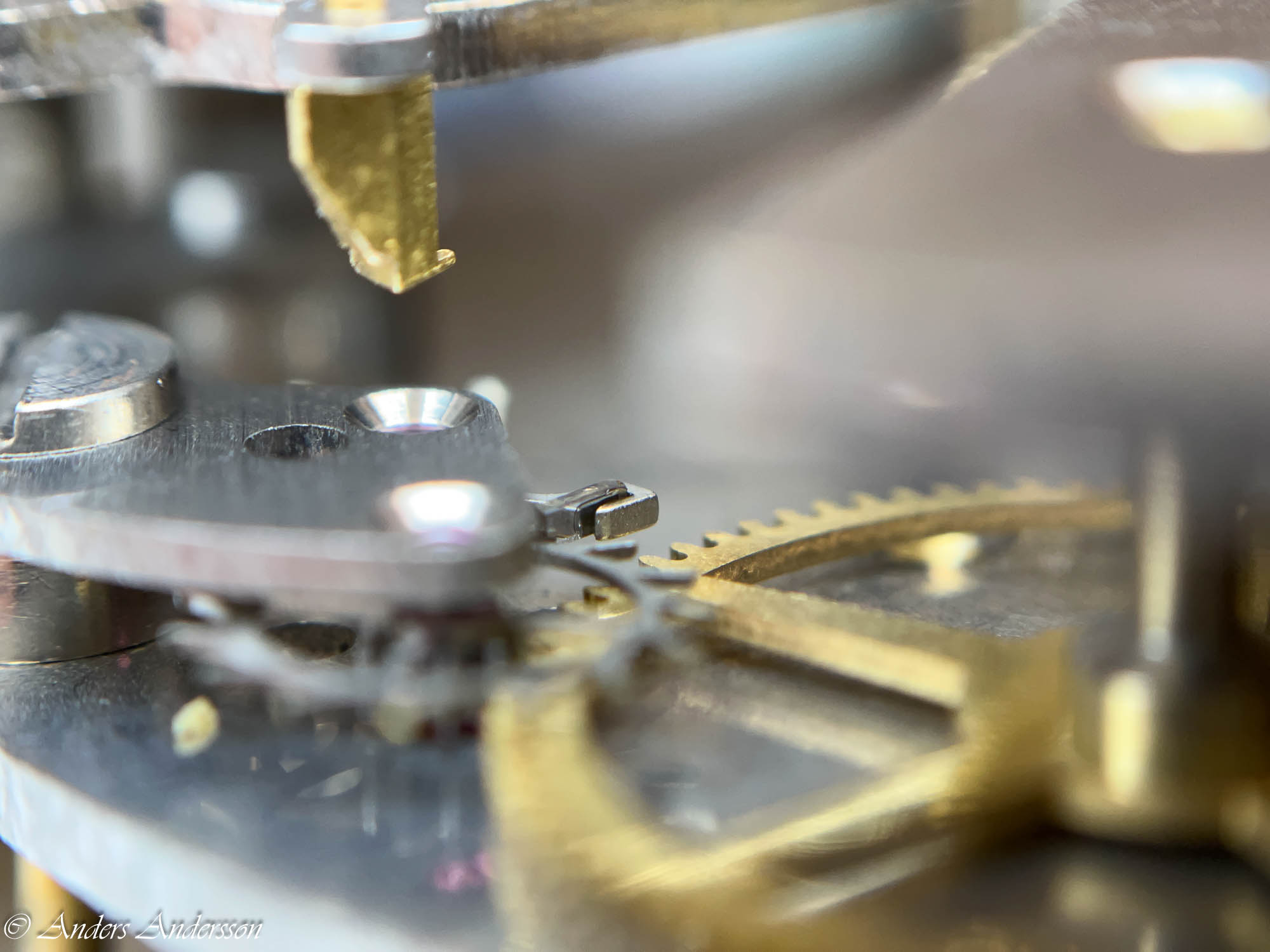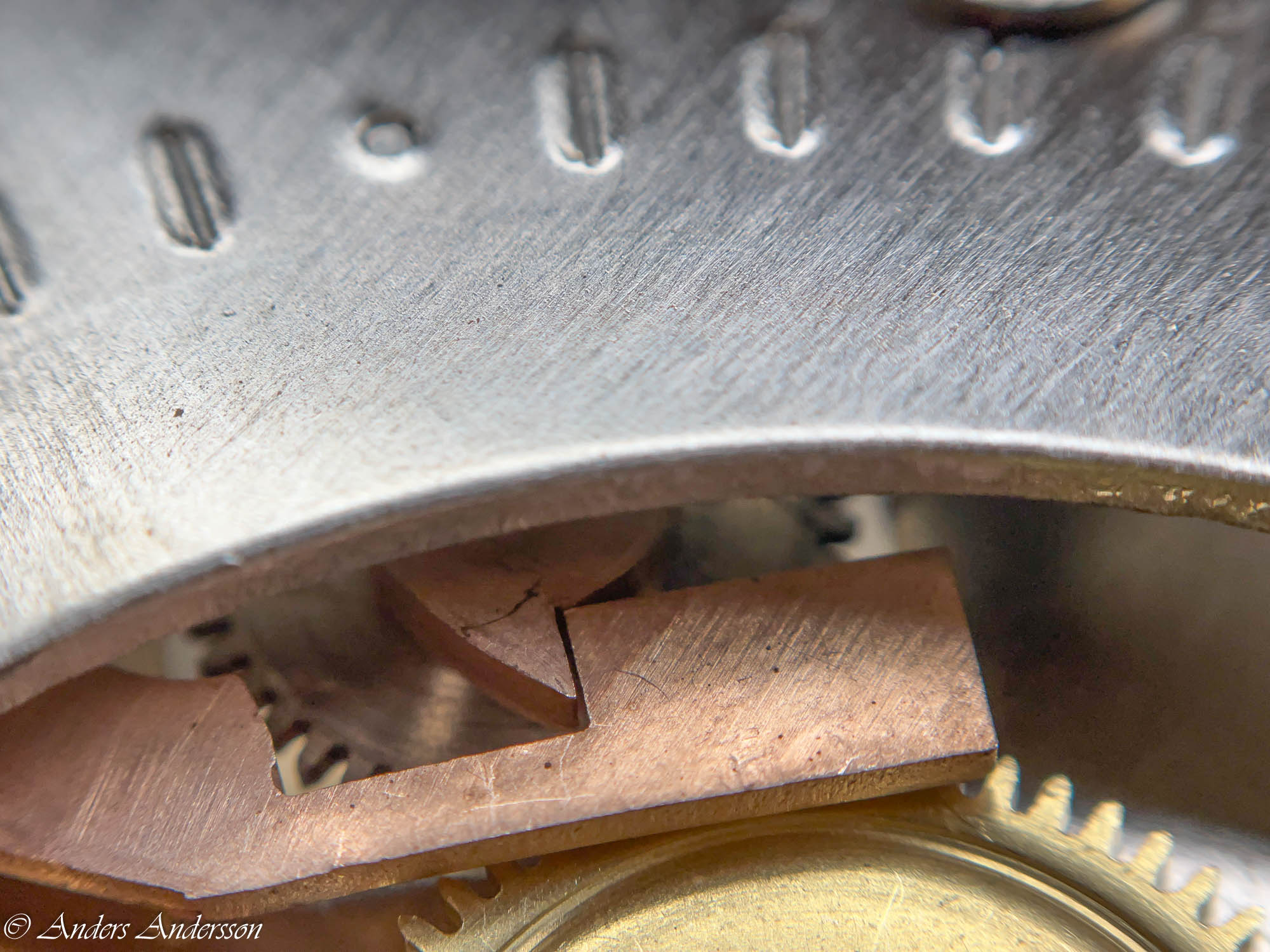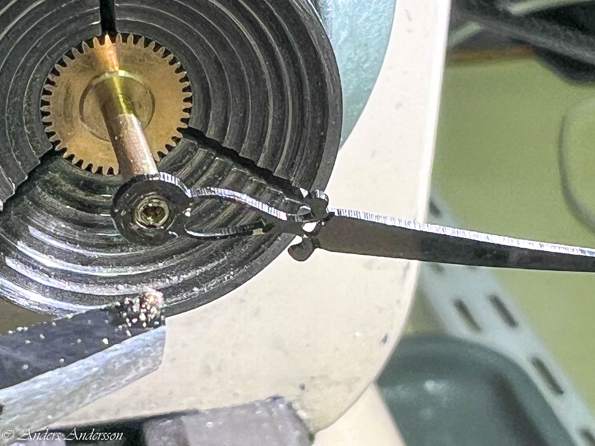 Ganska snart upptäckte jag att verket blivit utsatt för misshandel av en ”så kallad urmakare”. Jag upptäckte många fel och slitage, men även tidigare reparationer av någon med kunskap. På ovanstående bild ser man att hakstenen är flyttad uppåt parallellt med haken.