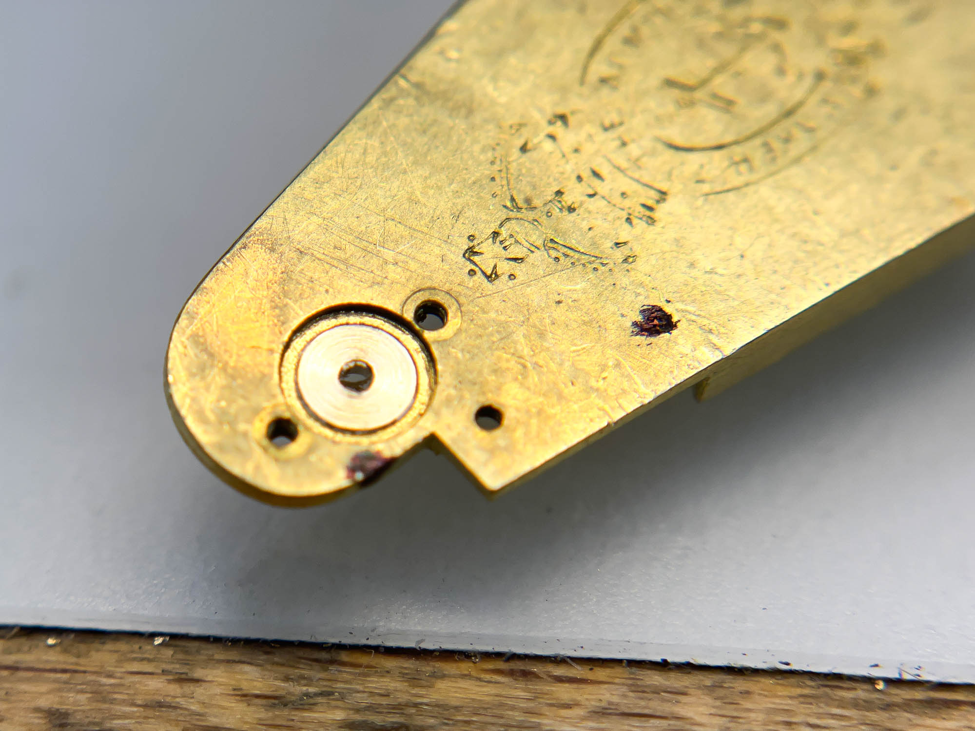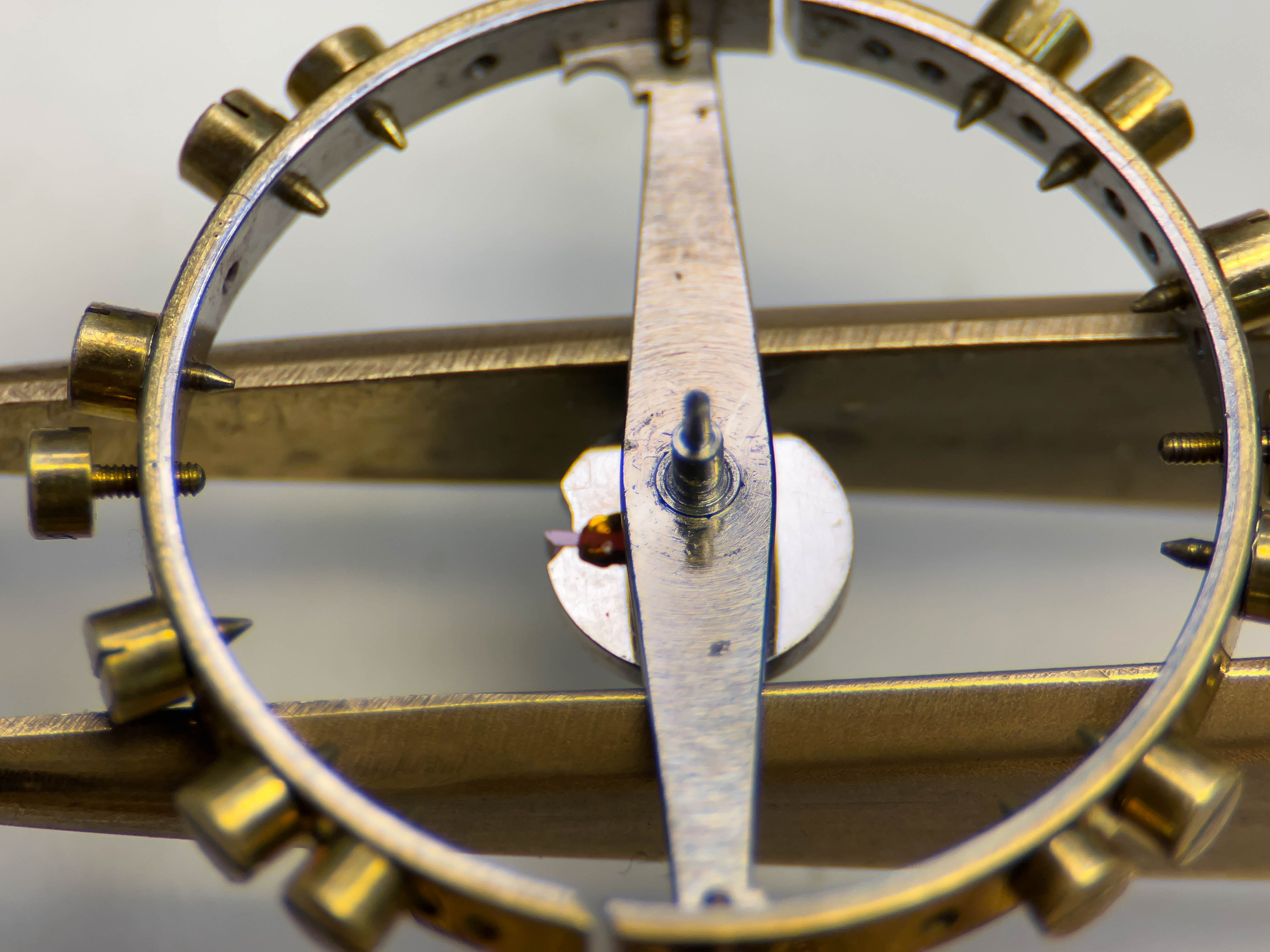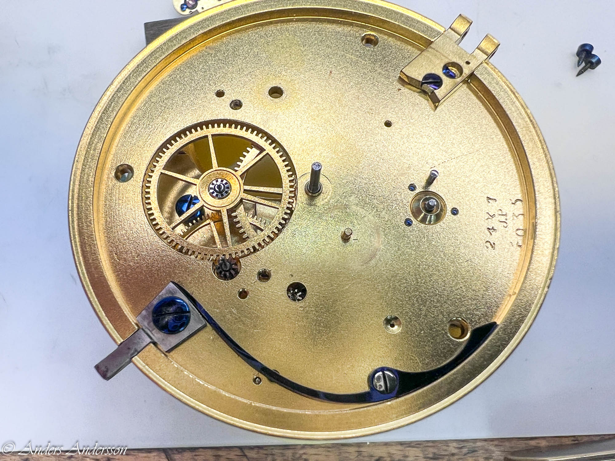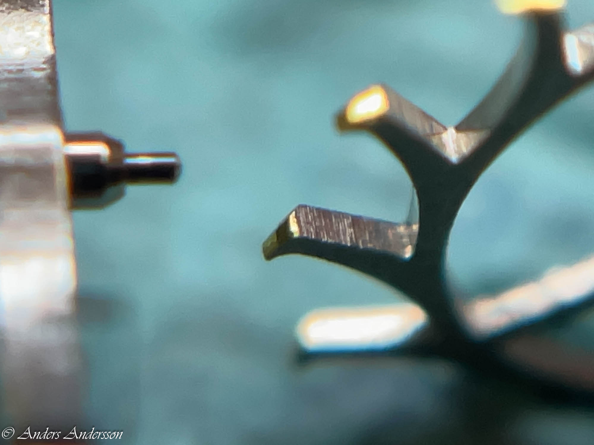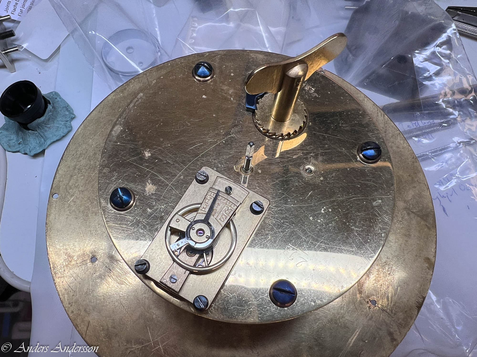 Ganska snart upptäckte jag att verket blivit utsatt för misshandel av en ”så kallad urmakare”. Jag upptäckte många fel och slitage, men även tidigare reparationer av någon med kunskap. På ovanstående bild ser man att hakstenen är flyttad uppåt parallellt med haken.