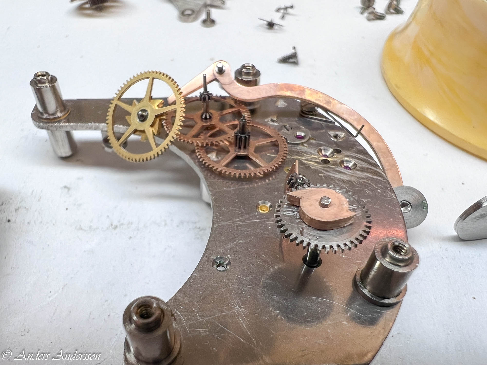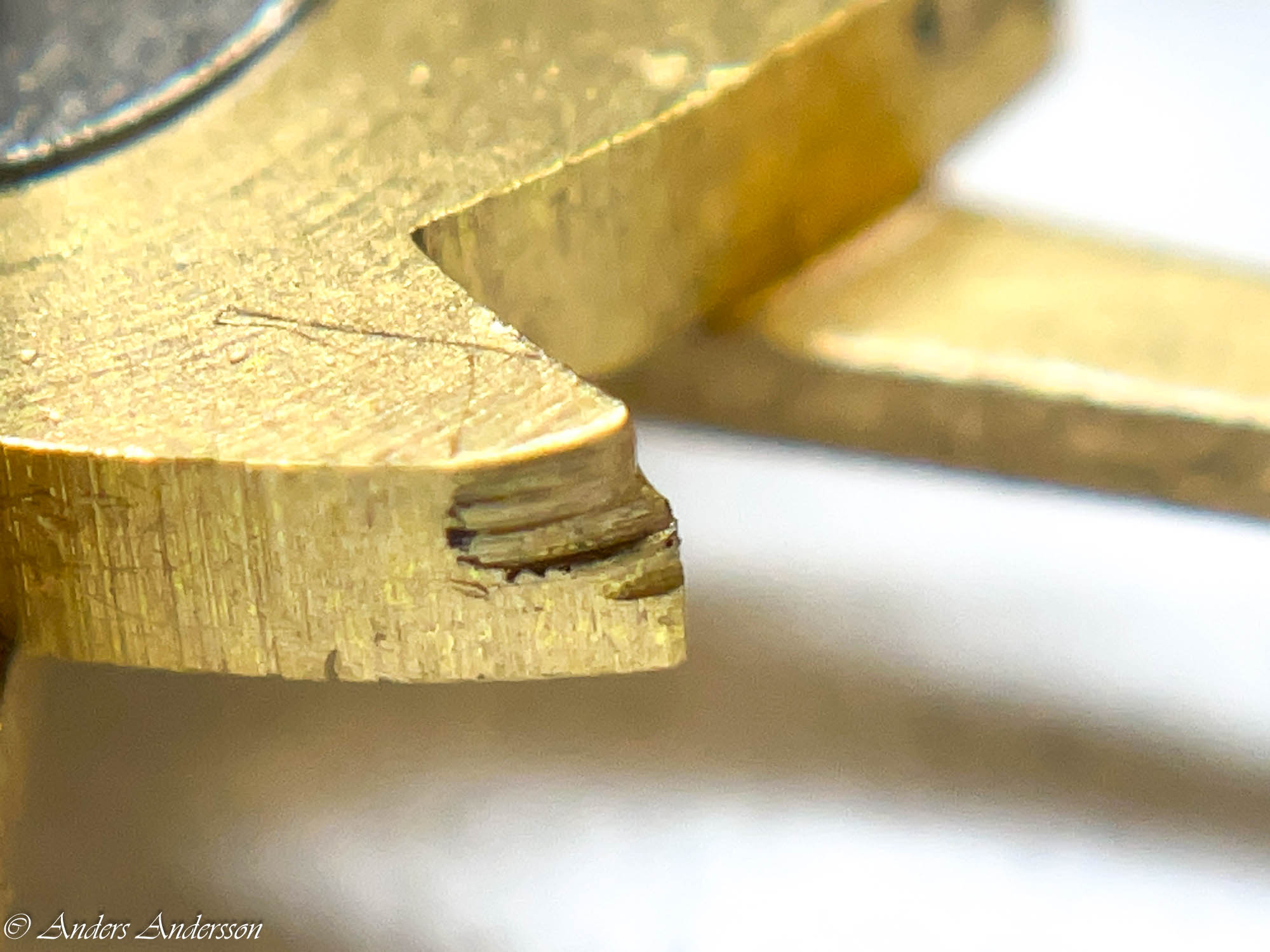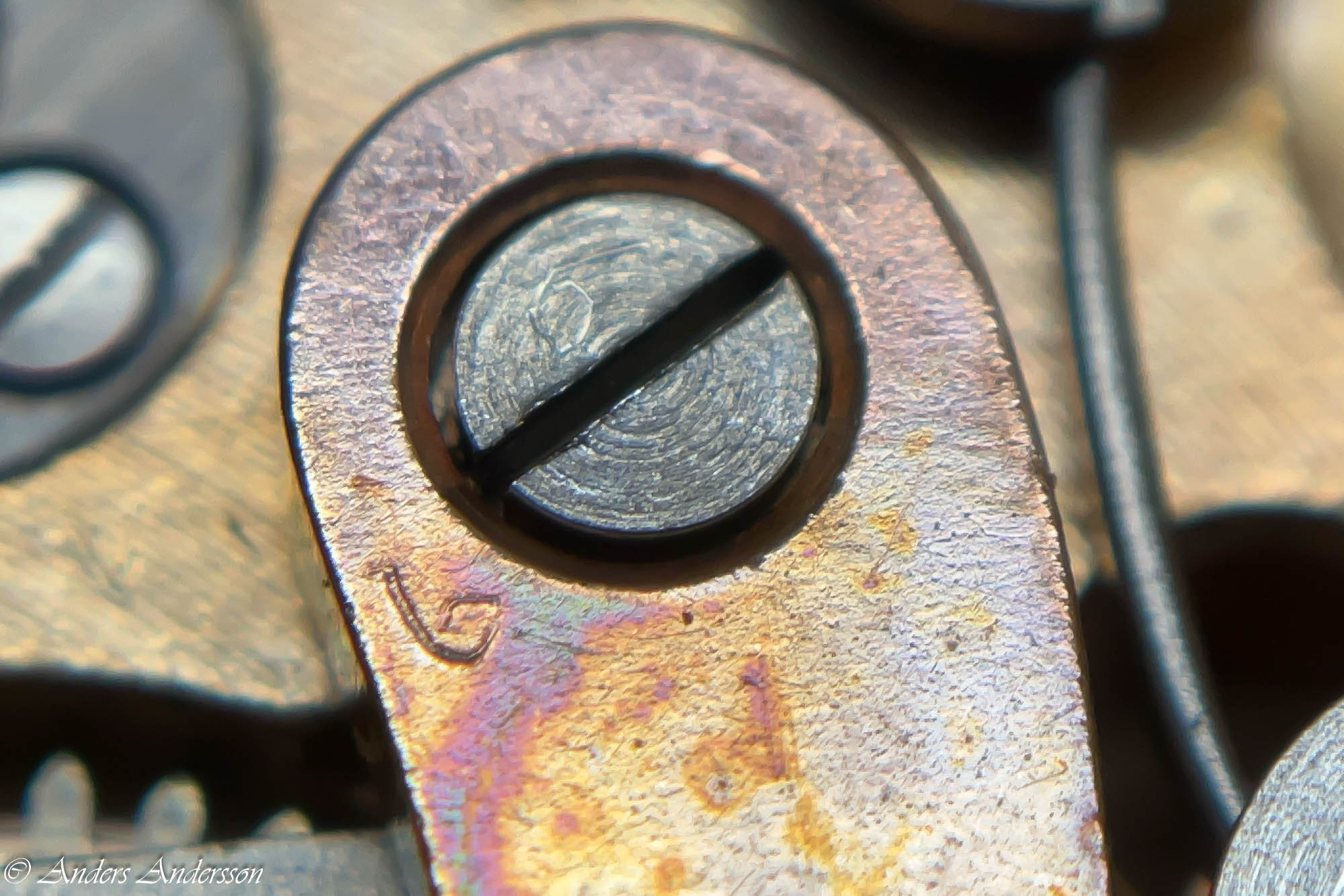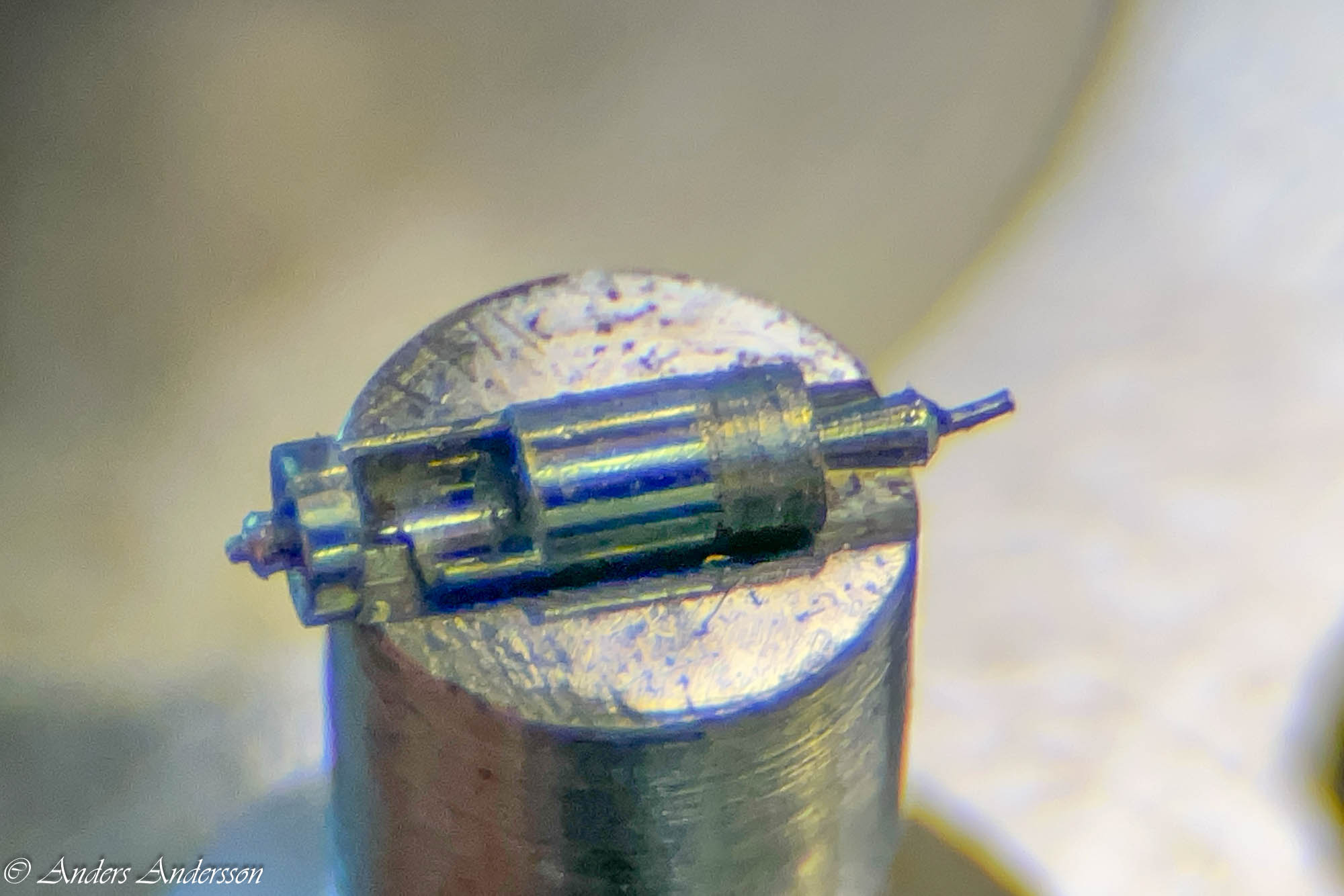 Ganska snart upptäckte jag att verket blivit utsatt för misshandel av en ”så kallad urmakare”. Jag upptäckte många fel och slitage, men även tidigare reparationer av någon med kunskap. På ovanstående bild ser man att hakstenen är flyttad uppåt parallellt med haken.