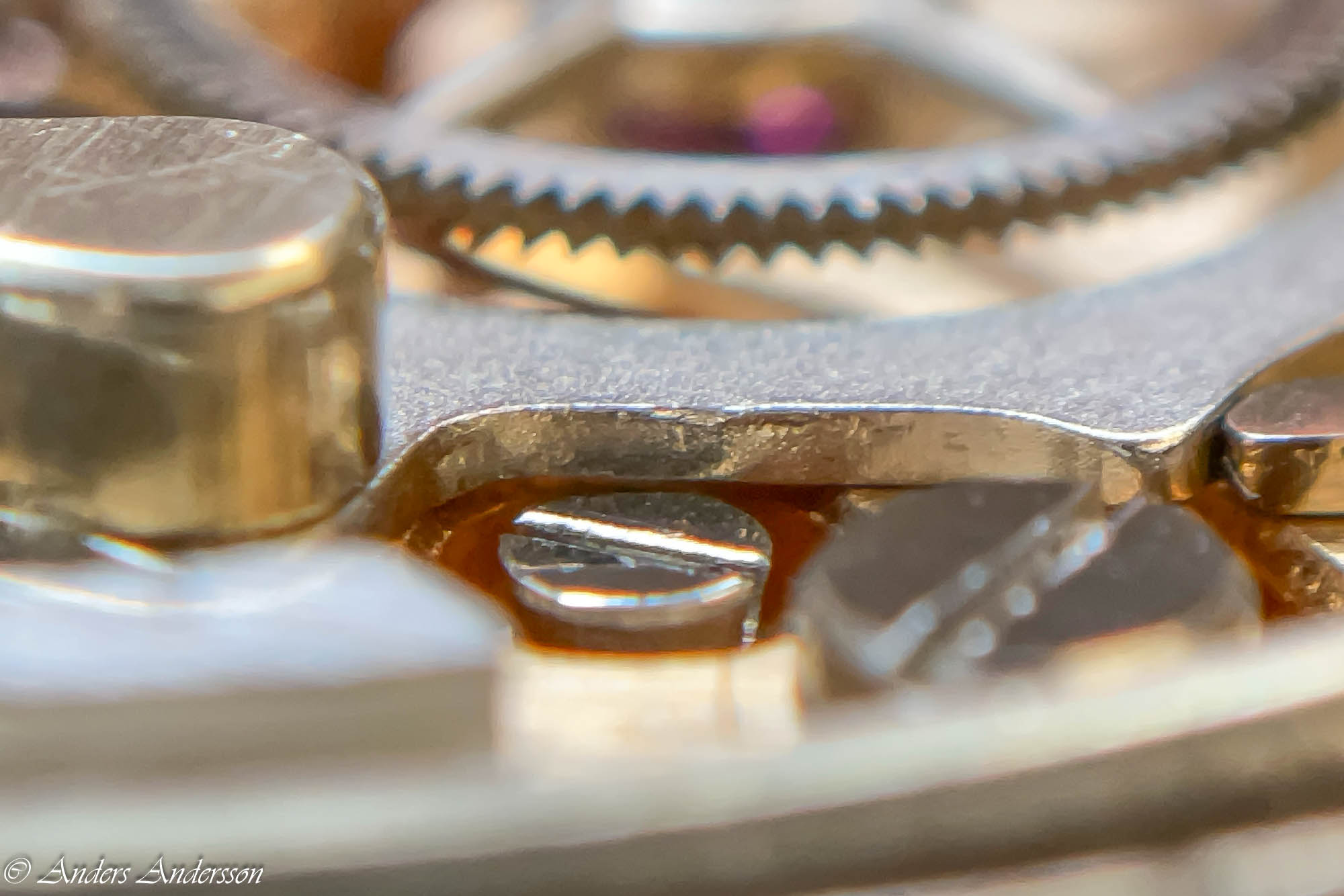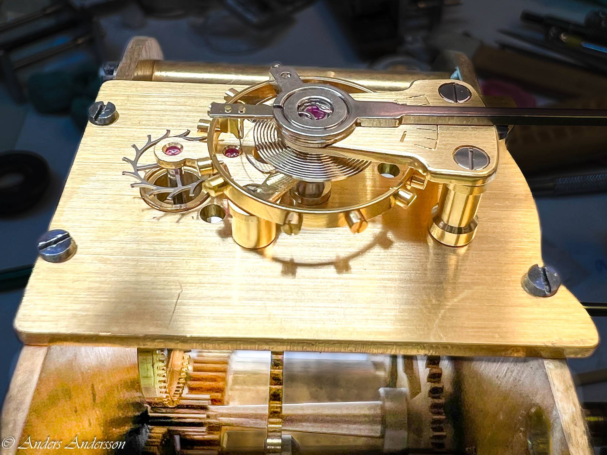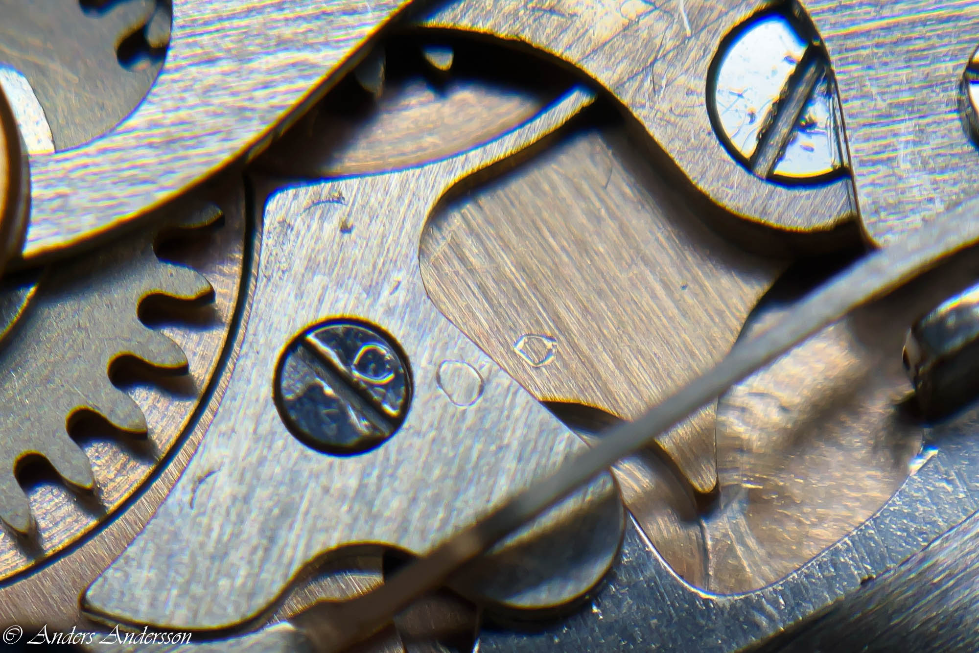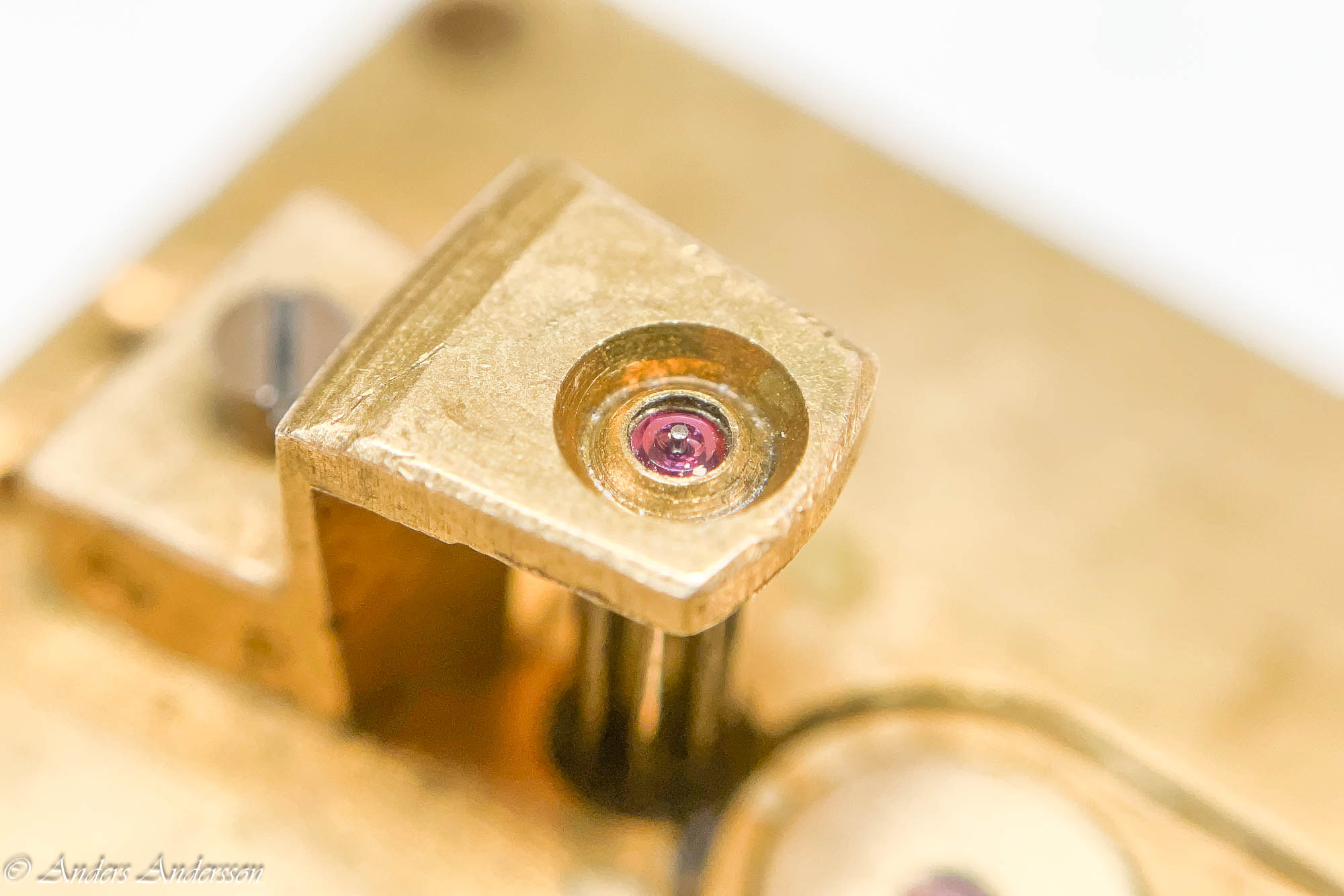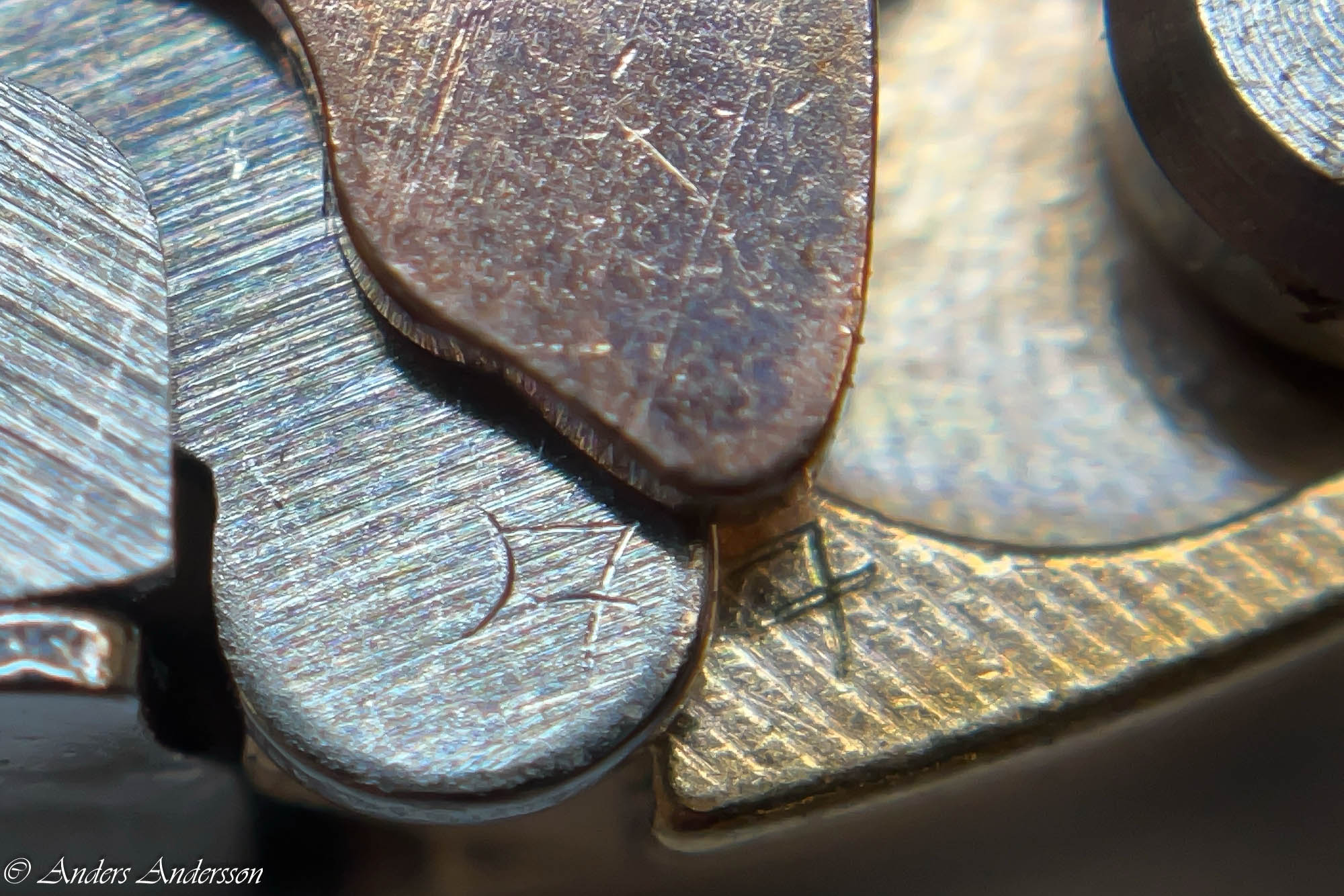 Ganska snart upptäckte jag att verket blivit utsatt för misshandel av en ”så kallad urmakare”. Jag upptäckte många fel och slitage, men även tidigare reparationer av någon med kunskap. På ovanstående bild ser man att hakstenen är flyttad uppåt parallellt med haken.