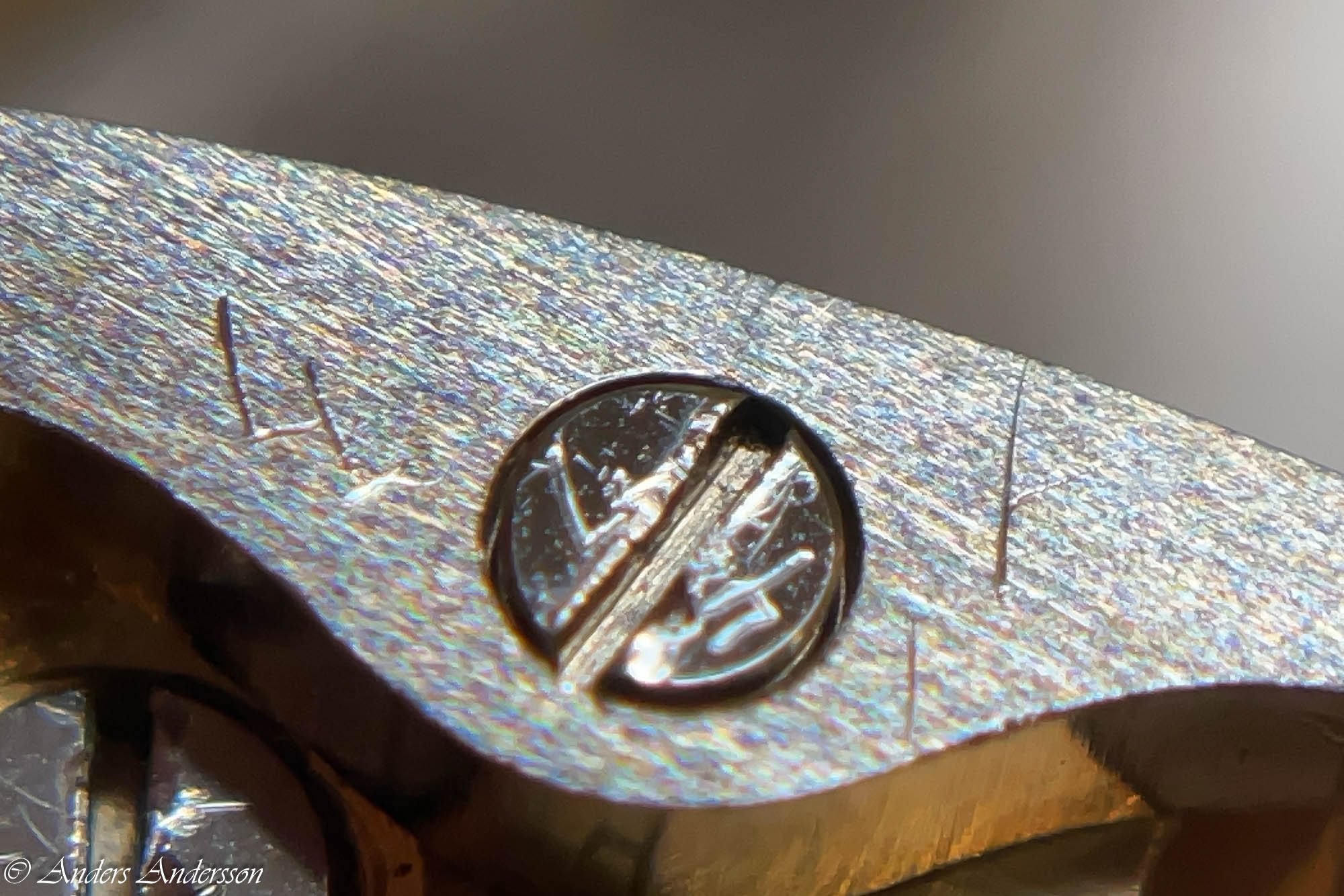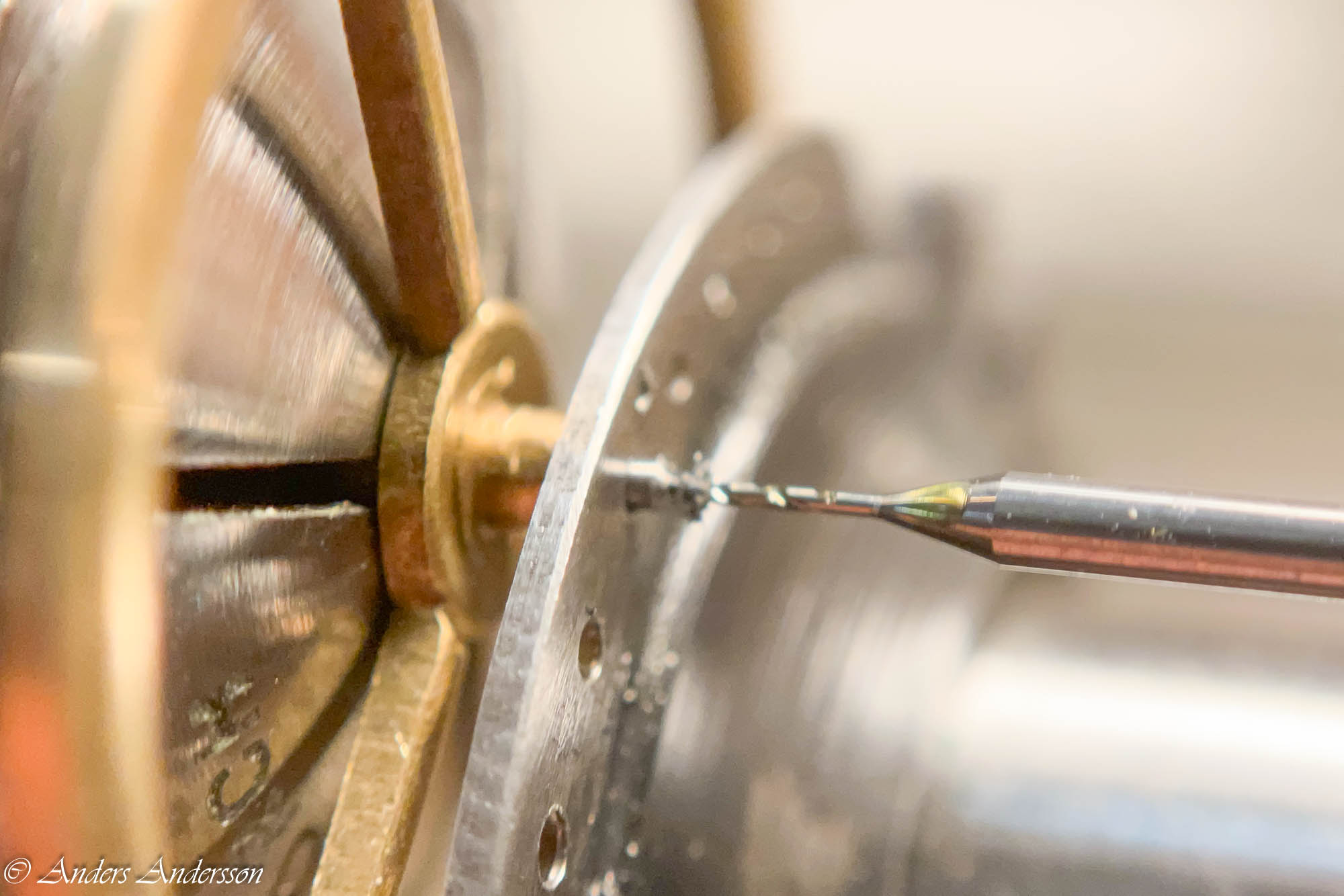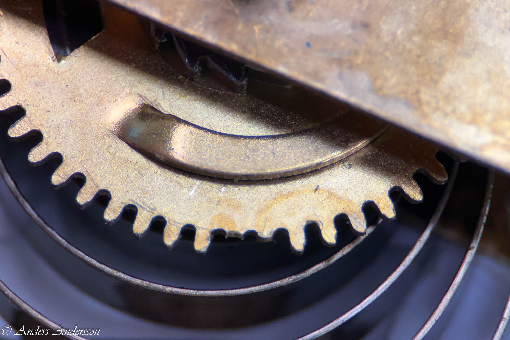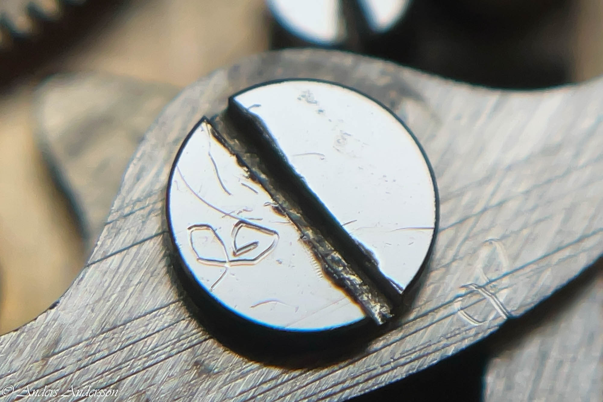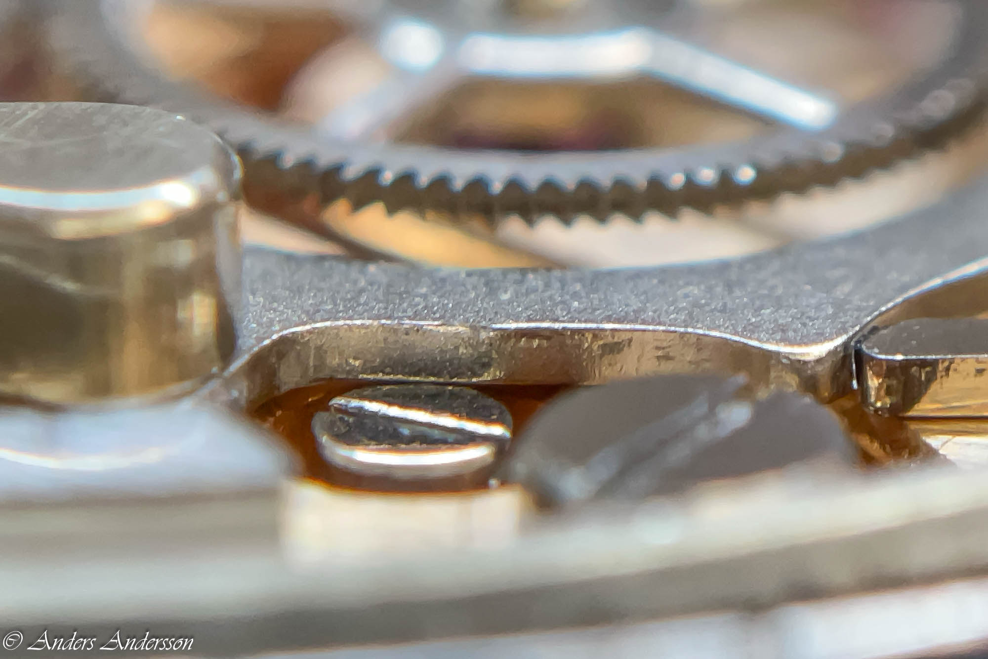 Ganska snart upptäckte jag att verket blivit utsatt för misshandel av en ”så kallad urmakare”. Jag upptäckte många fel och slitage, men även tidigare reparationer av någon med kunskap. På ovanstående bild ser man att hakstenen är flyttad uppåt parallellt med haken.
