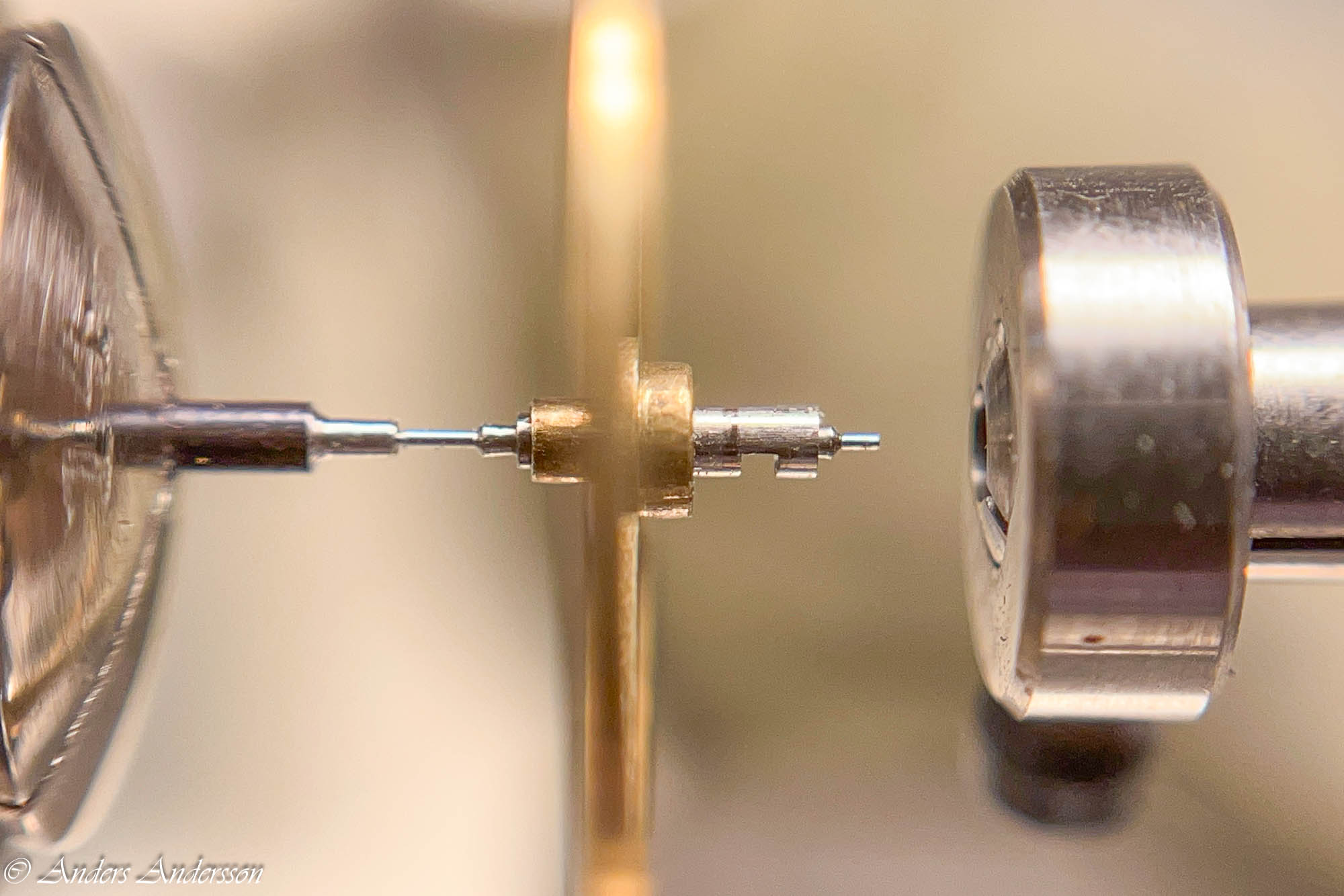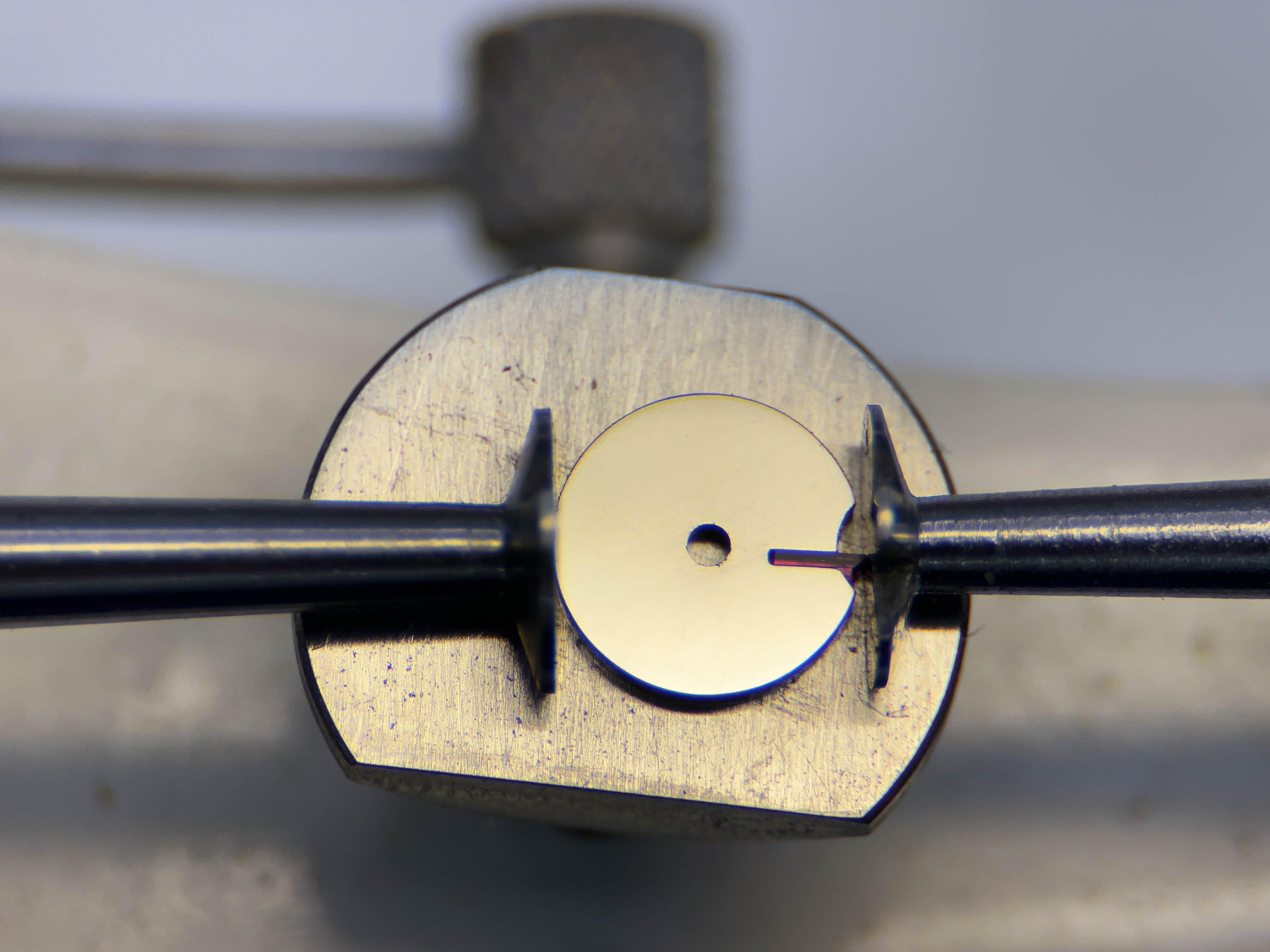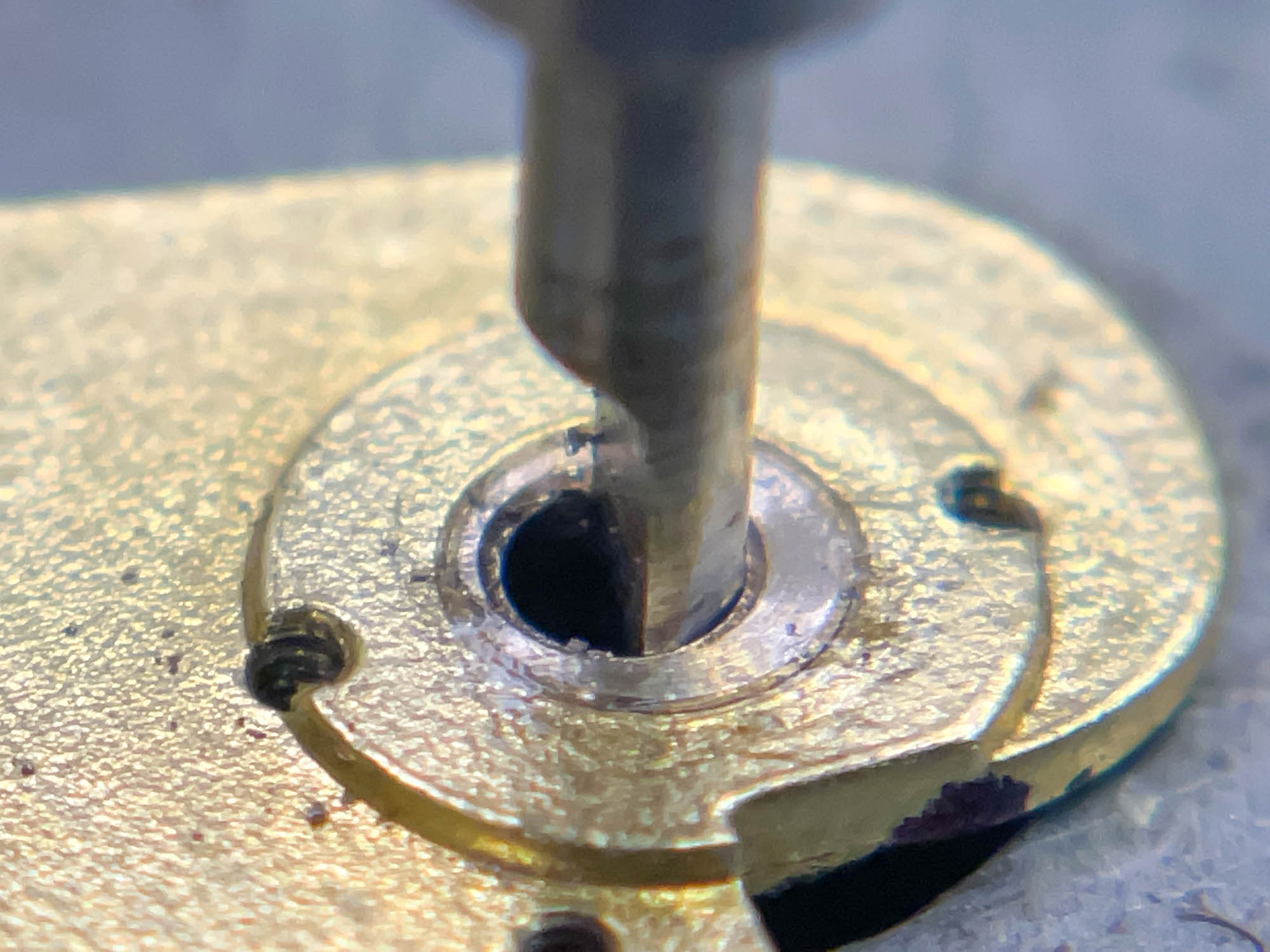 Istället för att försöka lyfta utlösaren med risk att skada minuthjulet och lyftaren använder jag en stans mot axeln. Som synes har någon varit före mig som inte använt den metoden.