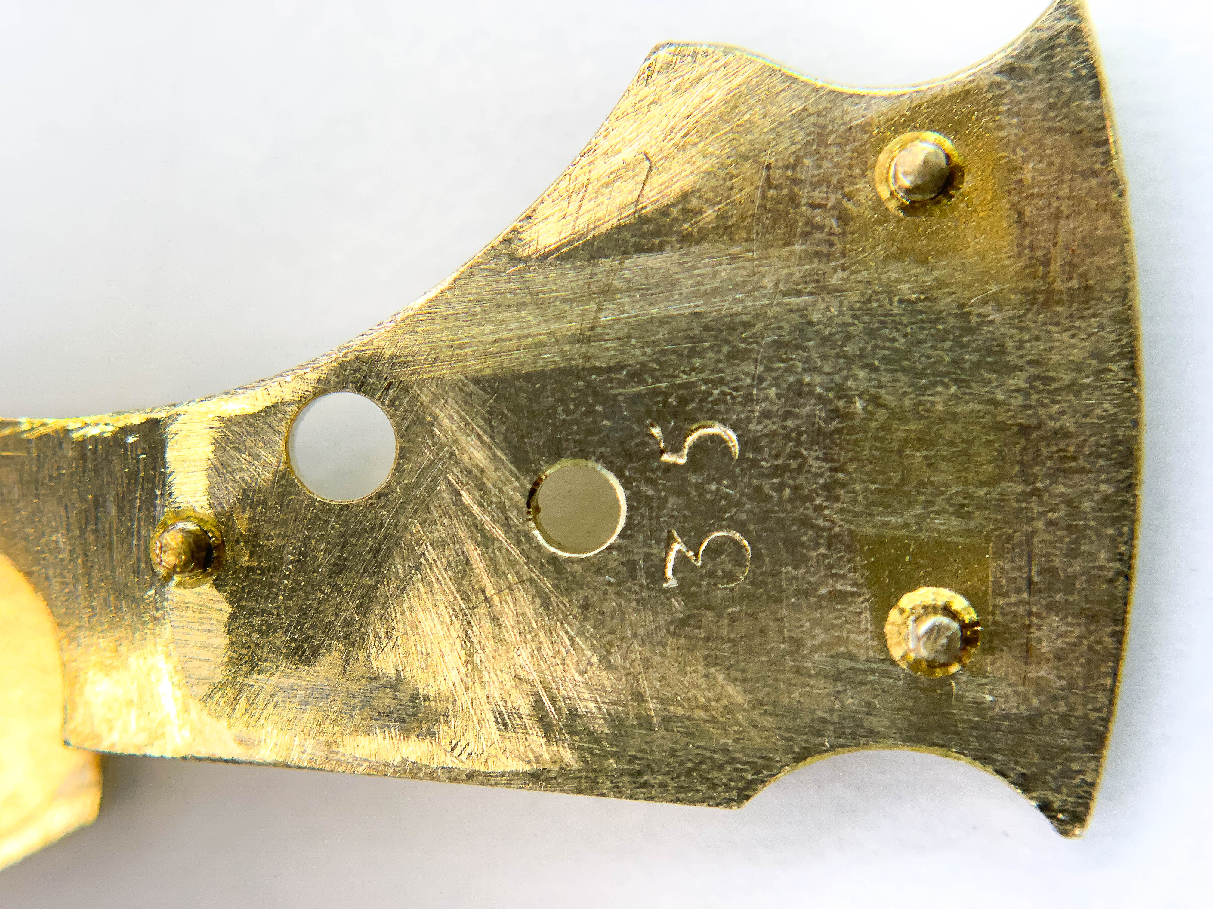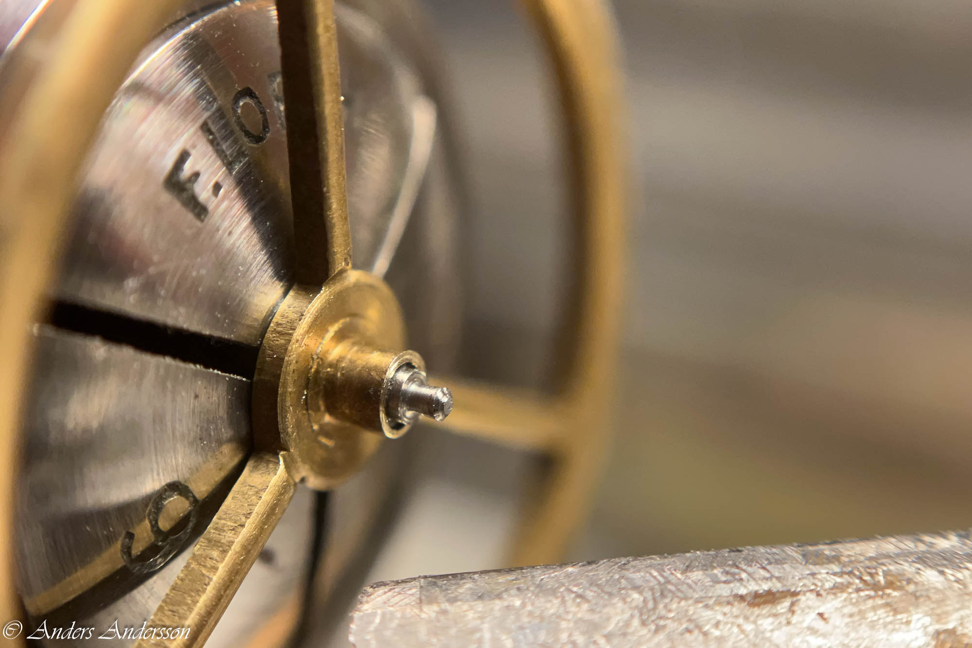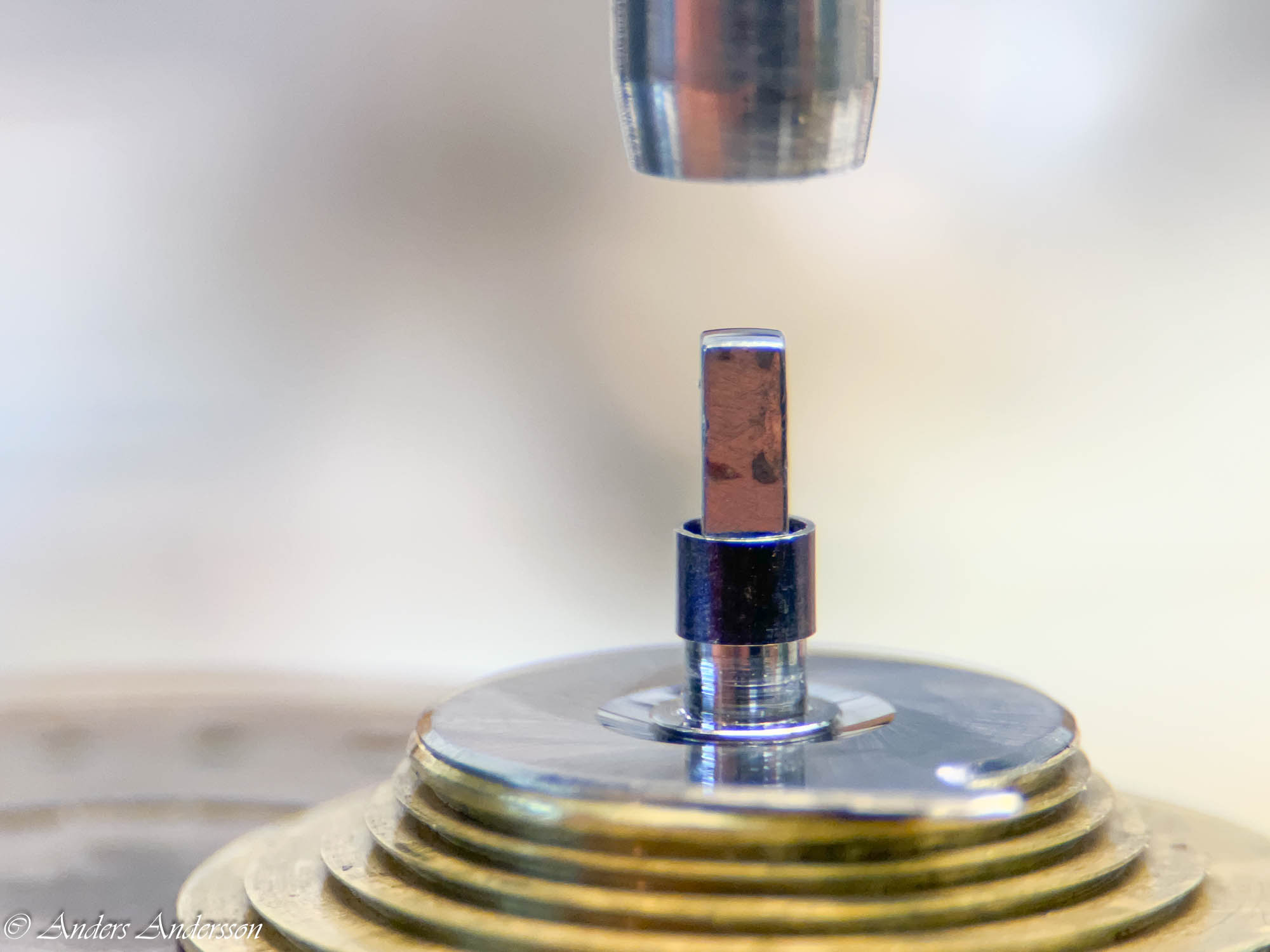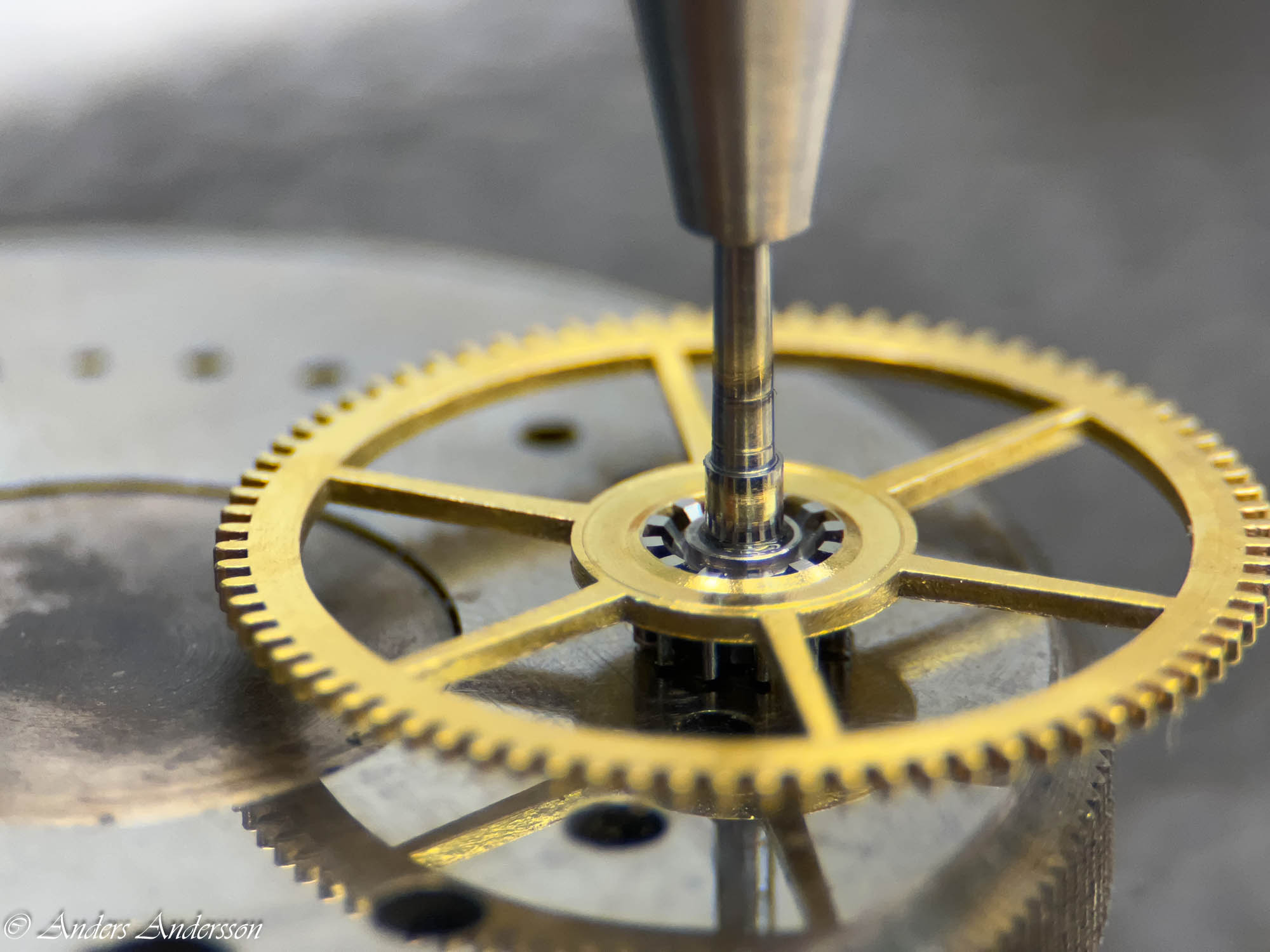 Istället för att försöka lyfta utlösaren med risk att skada minuthjulet och lyftaren använder jag en stans mot axeln. Som synes har någon varit före mig som inte använt den metoden.
