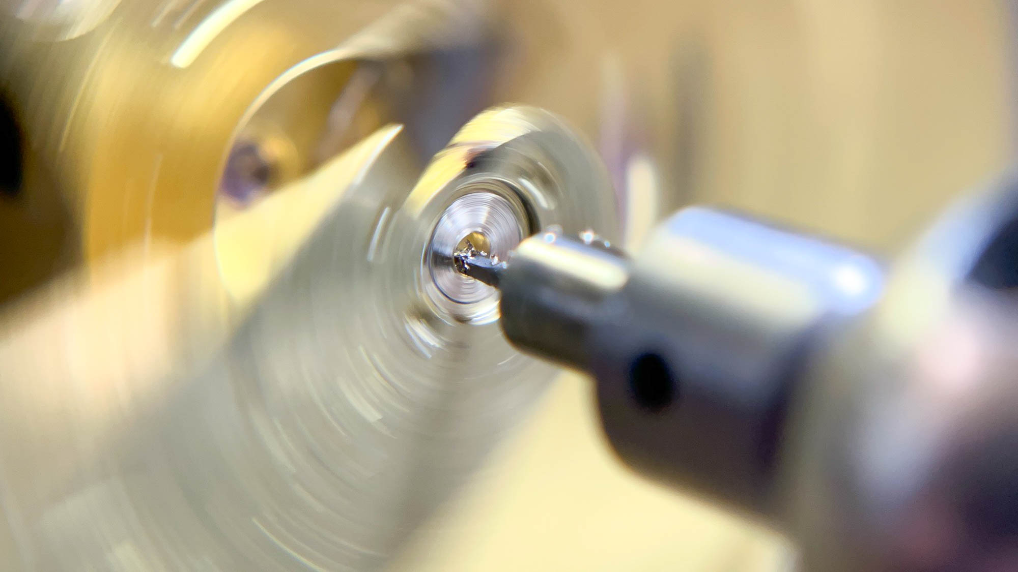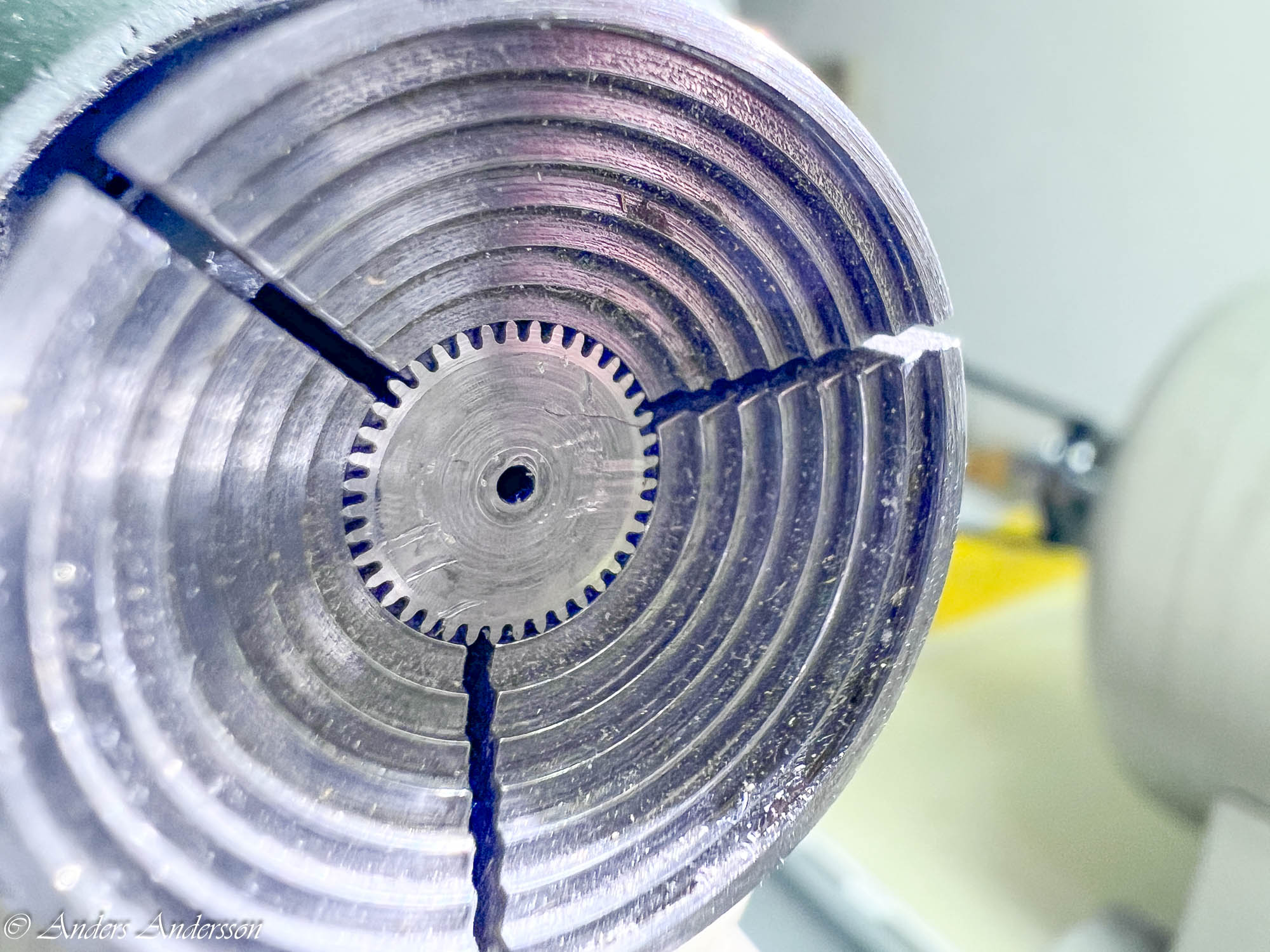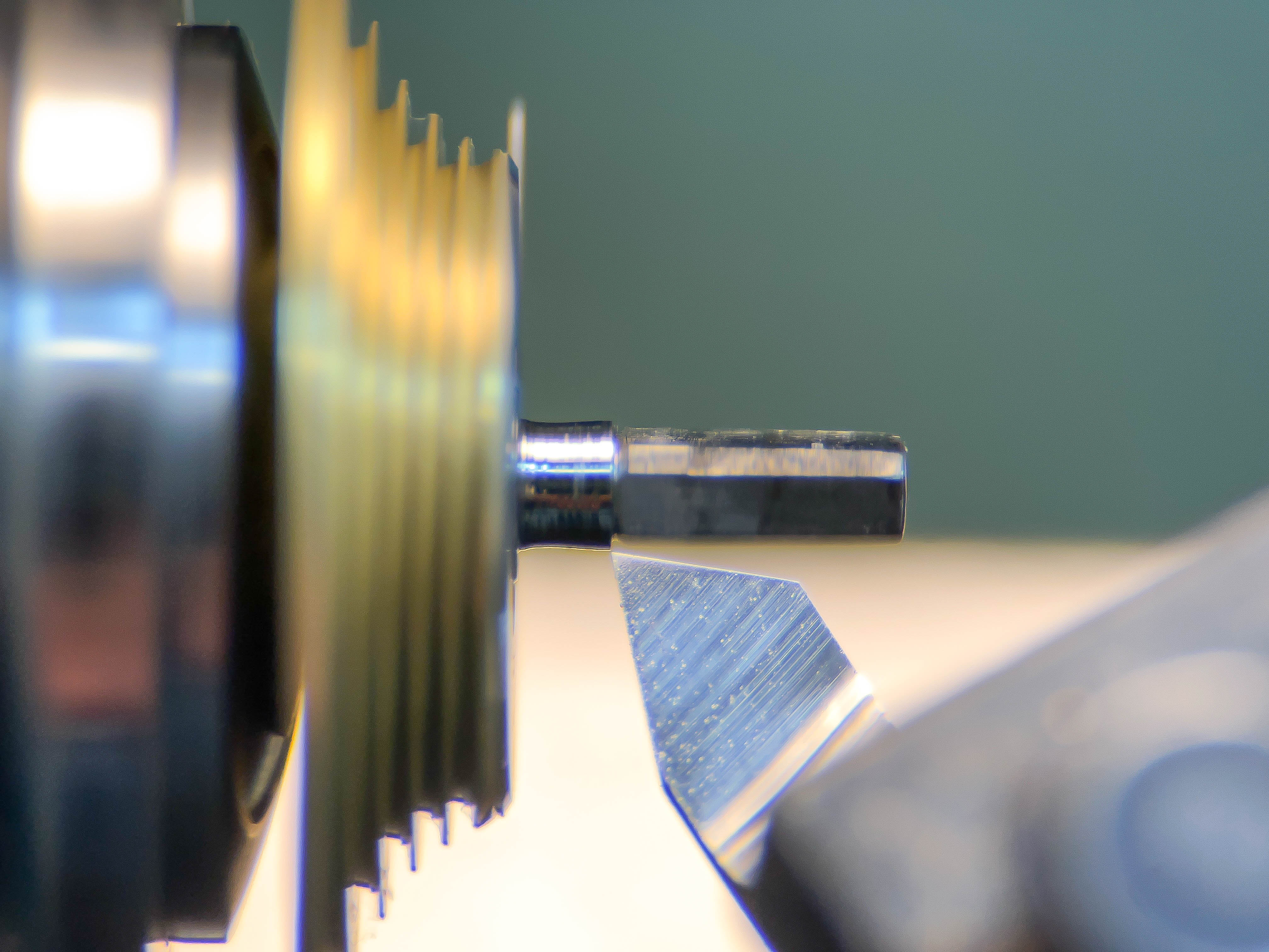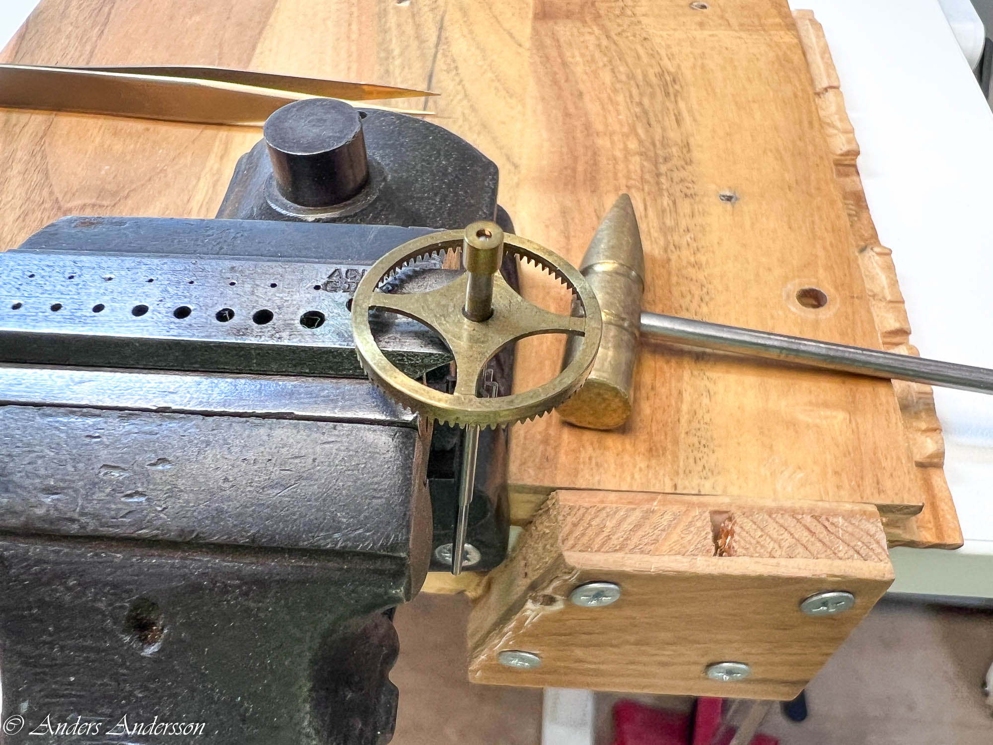 Sätter in nya stenar. Testar med detta först. Hade jag haft ett nytt gånghjul hade jag naturligtvis bytt det, men jag letade hos leverantörer och på nätet men hittade inget. Om inte tandtopparna redan varit ”grejade” med hade jag kunnat polerat topparna. Då sätter man upp hjulet i svarven och sätter en fin polerskiva mot topparna. Med hjälp av delningsskivan flyttar man fram tand för tand och polerar topparna en efter en. Det skulle varit ett sista alternativ om inte klockan skulle gå bra och balansen svänga med bra amplitud. Men det visade sig senare att den ändå fungerade ok så jag lämnade hjulet så här.
