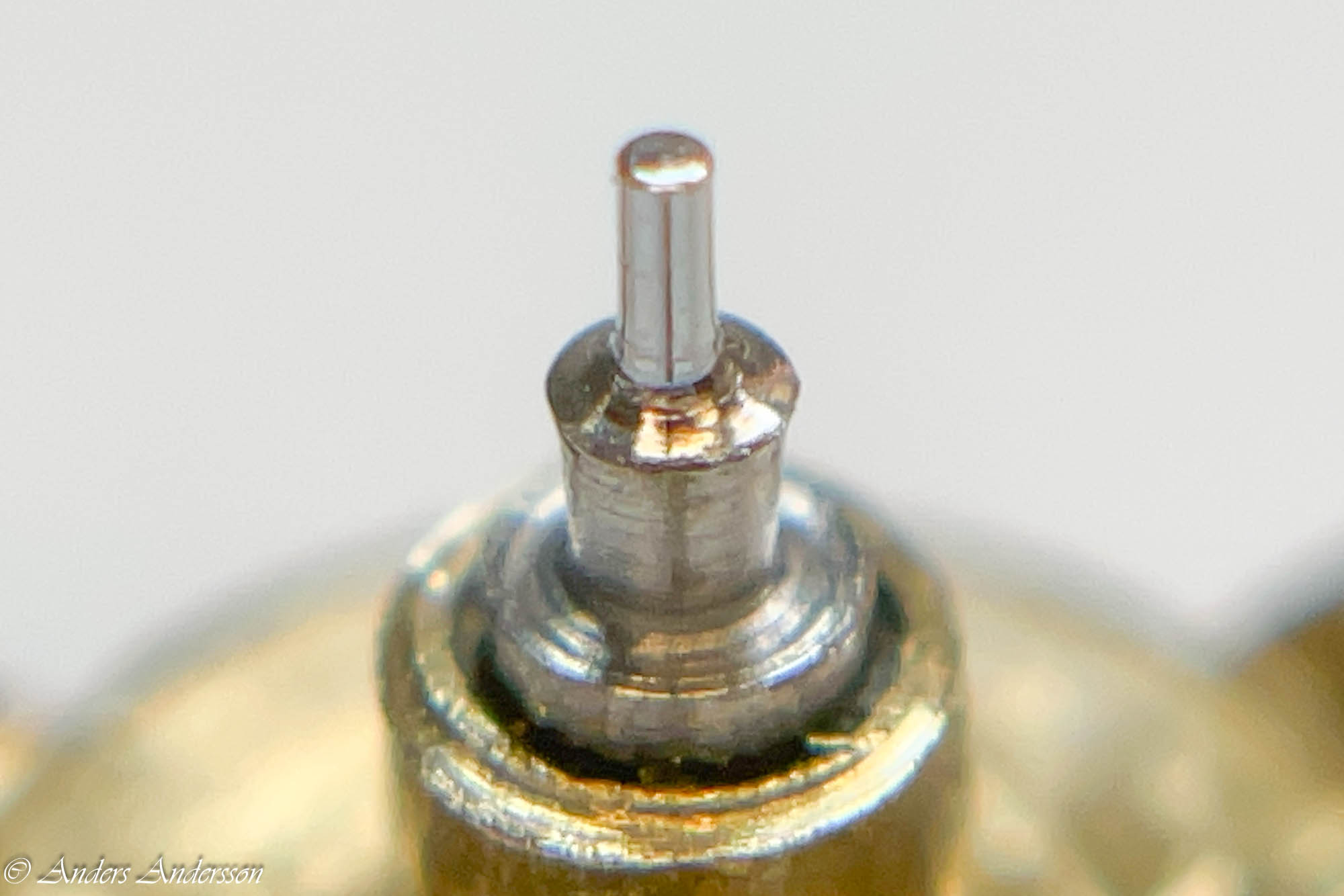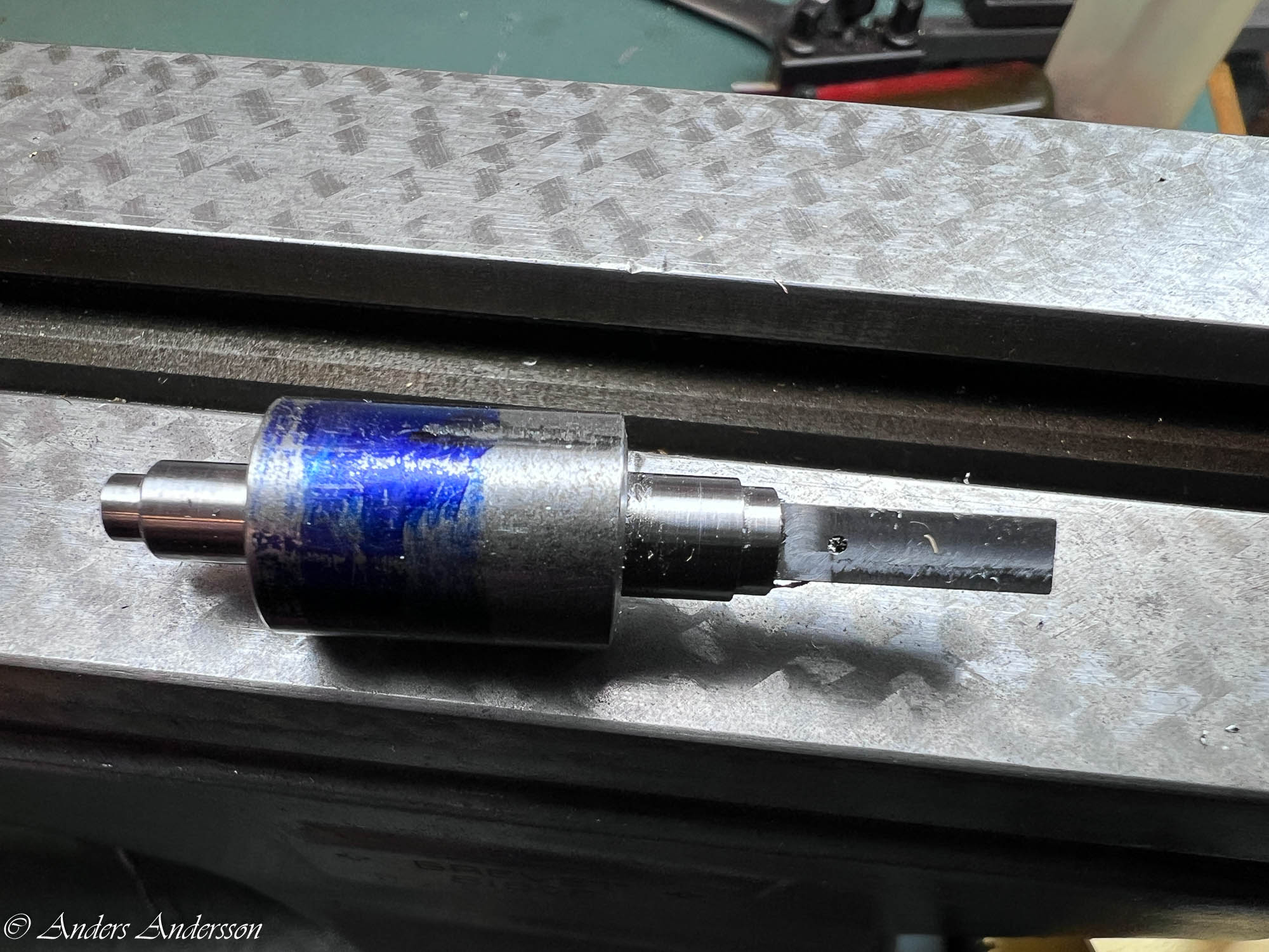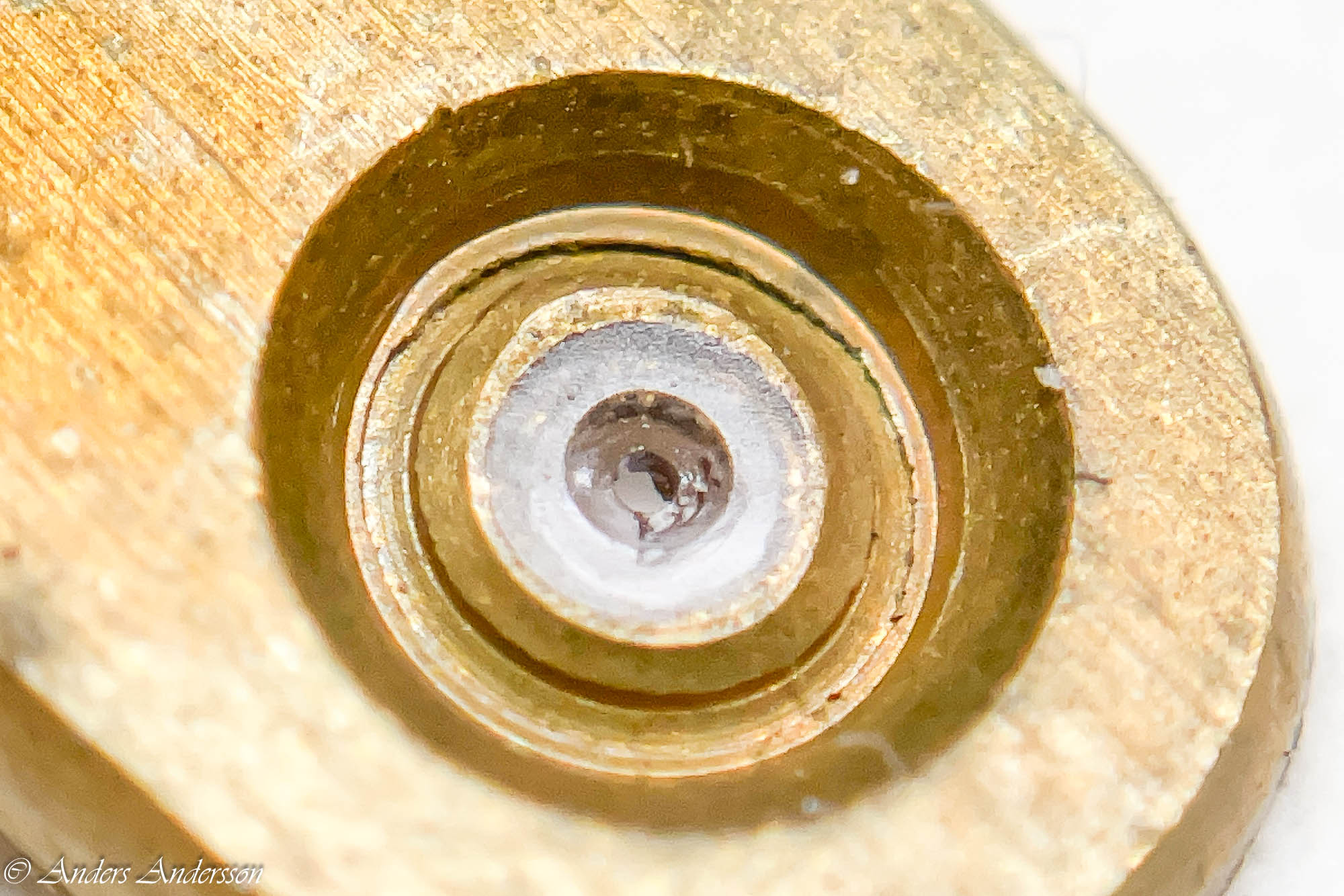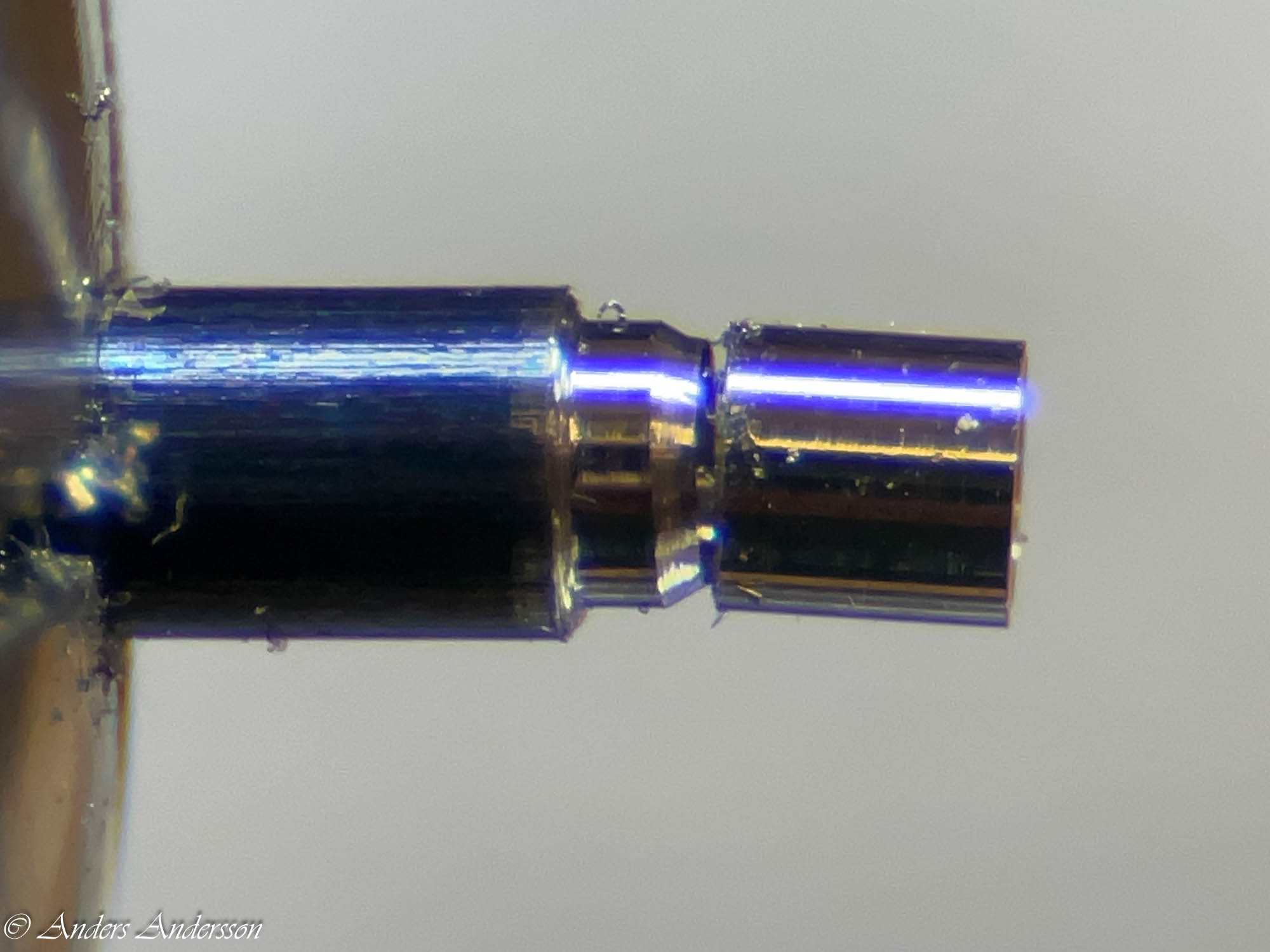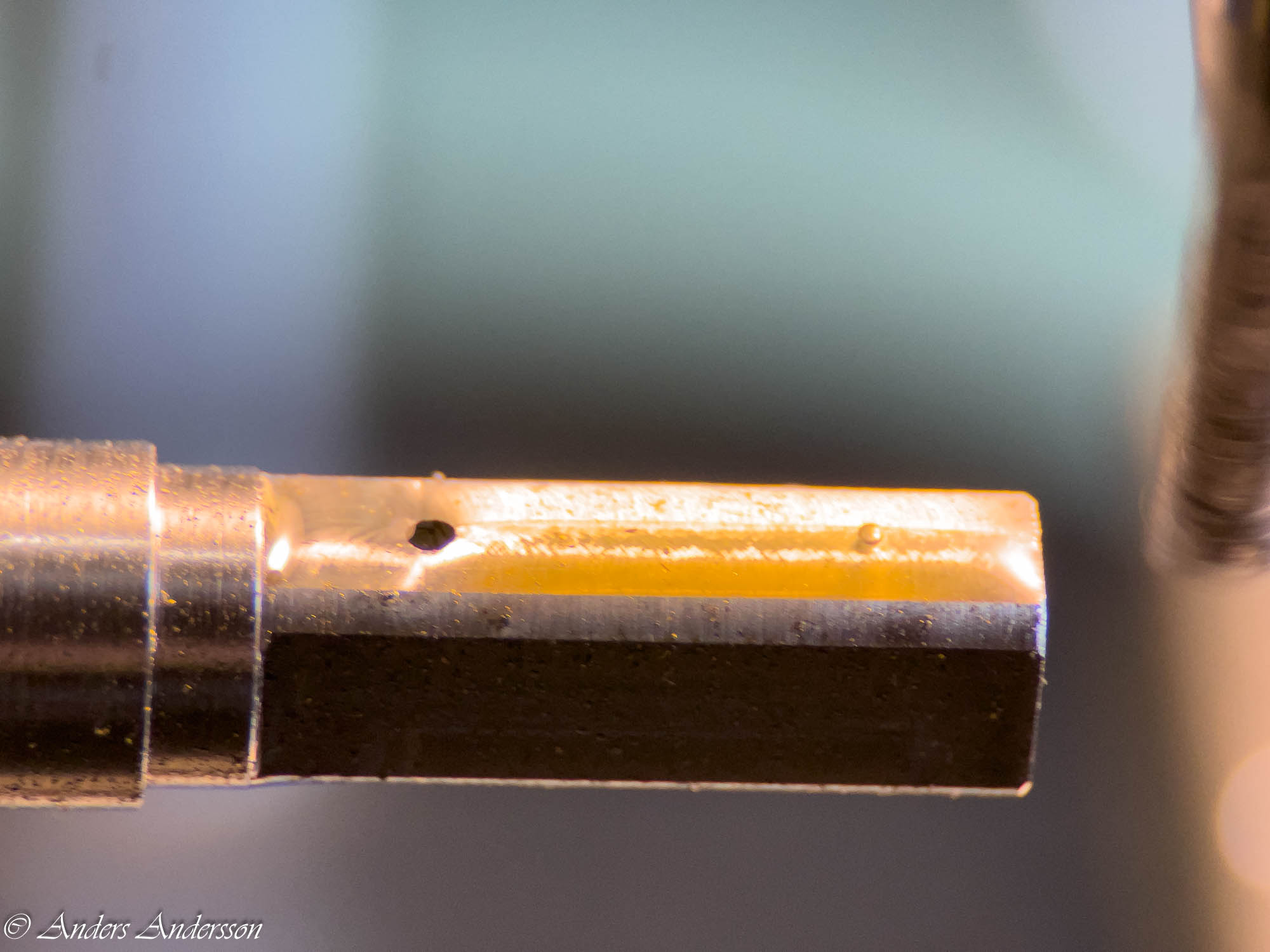 Jo änden på fjäderhuskärnan var slarvigt avstucken från fabriken så en liten tapp stack ut ca 0,5 mm på undersidan. Man kan ana den efter att jag slipat och polerat änden. Med denna korrigeringen går det lätt och fint att sätta in och ta ut fjäderhuset, kärnan har marginal mot botten och poleringen gör att inga ytterligare märken skapas.