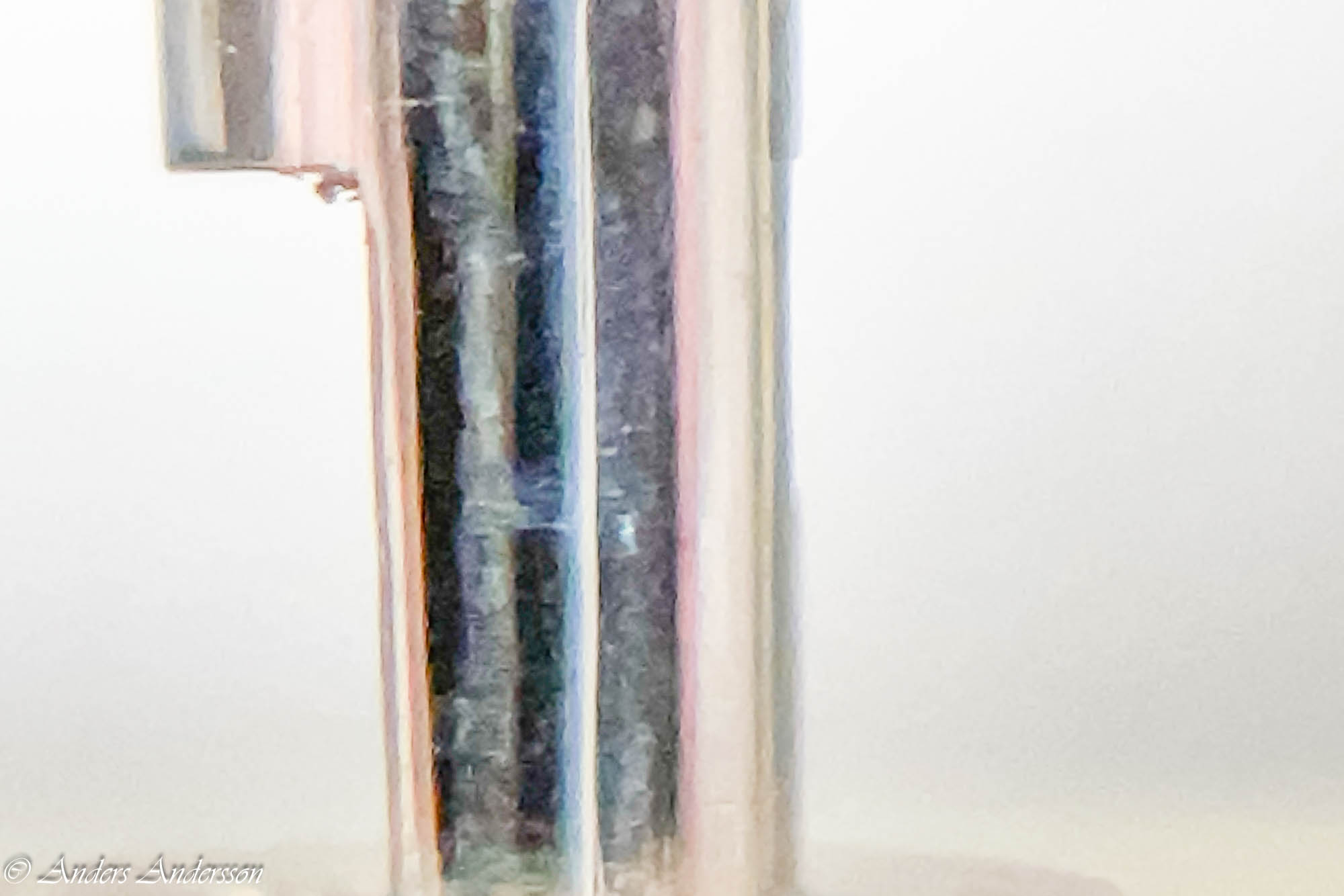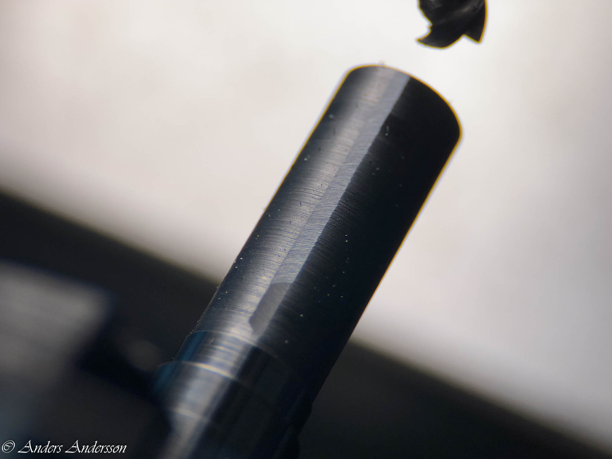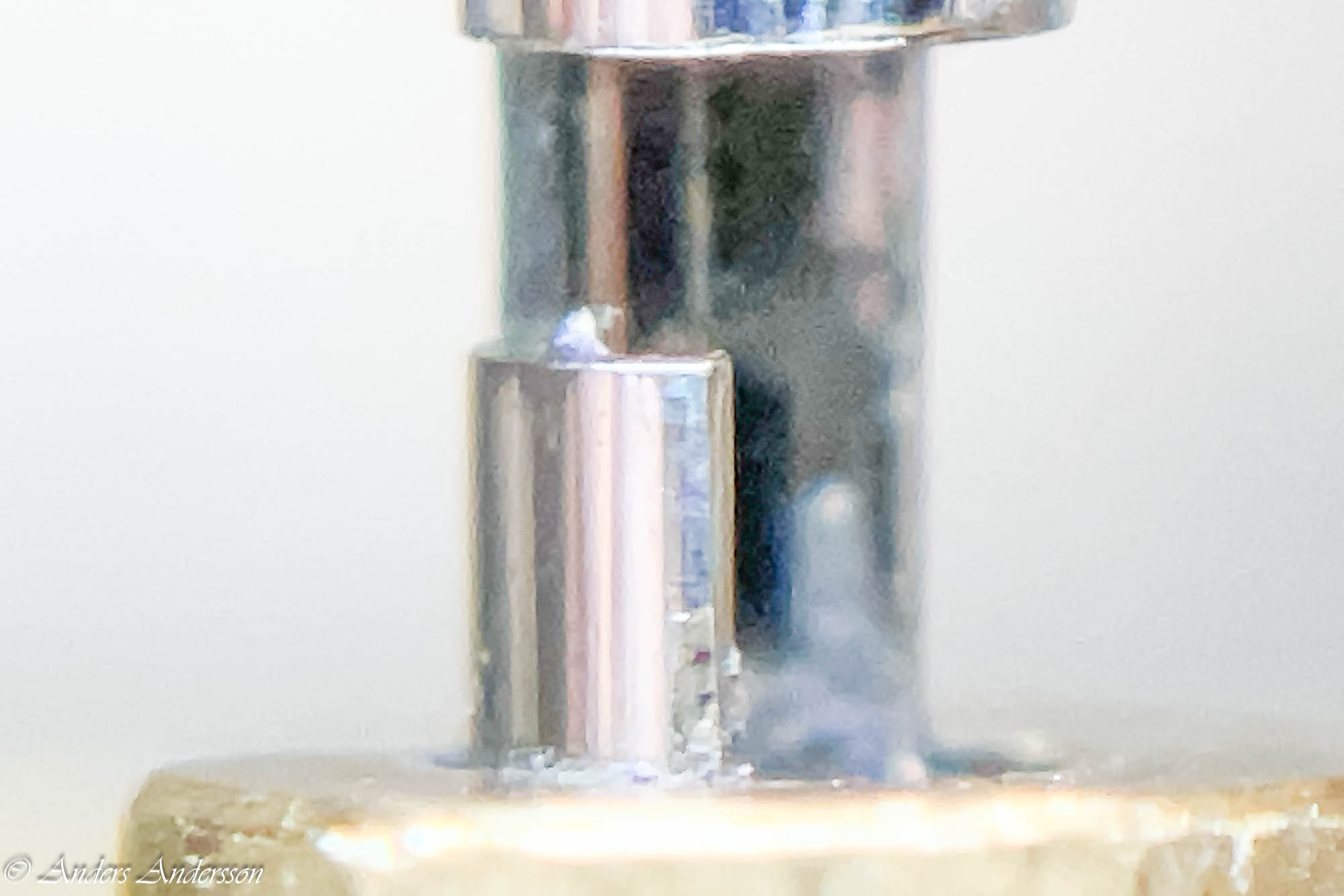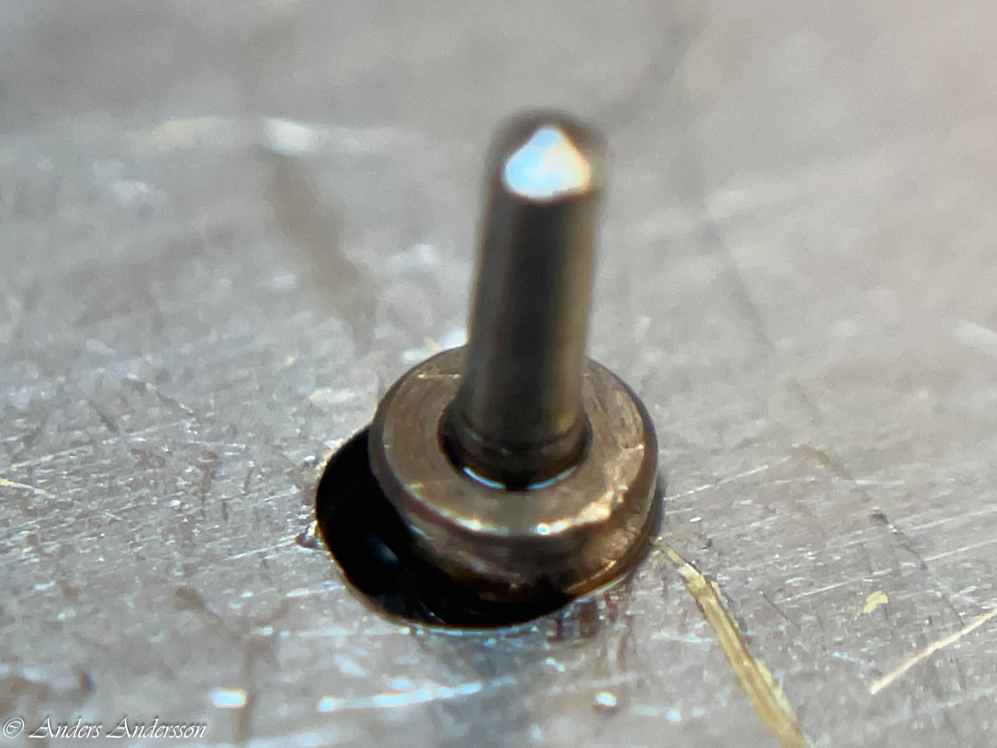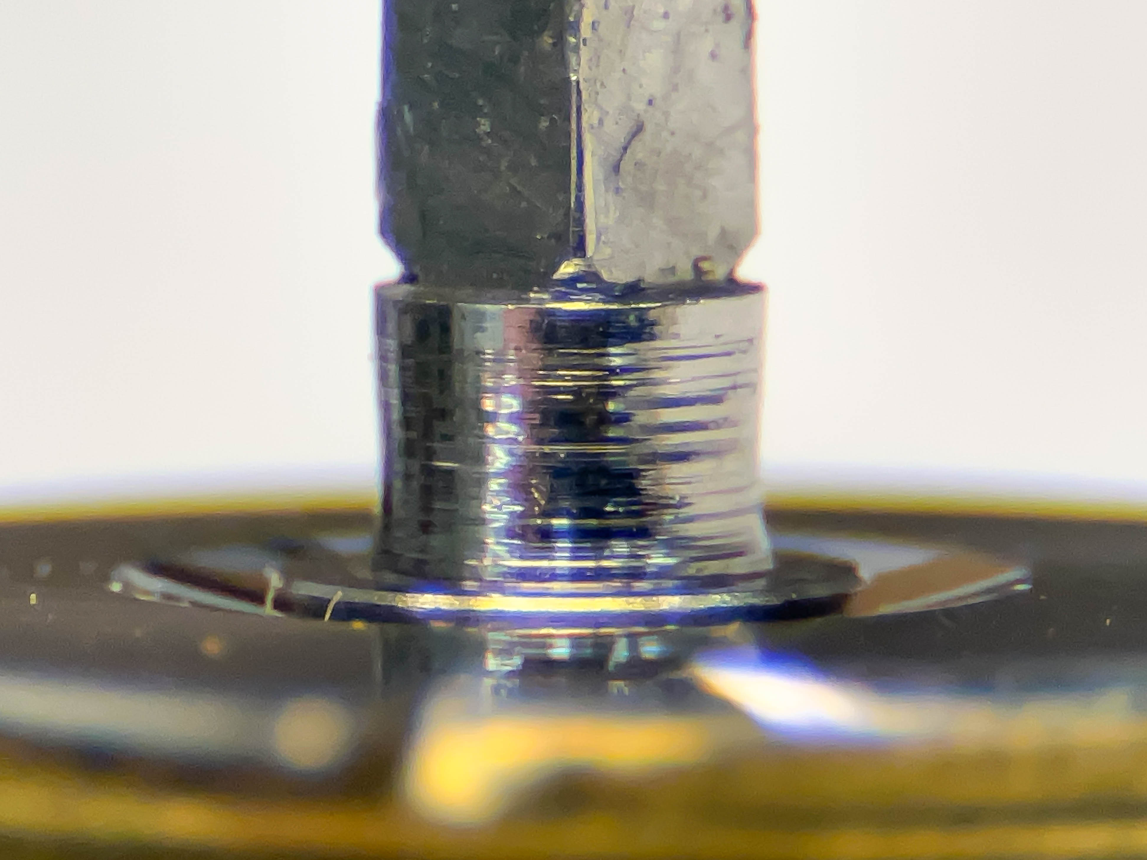 Jo änden på fjäderhuskärnan var slarvigt avstucken från fabriken så en liten tapp stack ut ca 0,5 mm på undersidan. Man kan ana den efter att jag slipat och polerat änden. Med denna korrigeringen går det lätt och fint att sätta in och ta ut fjäderhuset, kärnan har marginal mot botten och poleringen gör att inga ytterligare märken skapas.