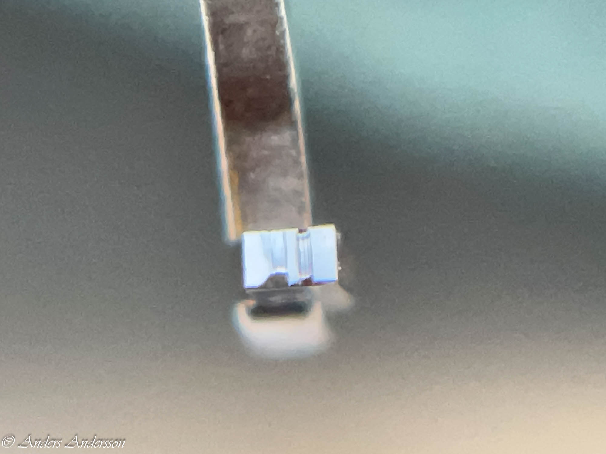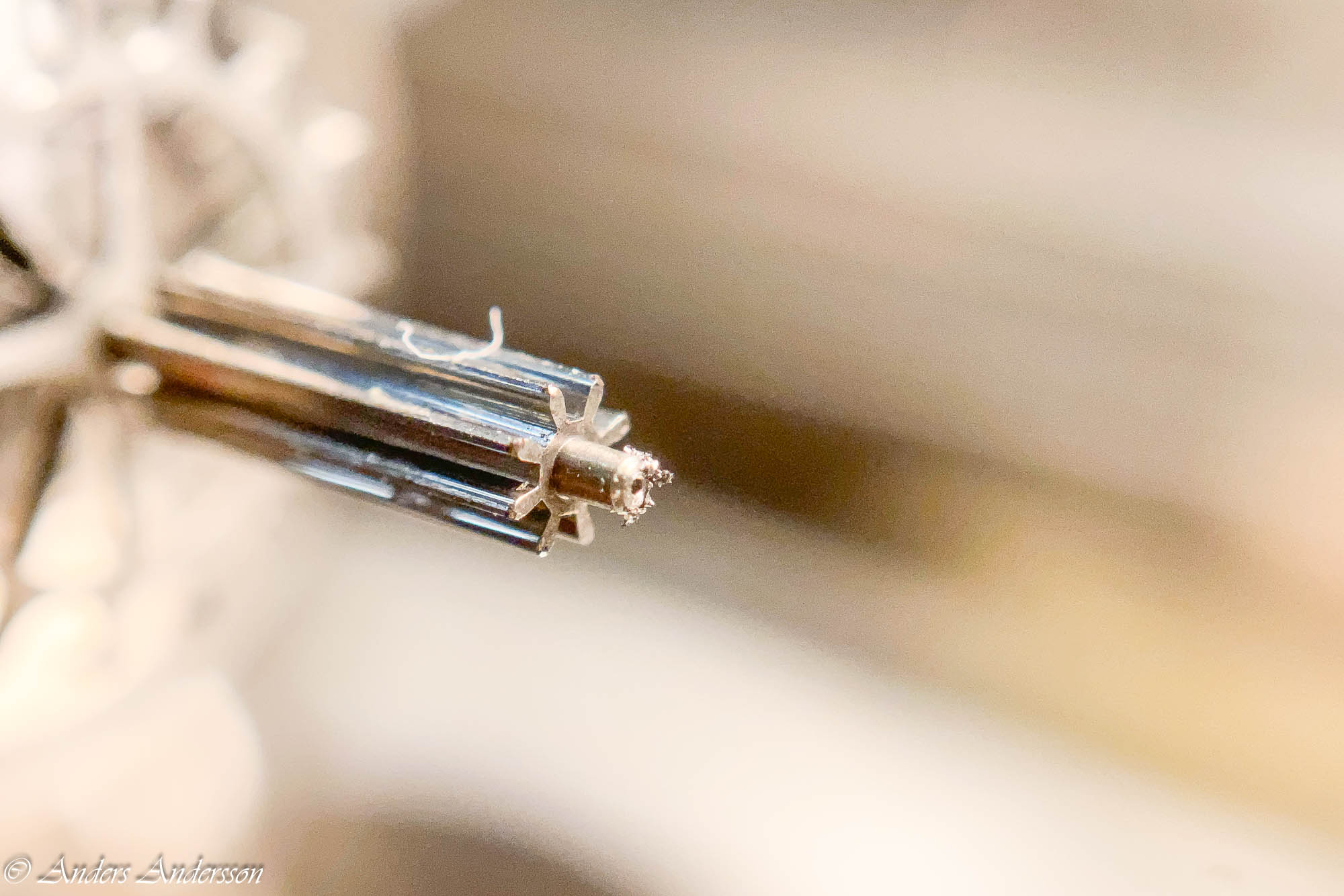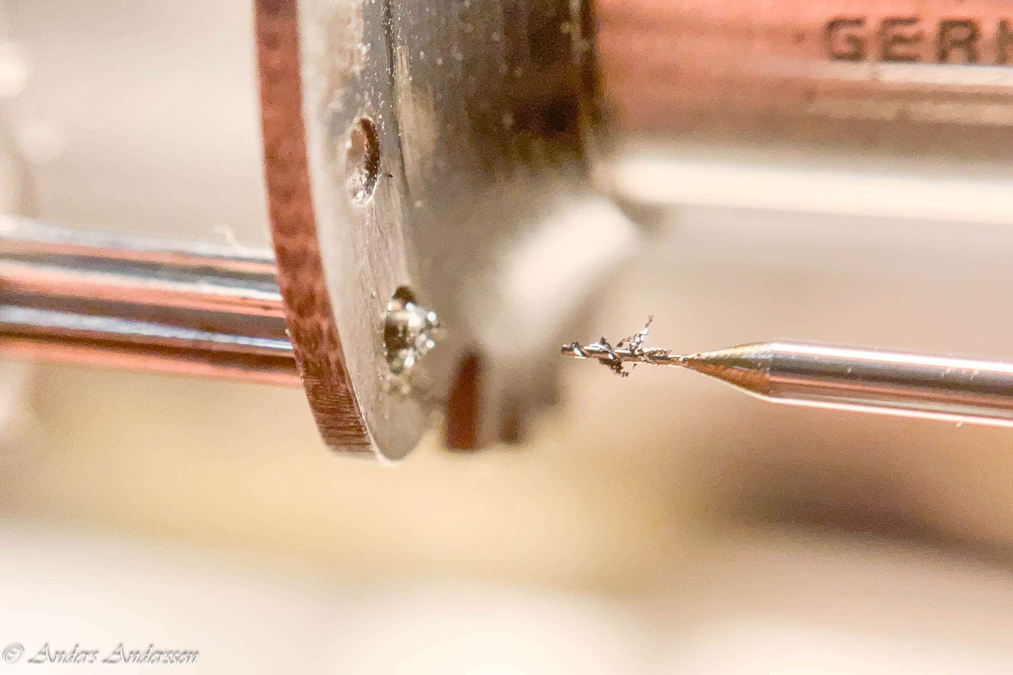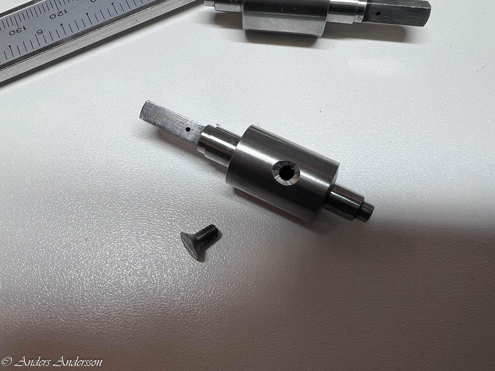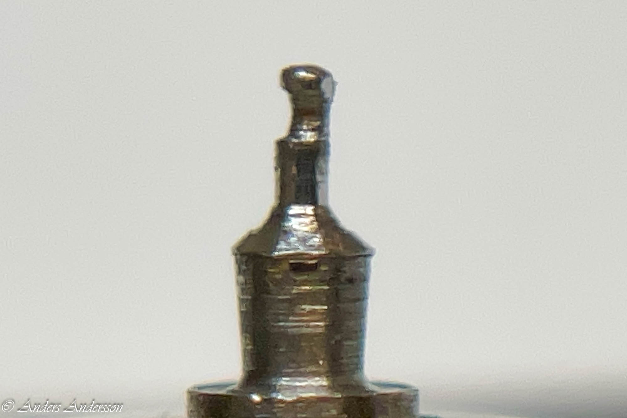 Jo änden på fjäderhuskärnan var slarvigt avstucken från fabriken så en liten tapp stack ut ca 0,5 mm på undersidan. Man kan ana den efter att jag slipat och polerat änden. Med denna korrigeringen går det lätt och fint att sätta in och ta ut fjäderhuset, kärnan har marginal mot botten och poleringen gör att inga ytterligare märken skapas.