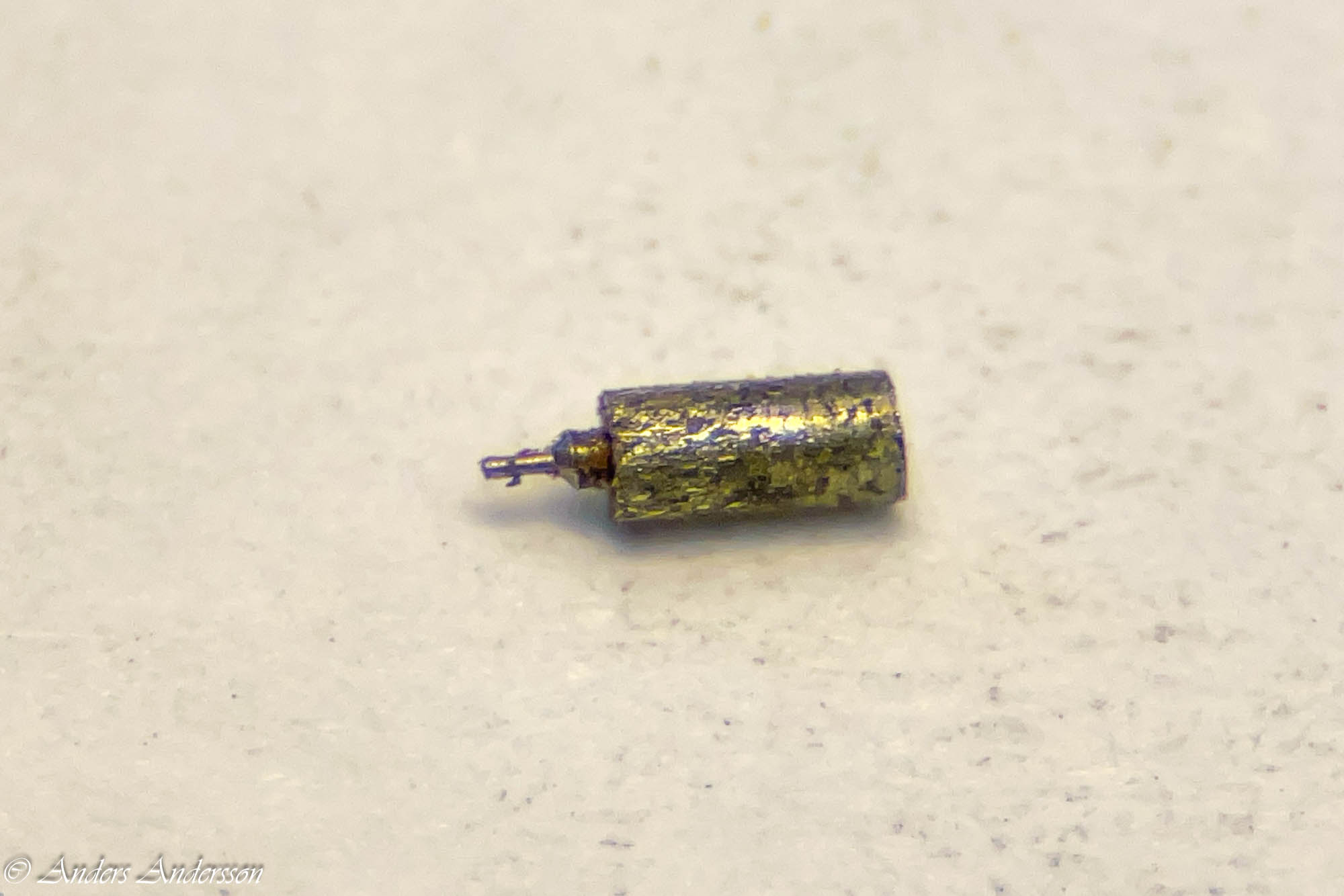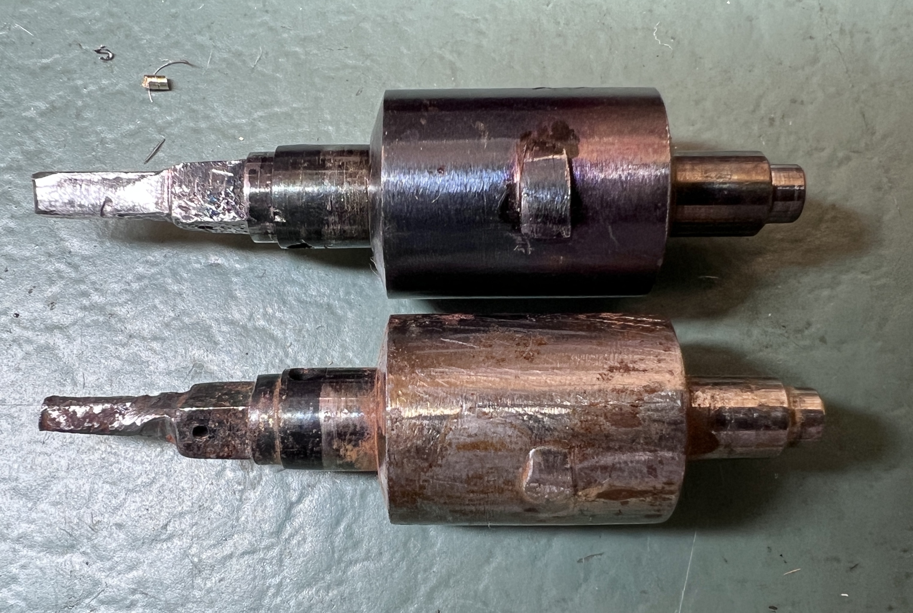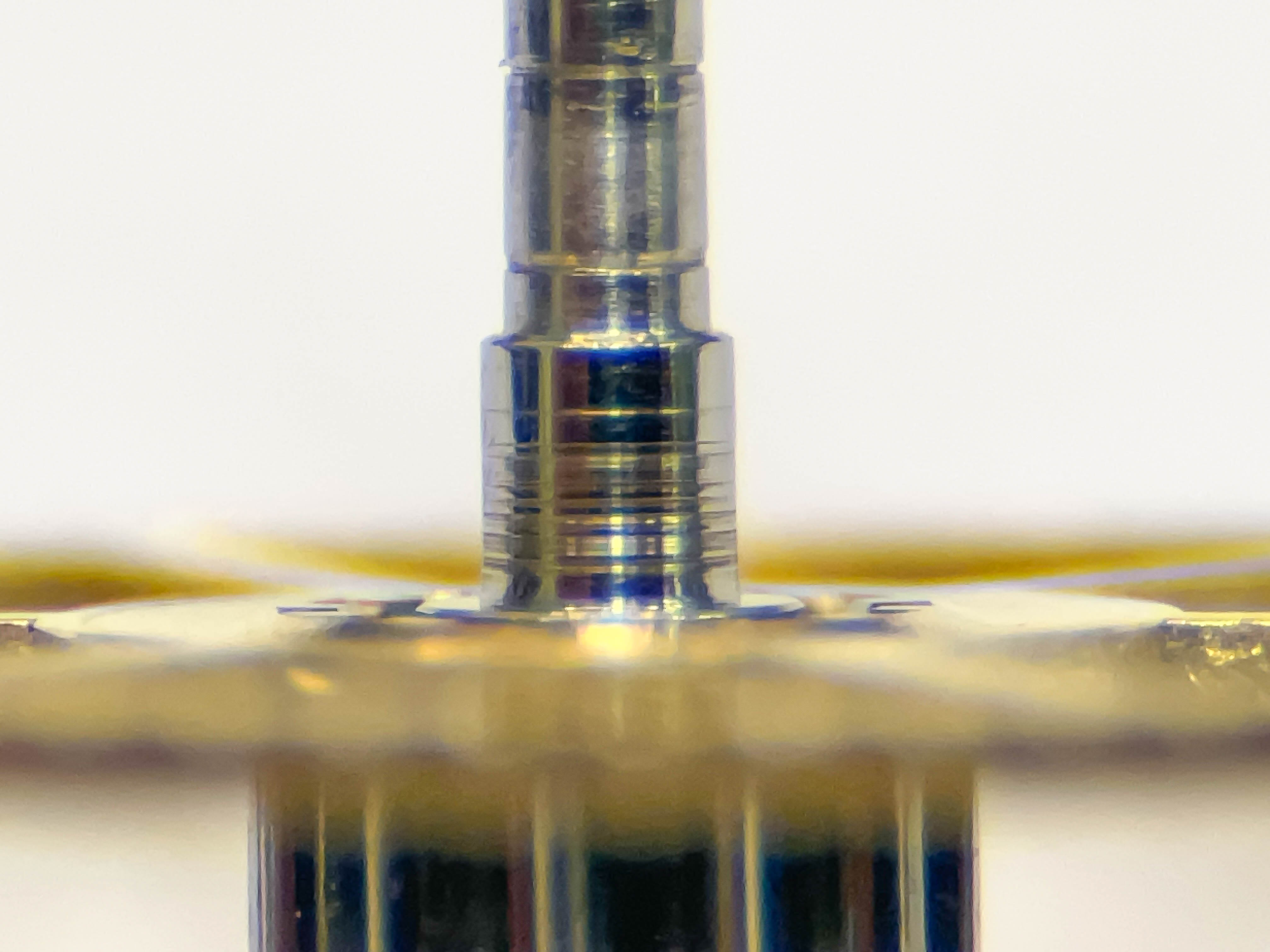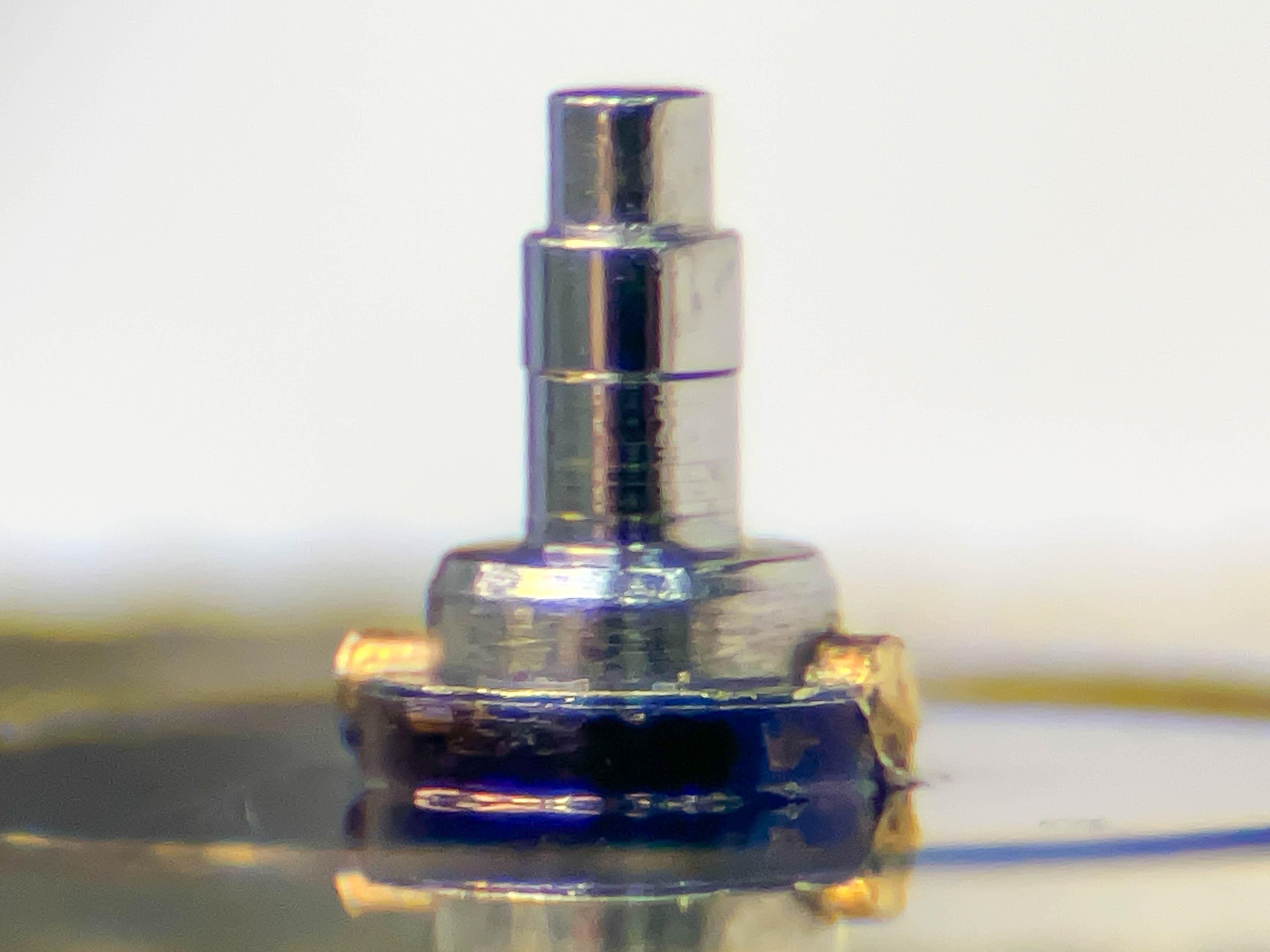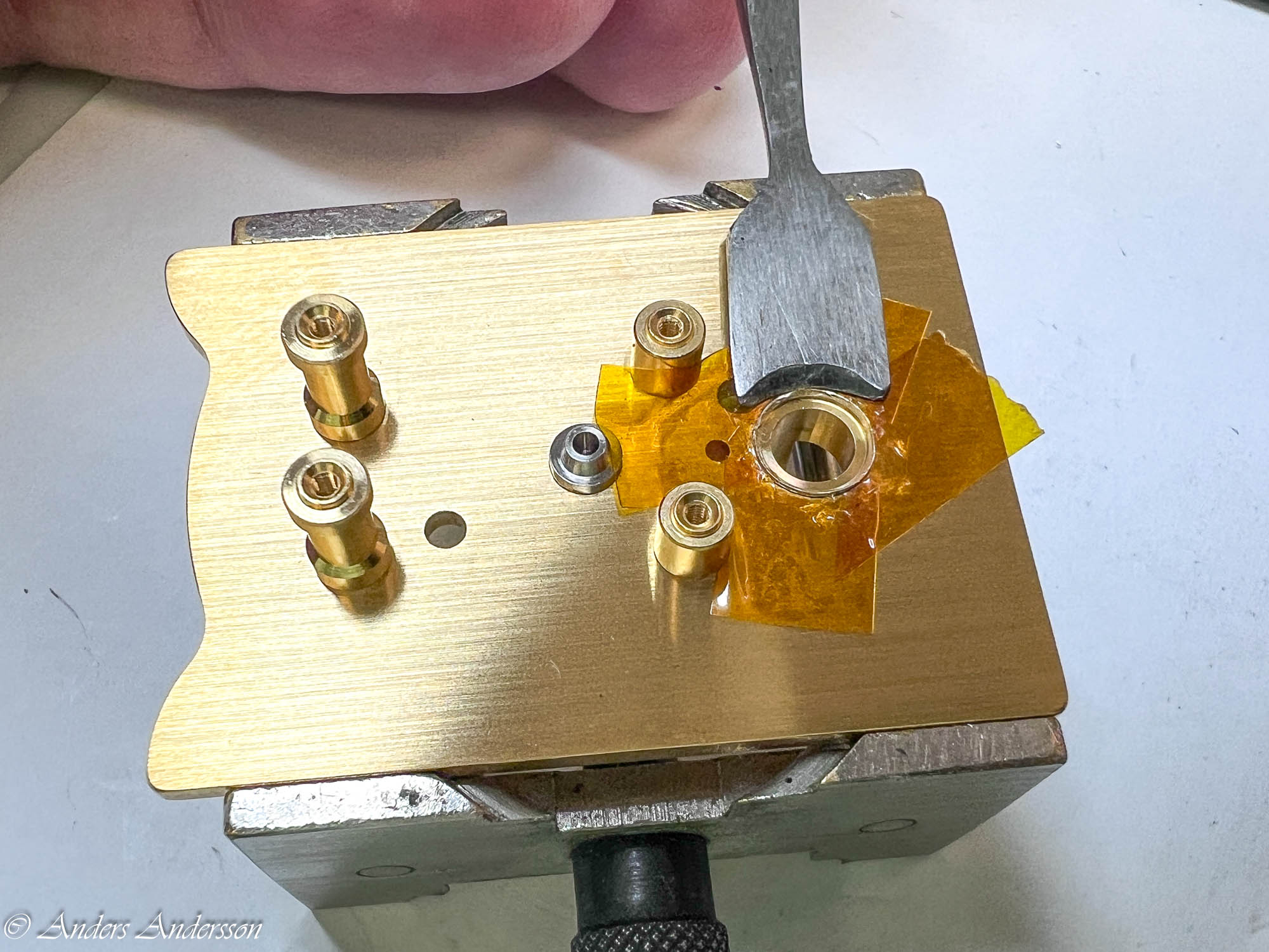 Jo änden på fjäderhuskärnan var slarvigt avstucken från fabriken så en liten tapp stack ut ca 0,5 mm på undersidan. Man kan ana den efter att jag slipat och polerat änden. Med denna korrigeringen går det lätt och fint att sätta in och ta ut fjäderhuset, kärnan har marginal mot botten och poleringen gör att inga ytterligare märken skapas.