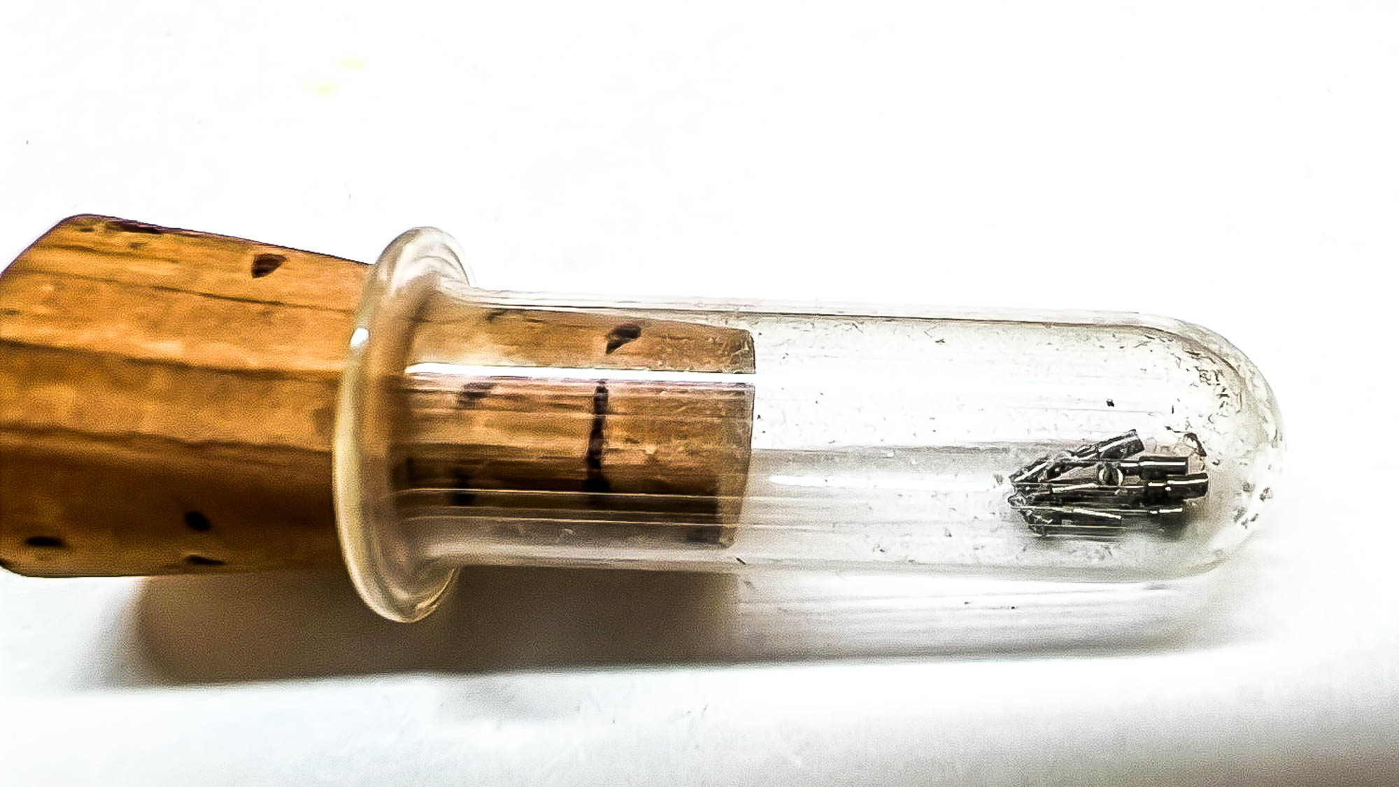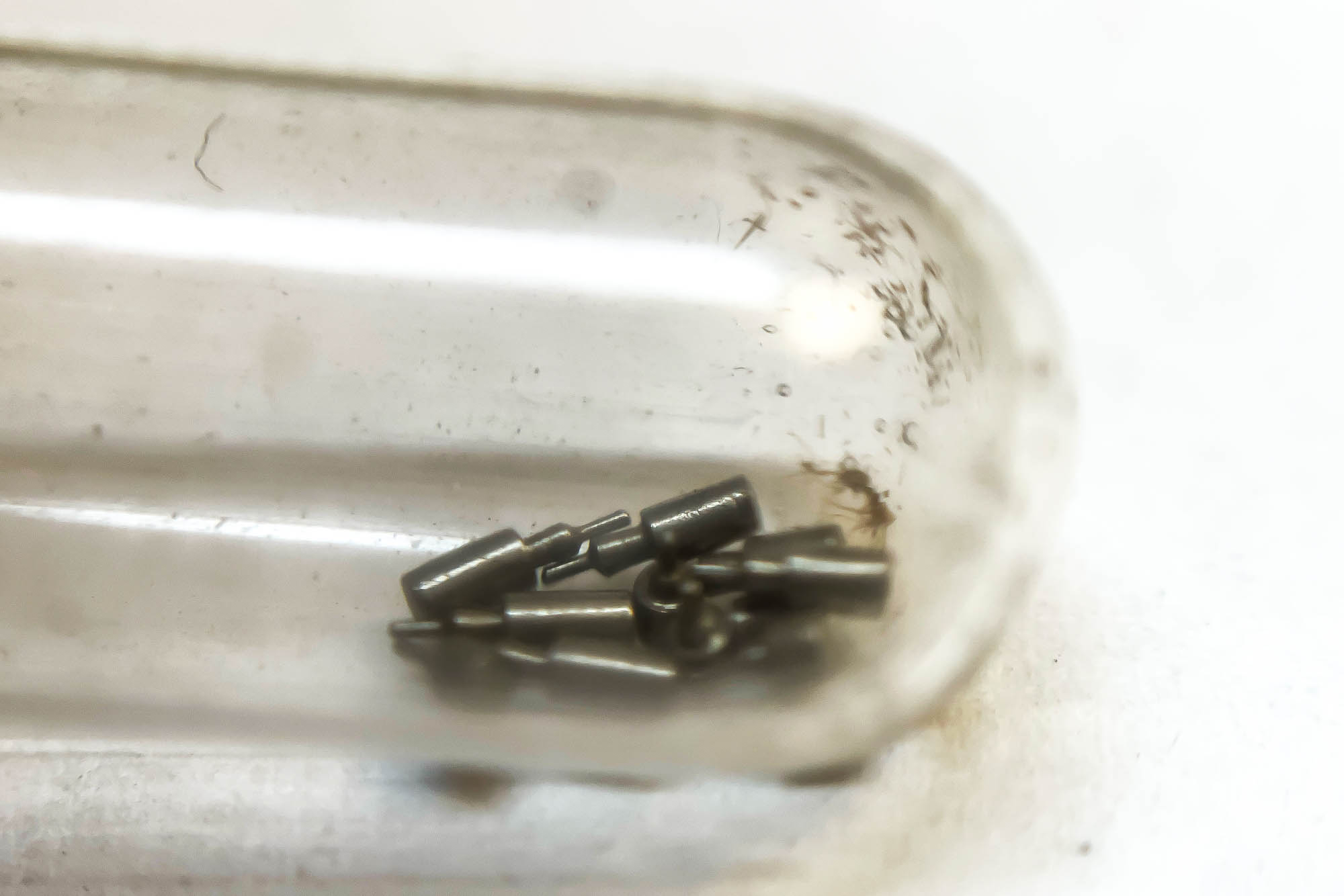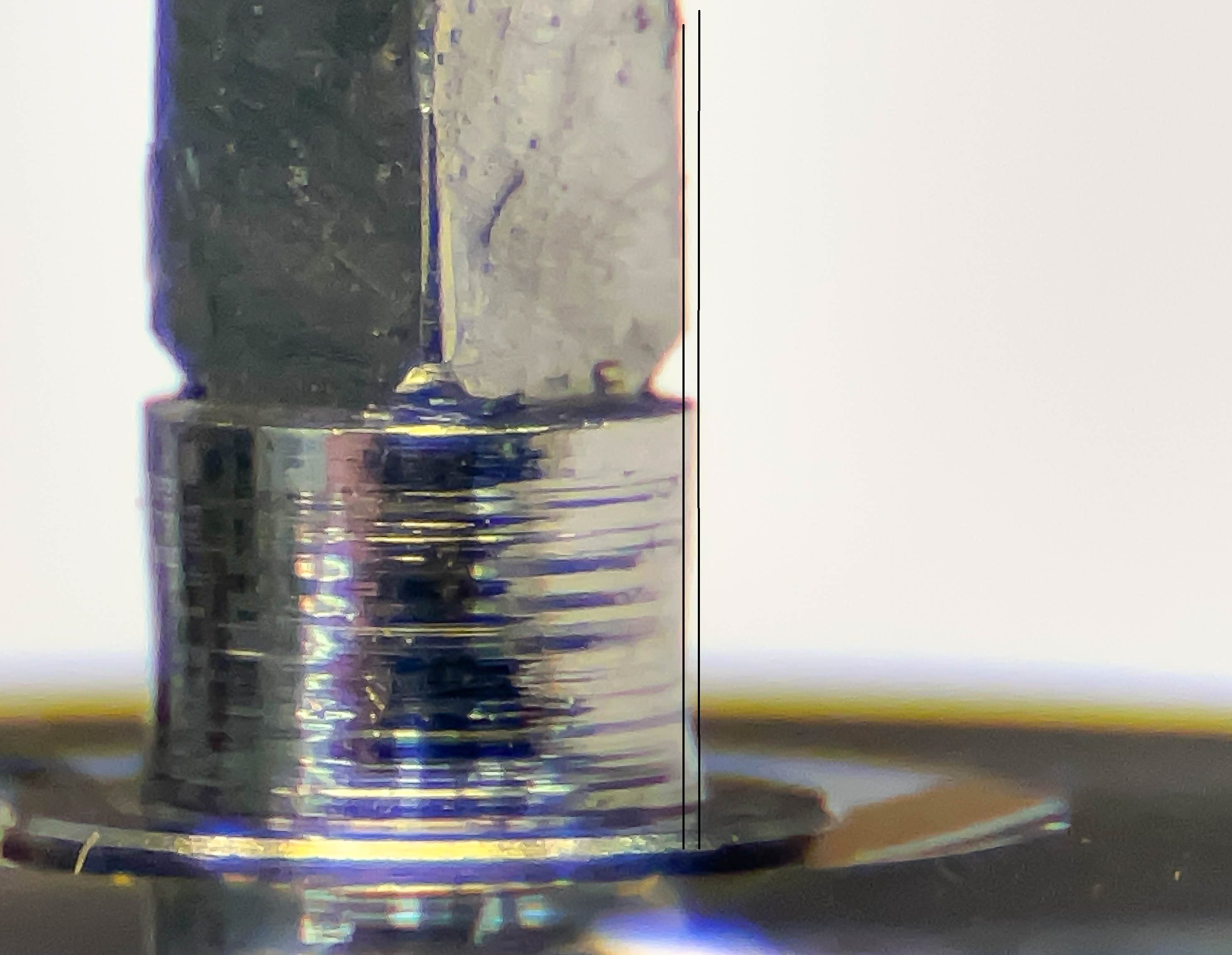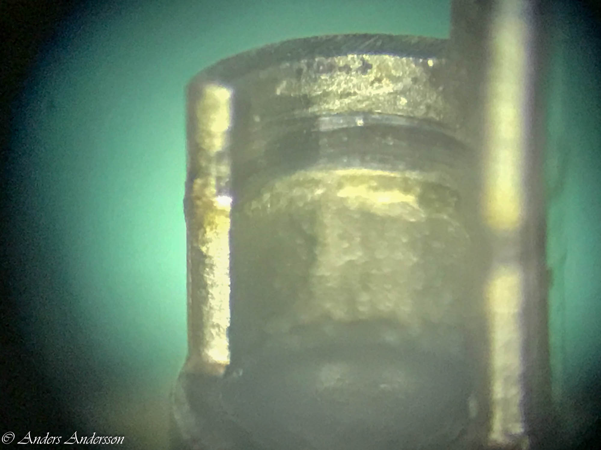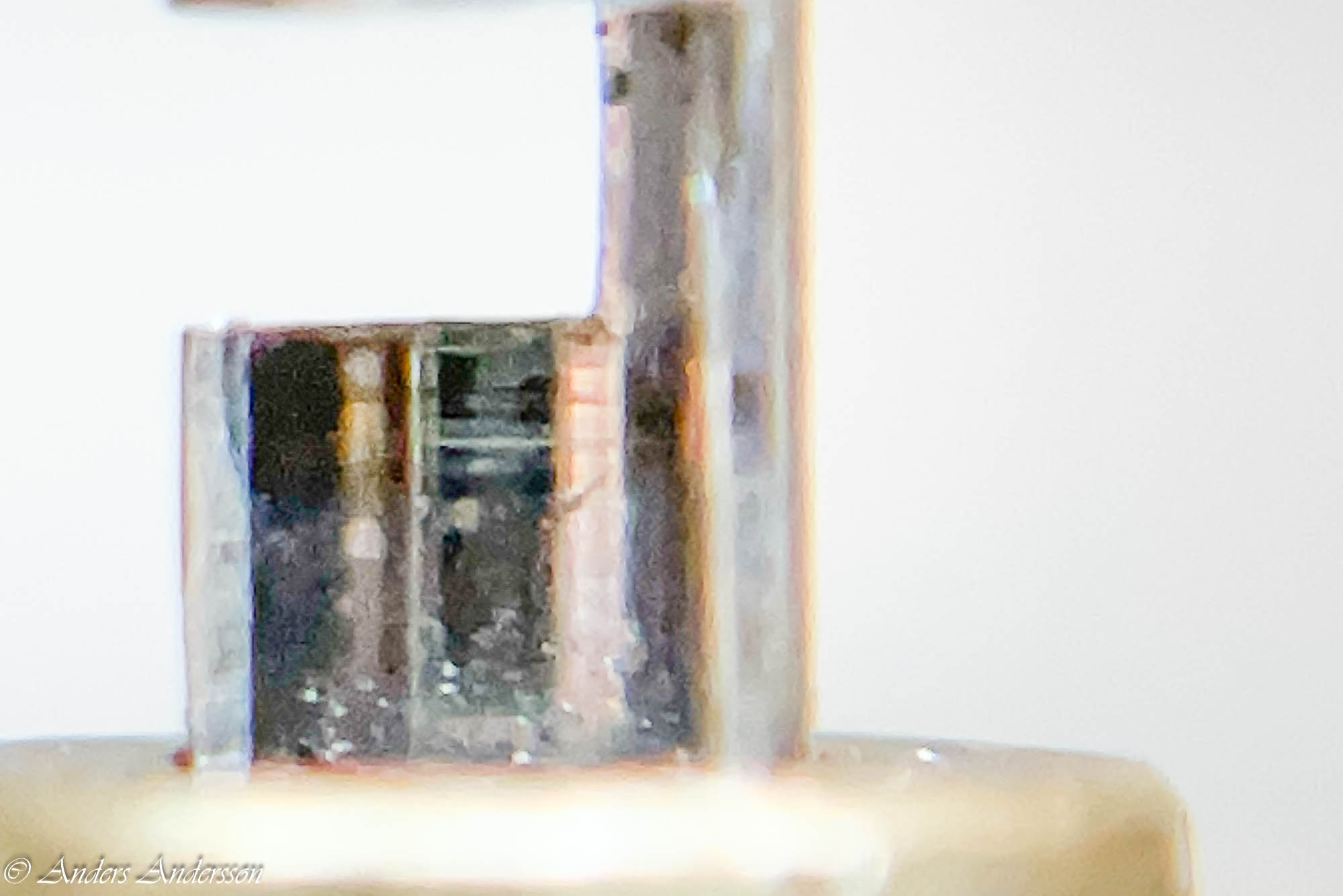 Jo änden på fjäderhuskärnan var slarvigt avstucken från fabriken så en liten tapp stack ut ca 0,5 mm på undersidan. Man kan ana den efter att jag slipat och polerat änden. Med denna korrigeringen går det lätt och fint att sätta in och ta ut fjäderhuset, kärnan har marginal mot botten och poleringen gör att inga ytterligare märken skapas.