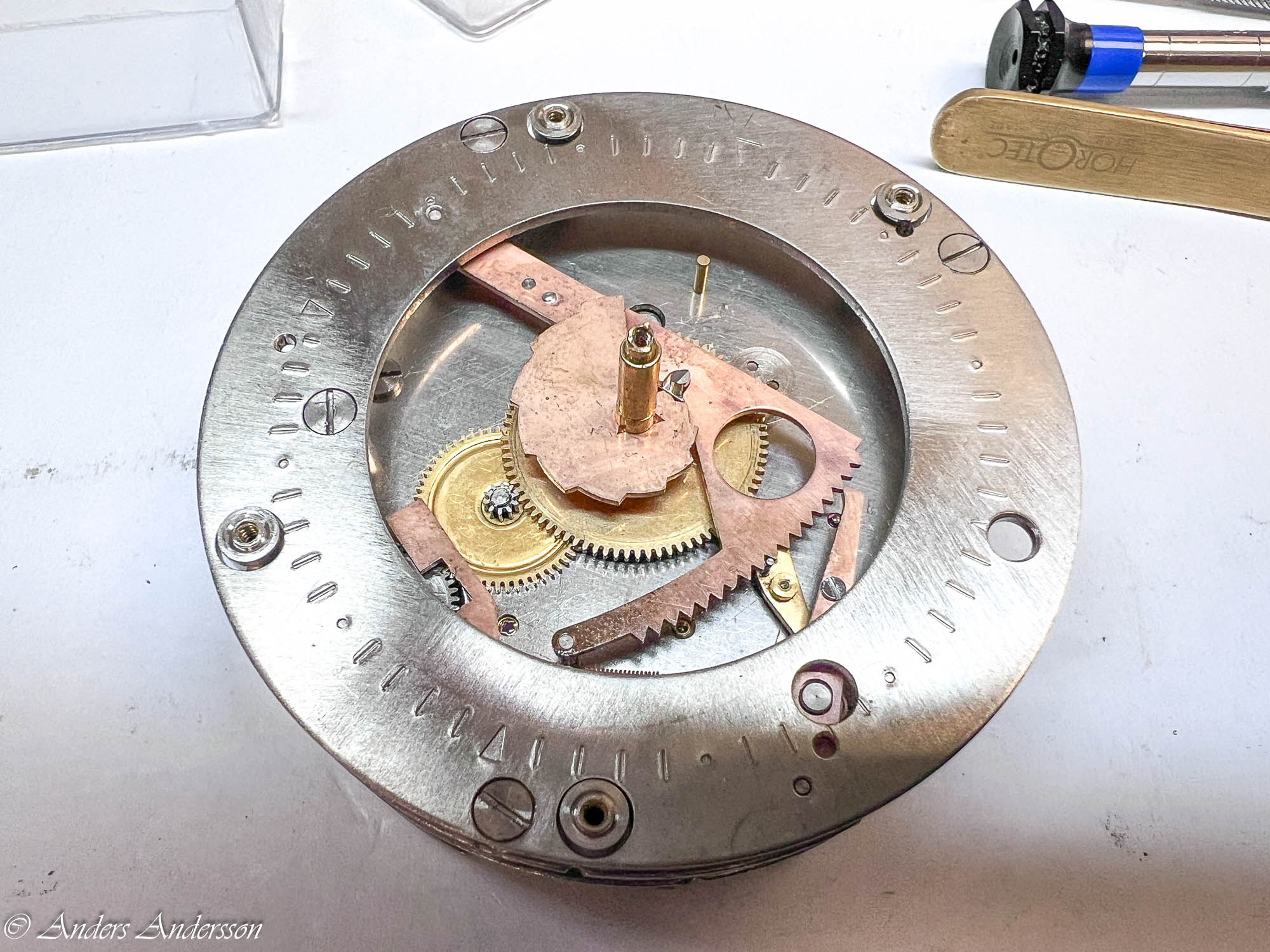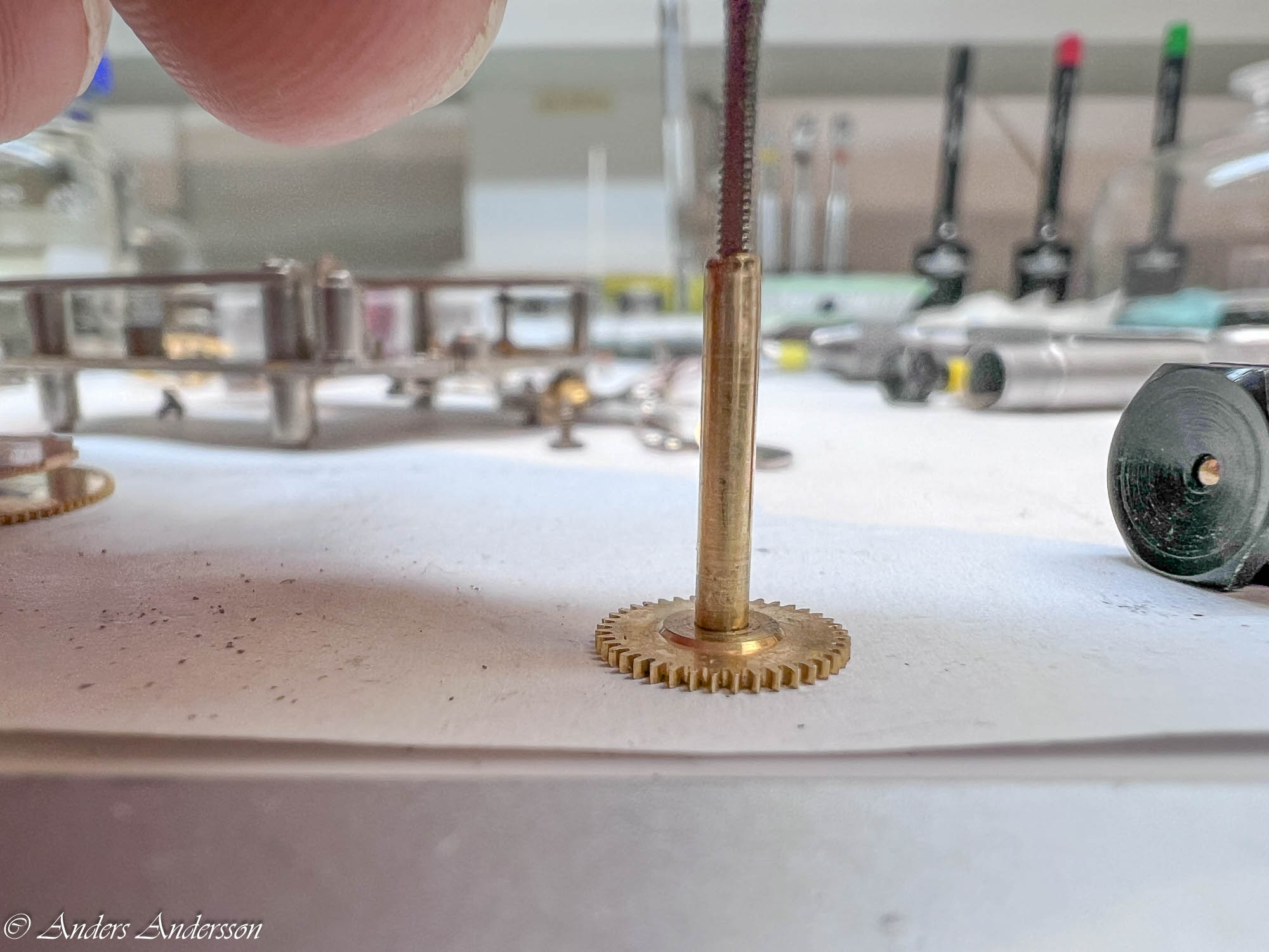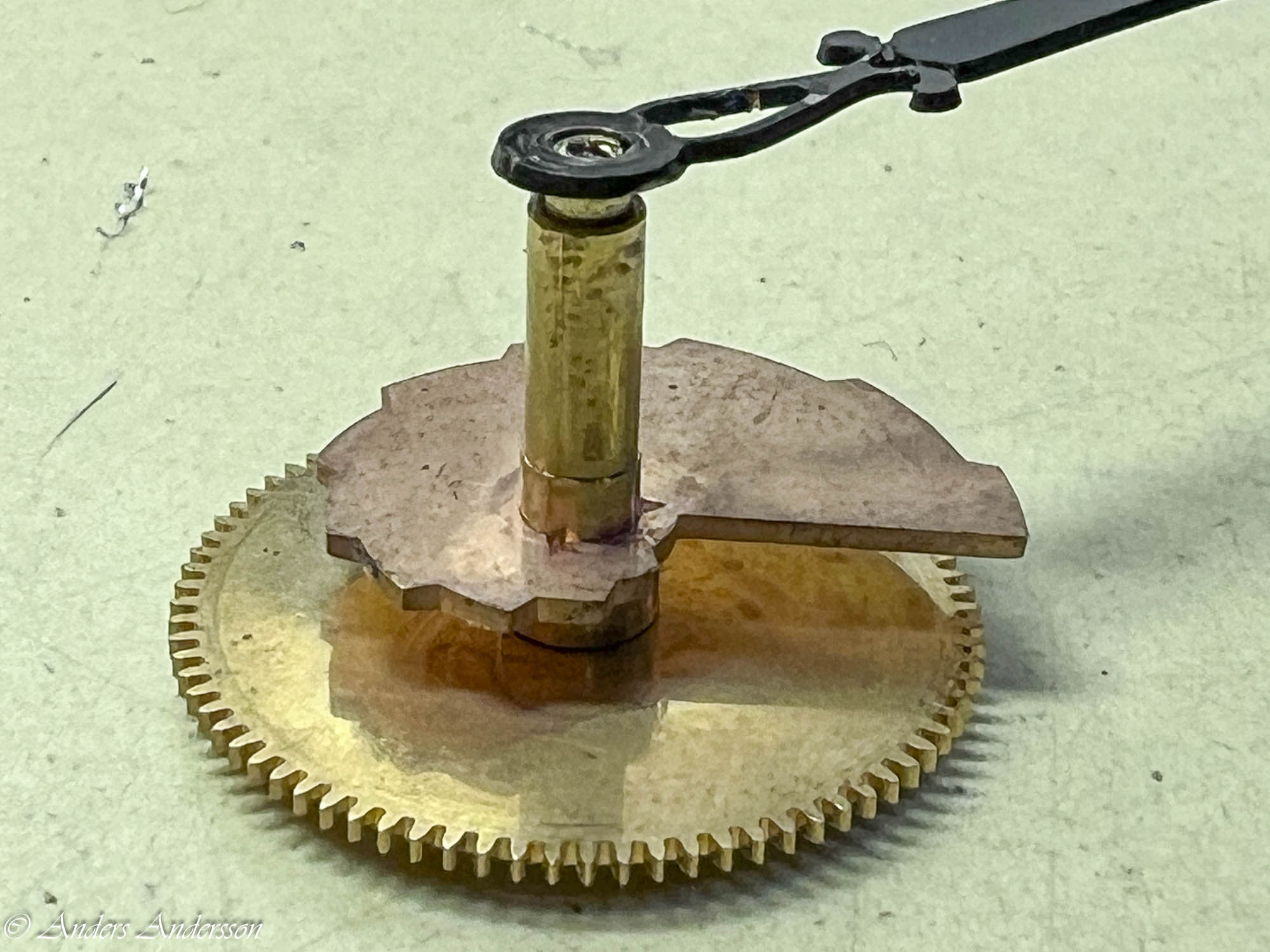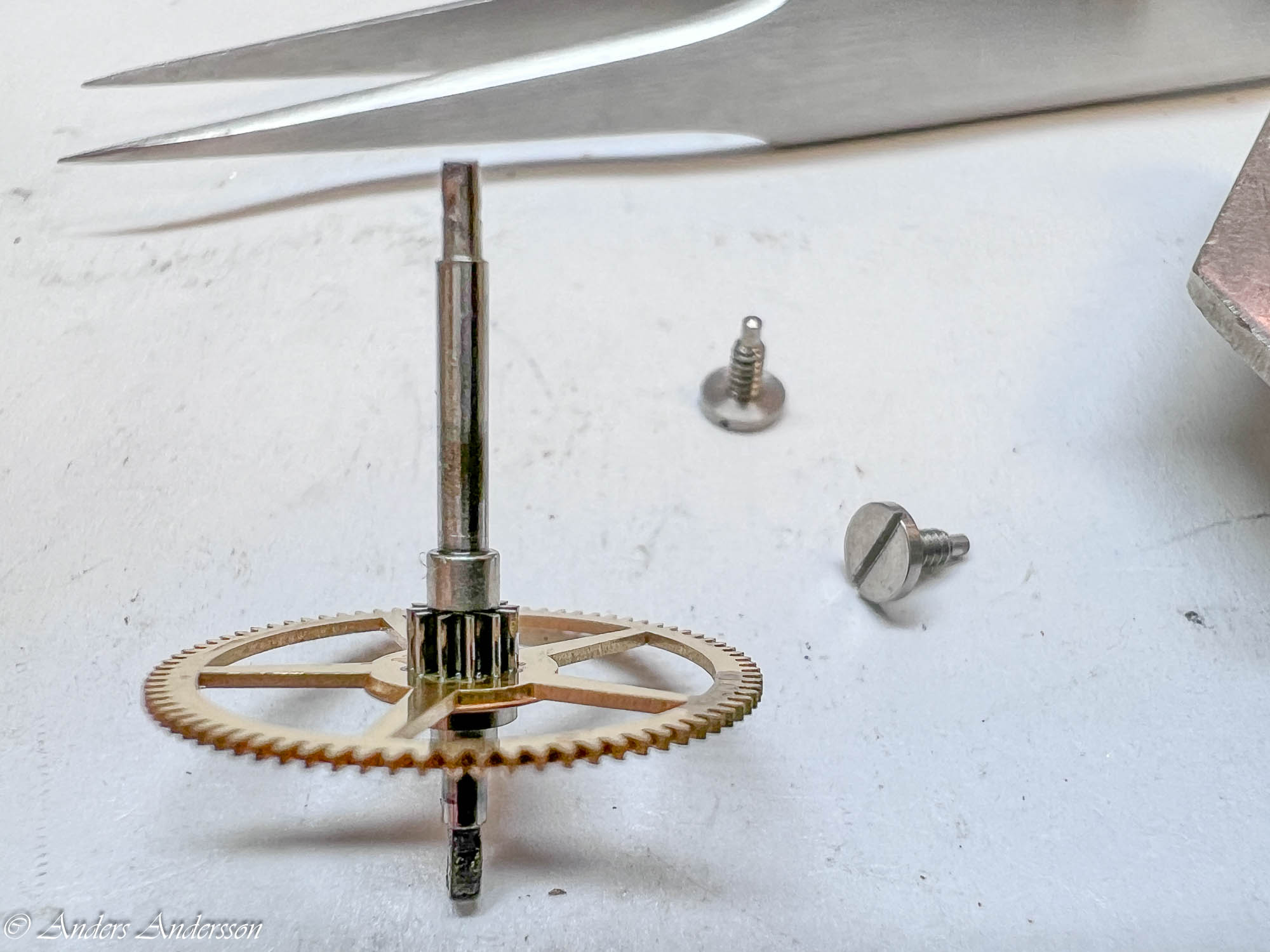Uppenbarligen har reparatören inte förstått att axeln för visarväxelhjulet INTE är gängad utan inpressad. Inget är dock så skadat att det stoppar funktionen.