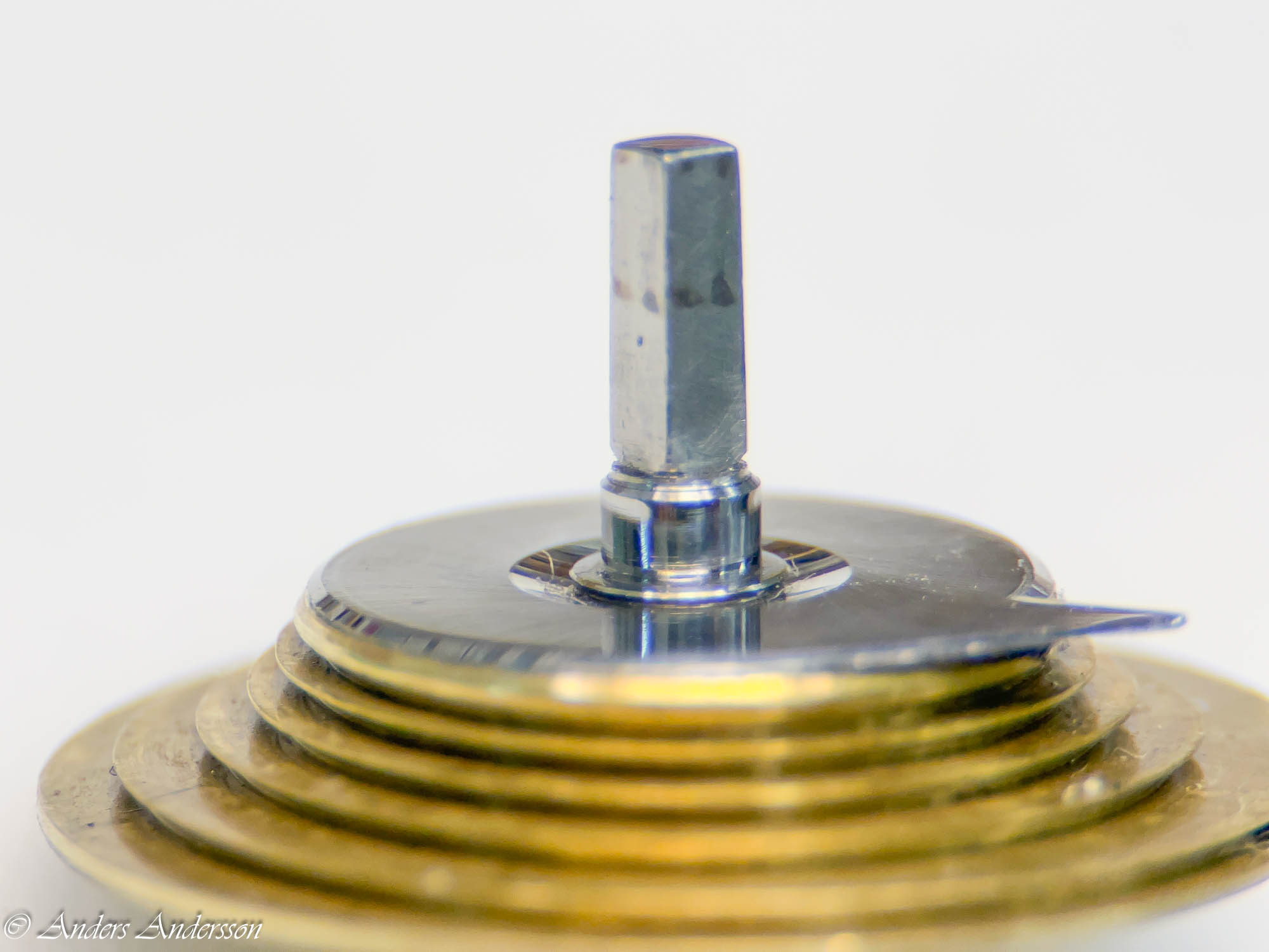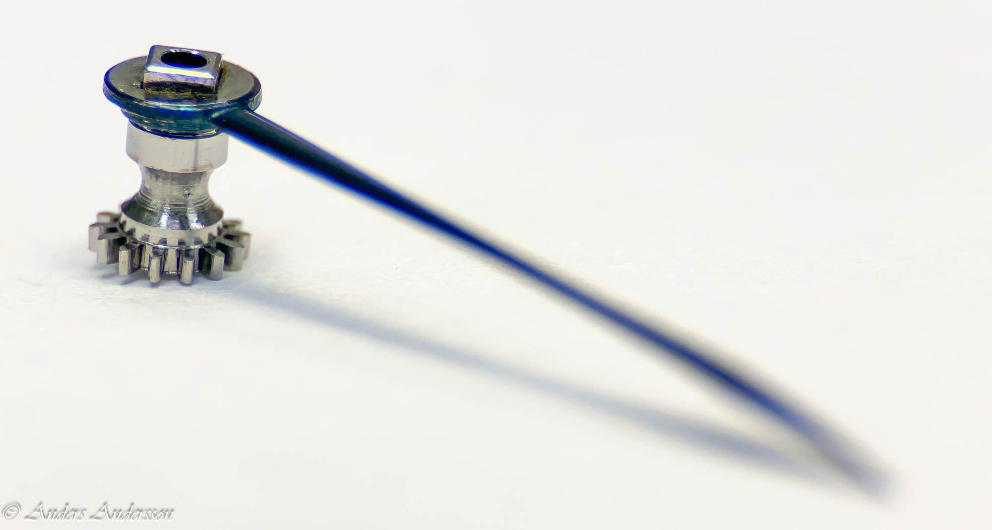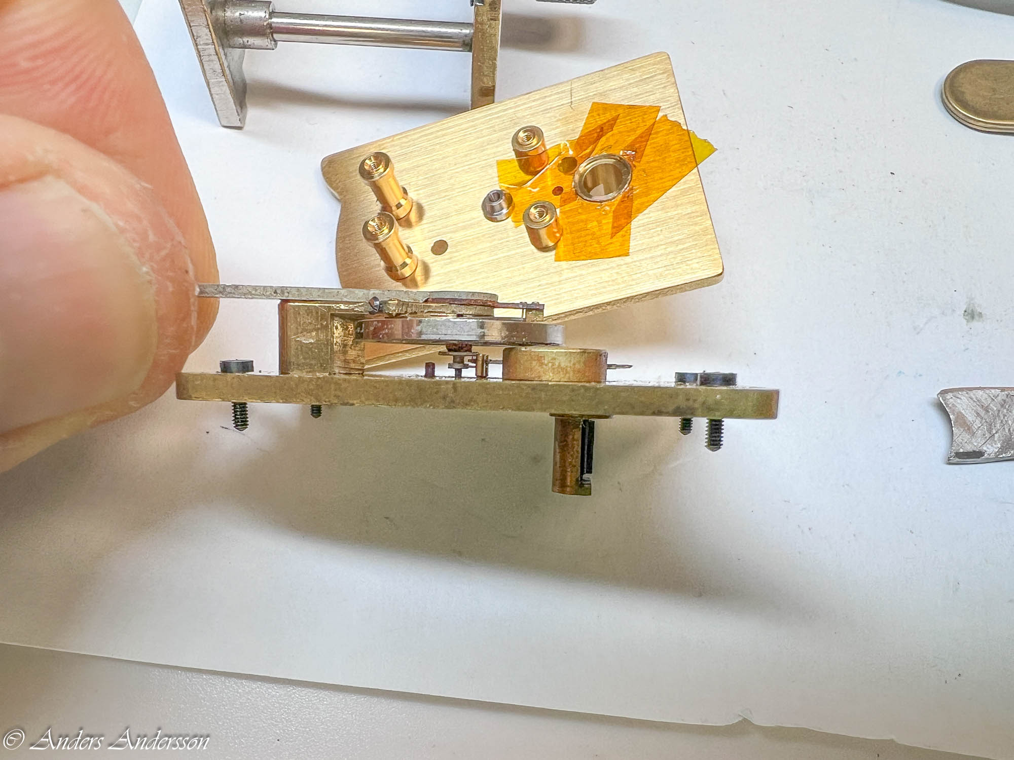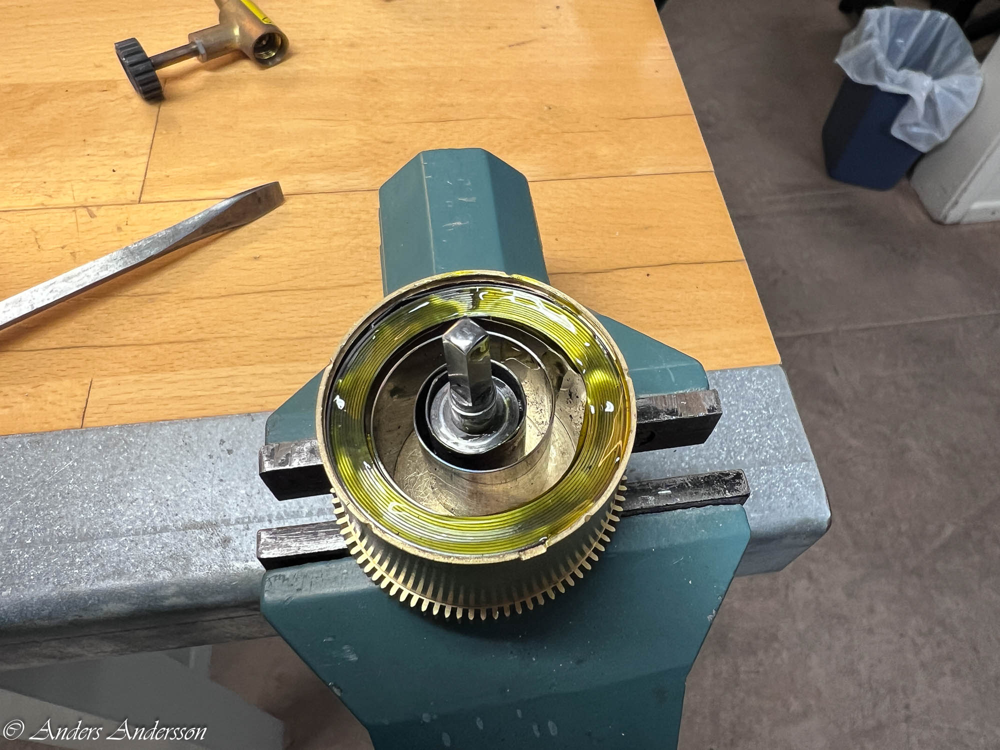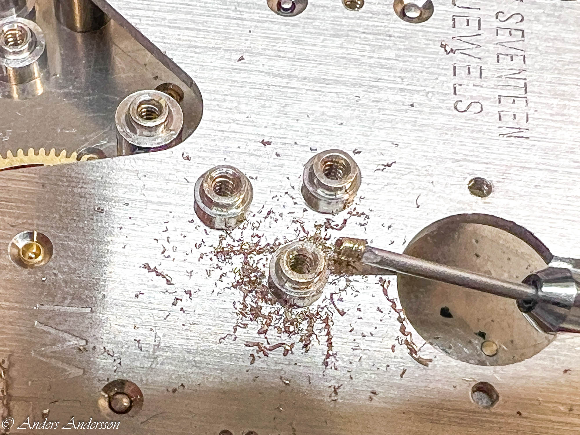 Uppenbarligen har reparatören inte förstått att axeln för visarväxelhjulet INTE är gängad utan inpressad. Inget är dock så skadat att det stoppar funktionen.