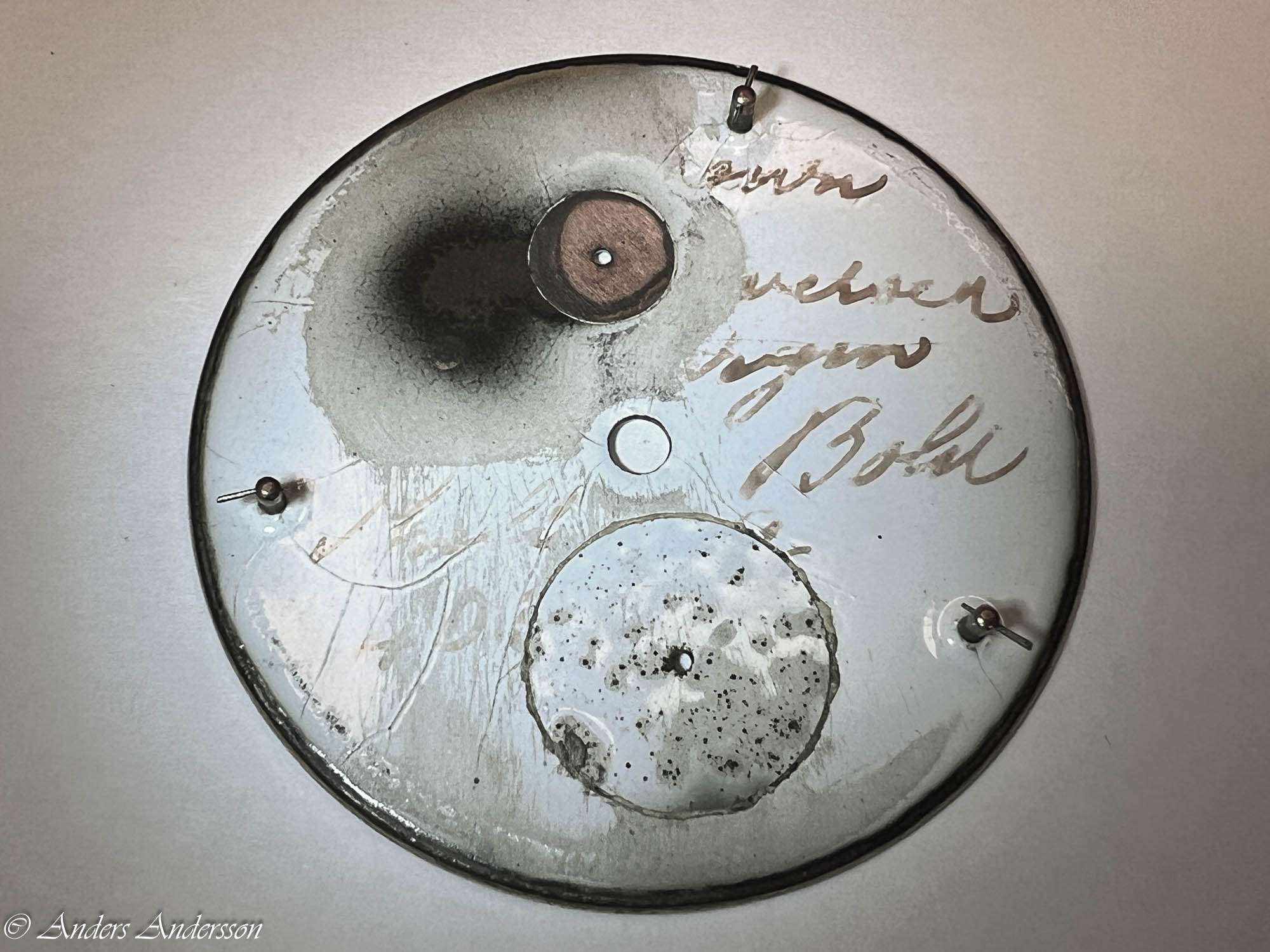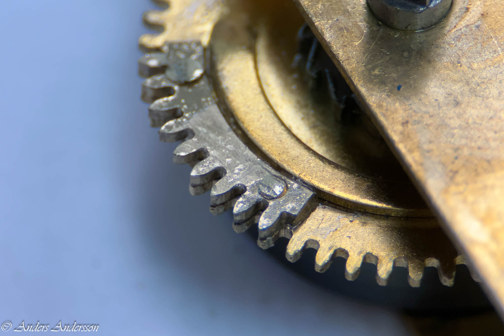Slagverkets delar. Stora hack i verkbottnen samt hjulet under utlösaren för slaget.
