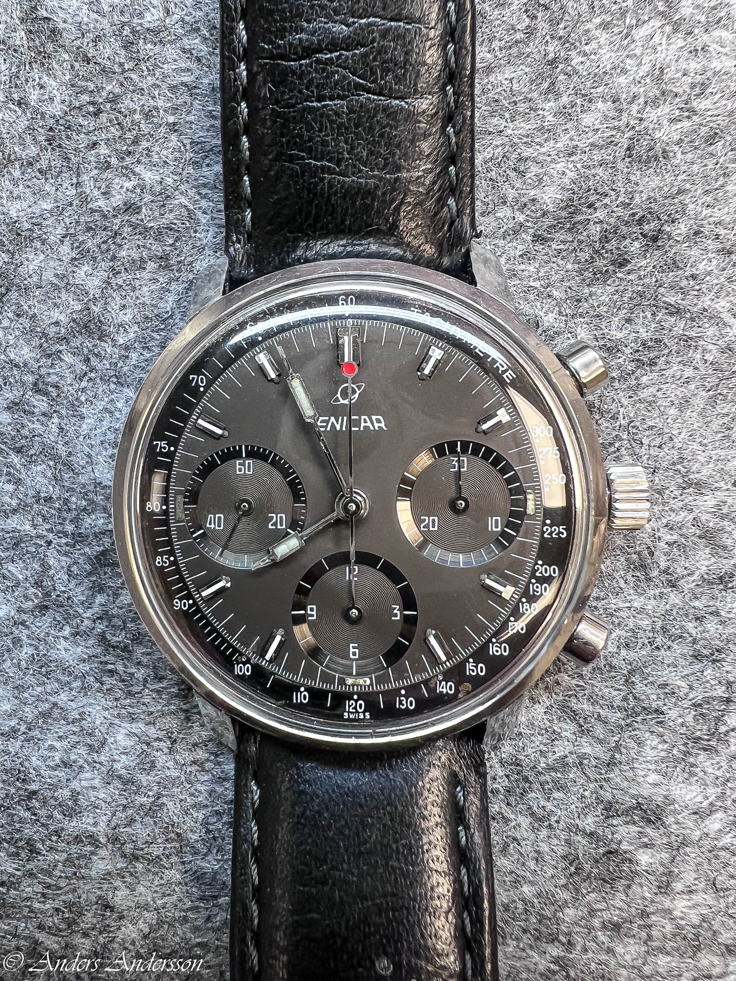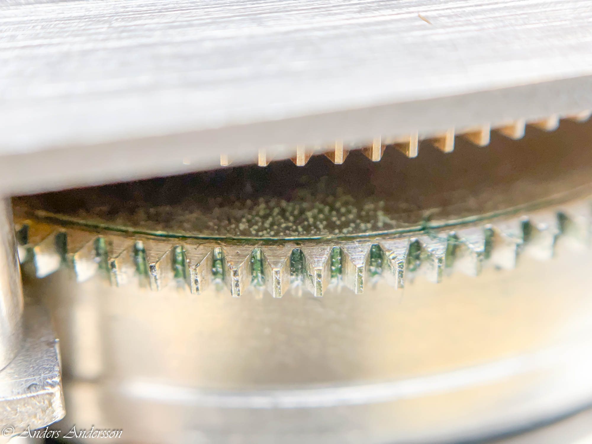 Funktionen för utlösning av slaget fungerade sådär. Antagligen berodde detta på misshandlande delar som jag beskrivit ovan. Armen ska falla ner exakt på minut 00 och 30. Här vandrade utlösarmen sakta nedåt.