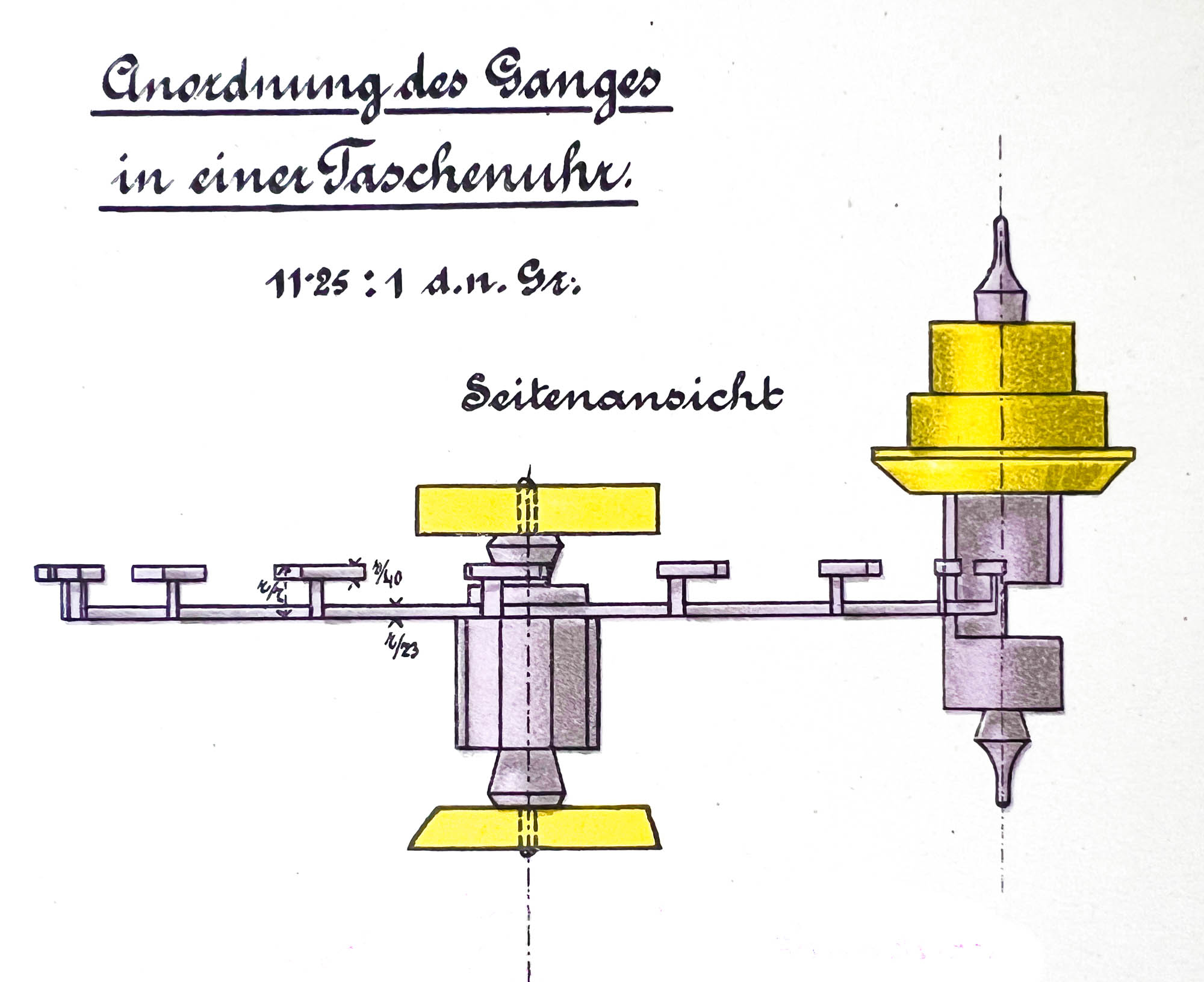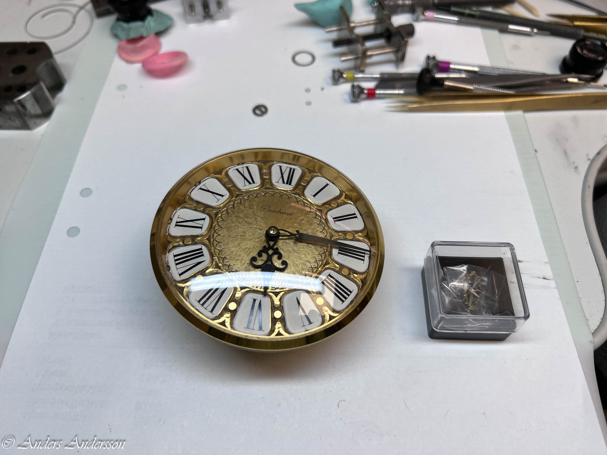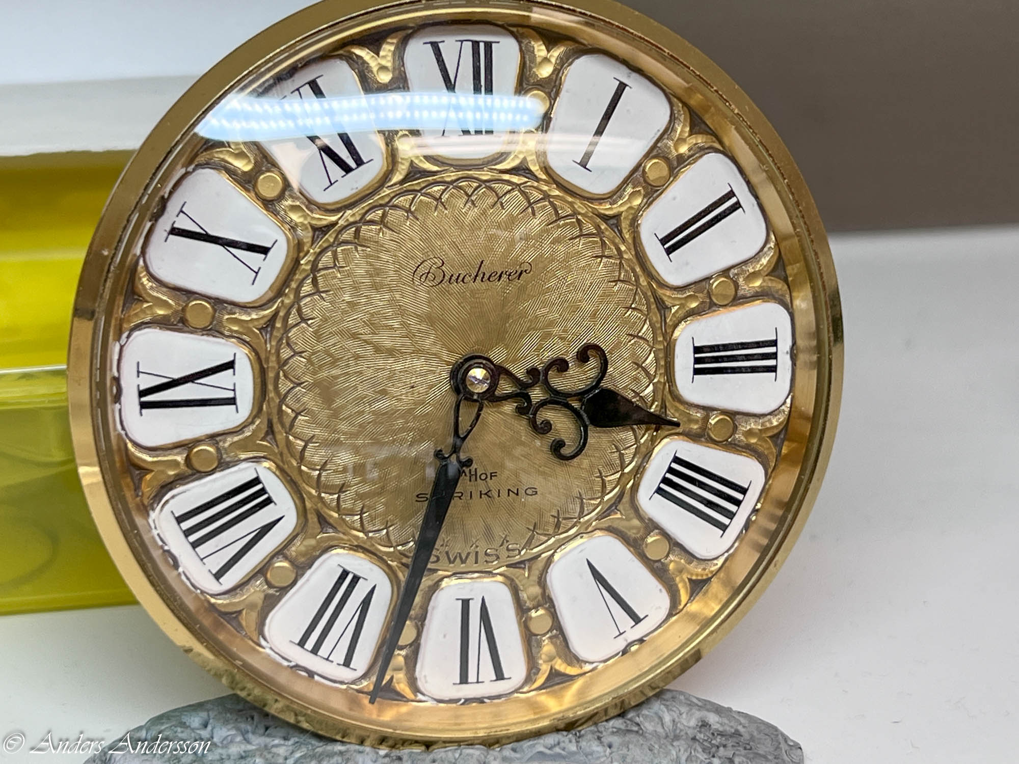 En kund hade lämnat in ett urverk som satt i ett stilur. Urtavlan var märkt med Bucherer och verket var av Imhofs fabrikat. Imhof är kända för sina väckarur, men de tillverkade även ur med olika komplikationer. Verket i detta ur med kaliber 948 är utrustat med en slagmekanism. Klockan slår hel- och halvslag.