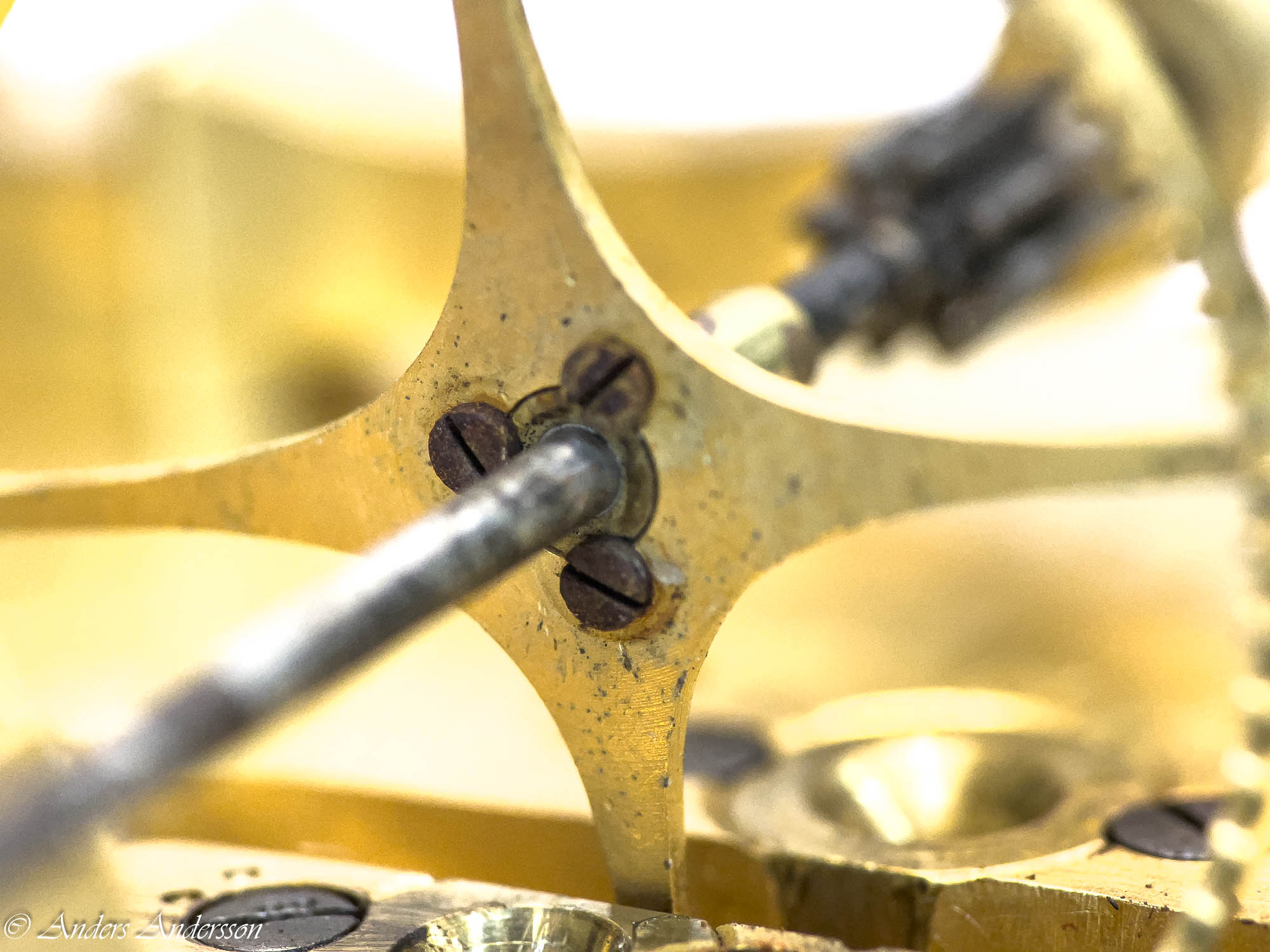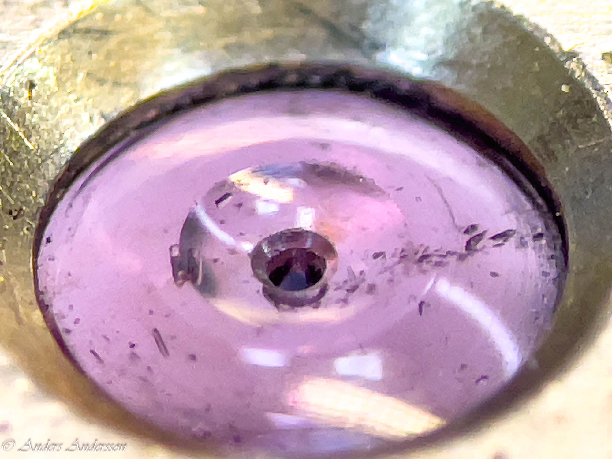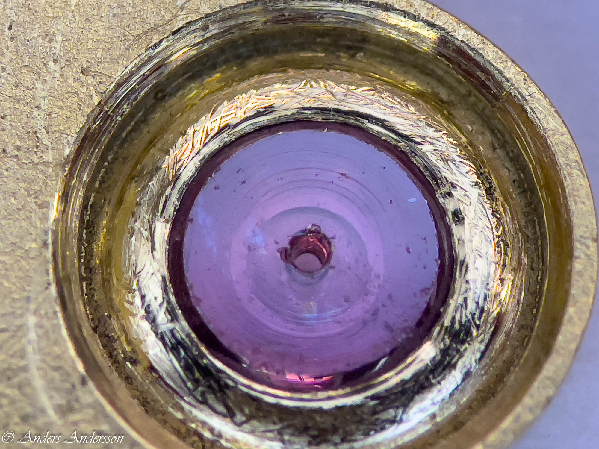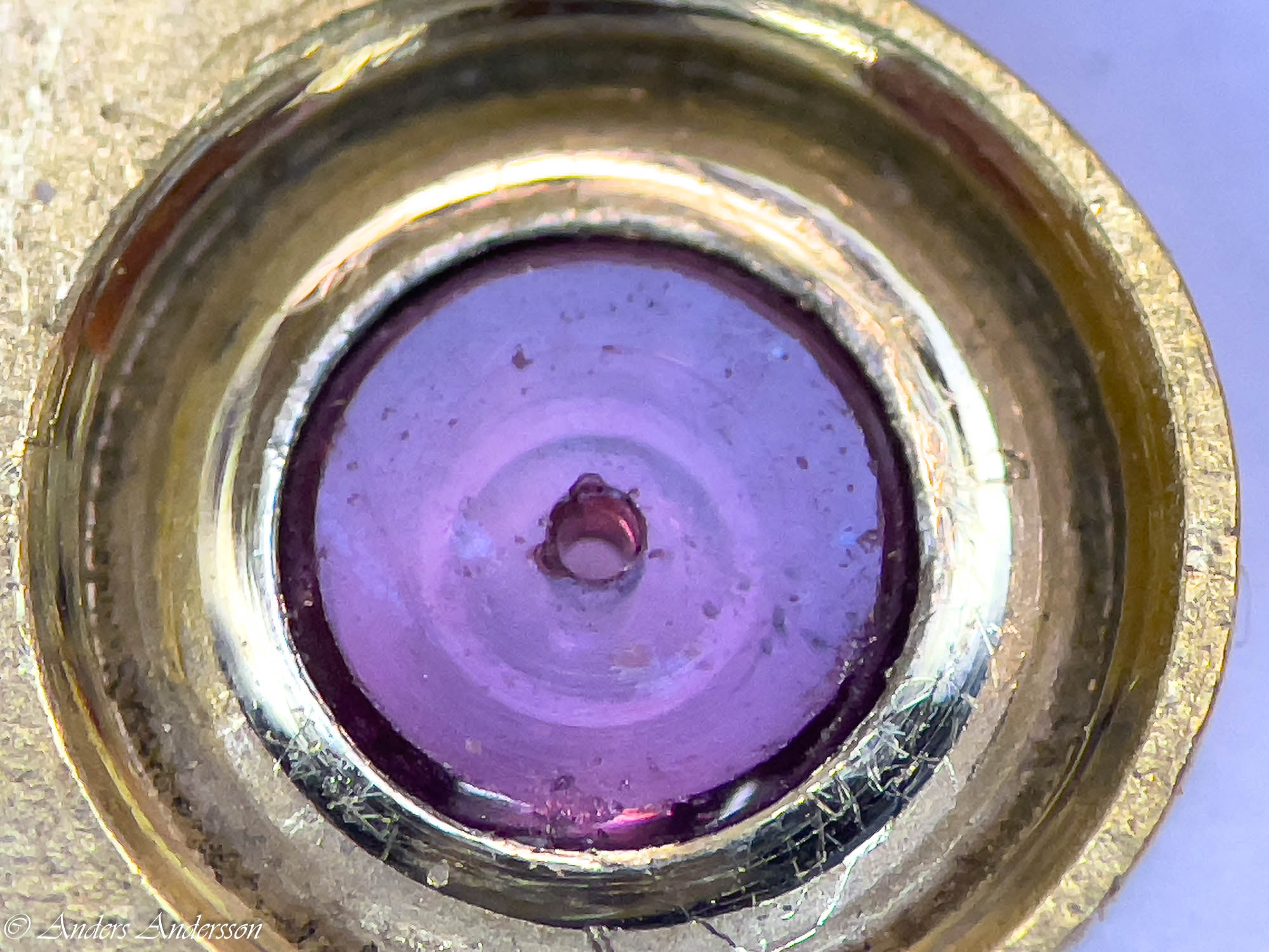 När jag känner på stenen är den helt lös trots att kanten är nedvikt. Jag började fundera på om fattningen varit fylld med till exempel schellack som någon tvättat bort? Kollade i litteraturen och frågade kollegor om de hade hört talas om det men ingen hade sett det förut. Det verkar märkligt att stenarna skulle vara lösa ända från 1857, för då borde klockan alltid gått konstigt. Men just nu har jag ingen annan förklaring än att stenarna är dåligt infattade.