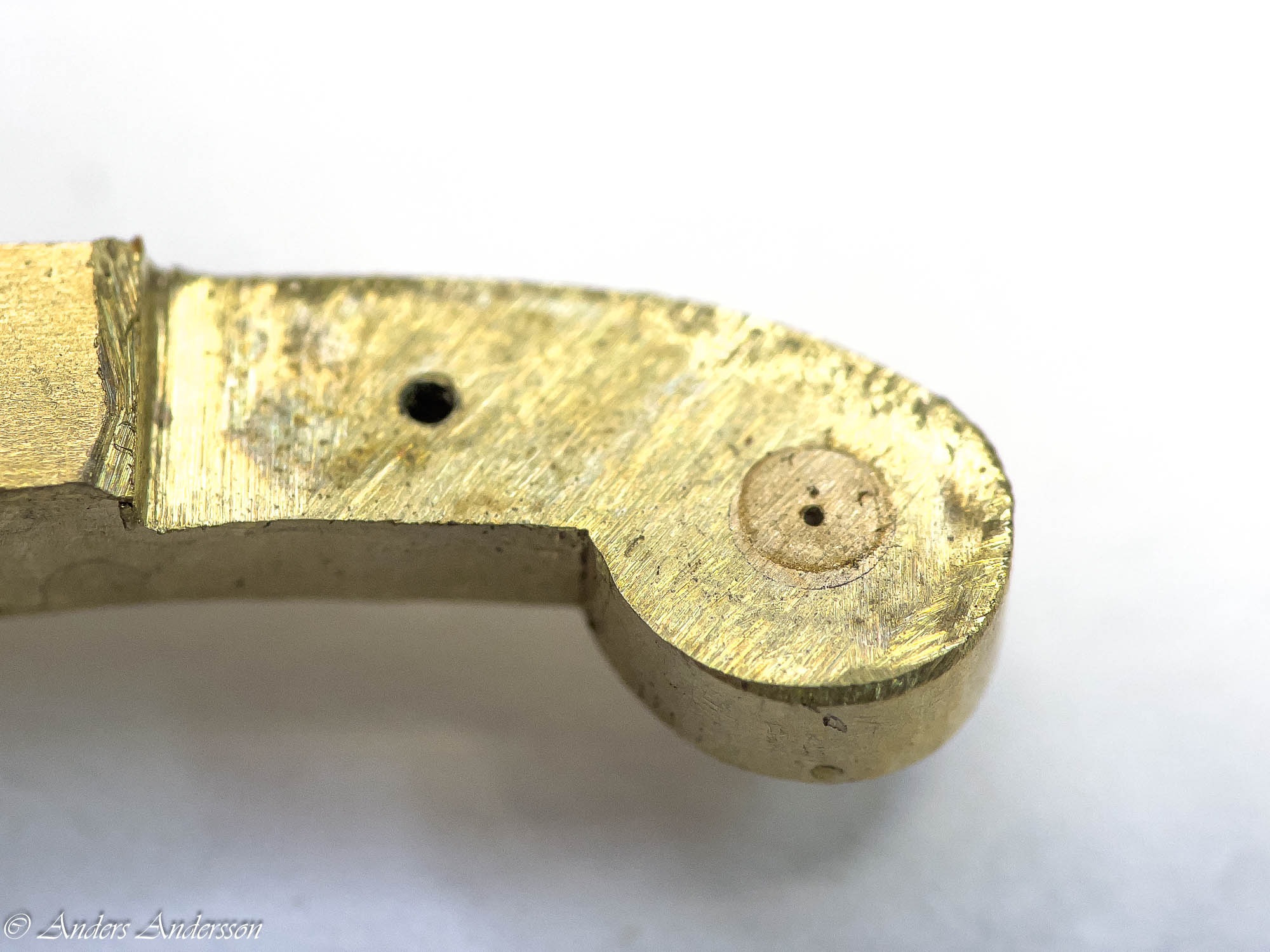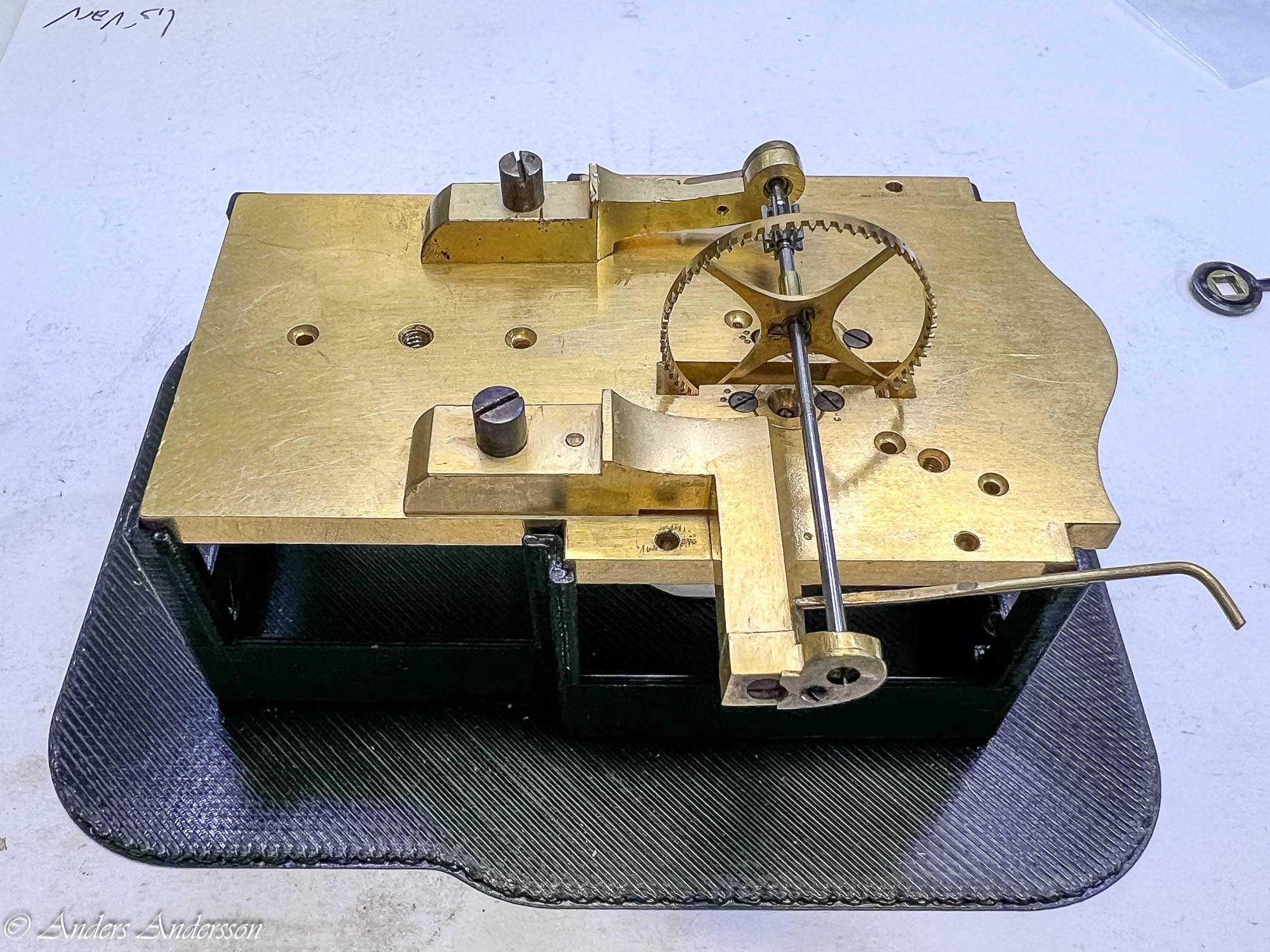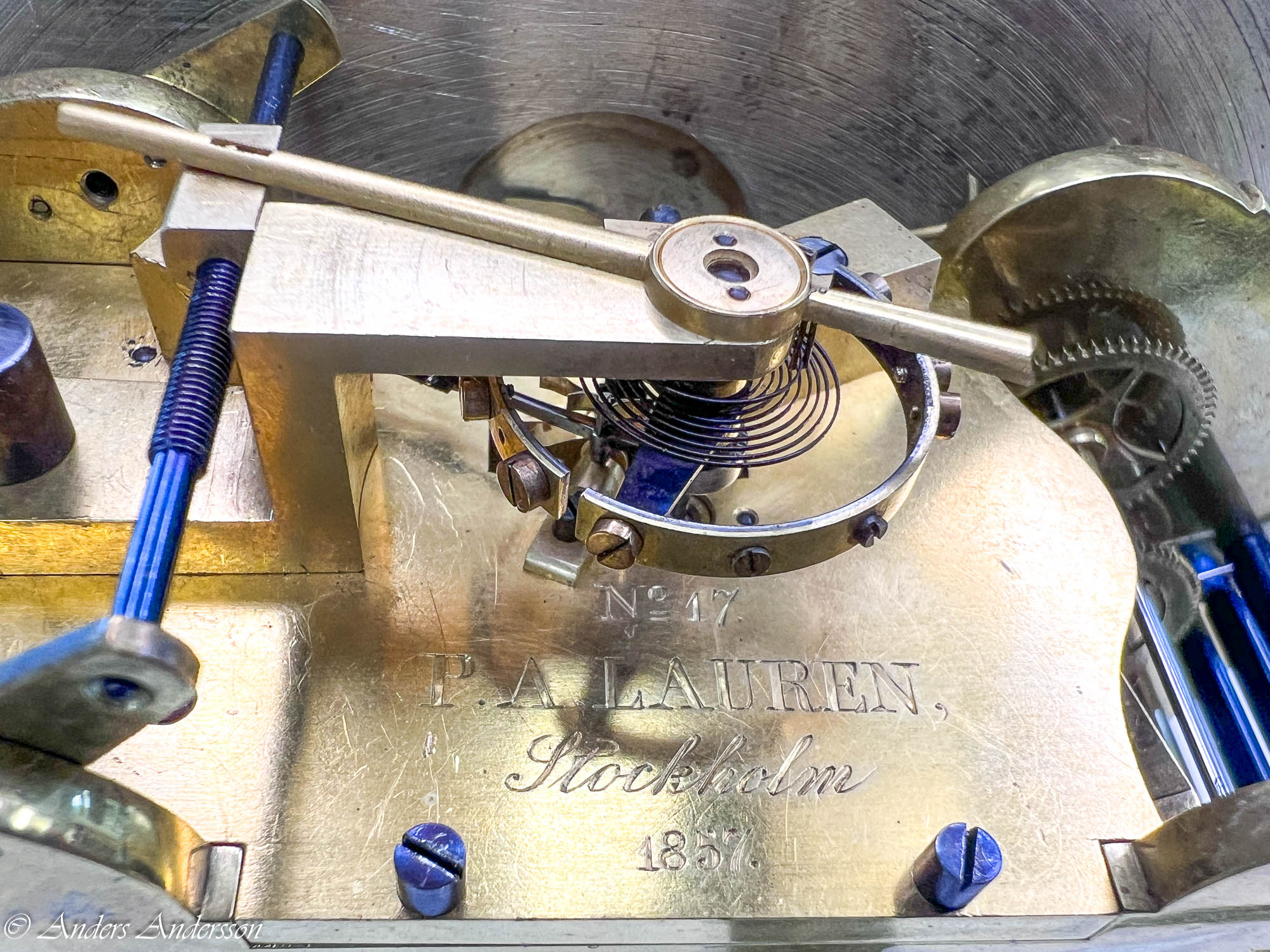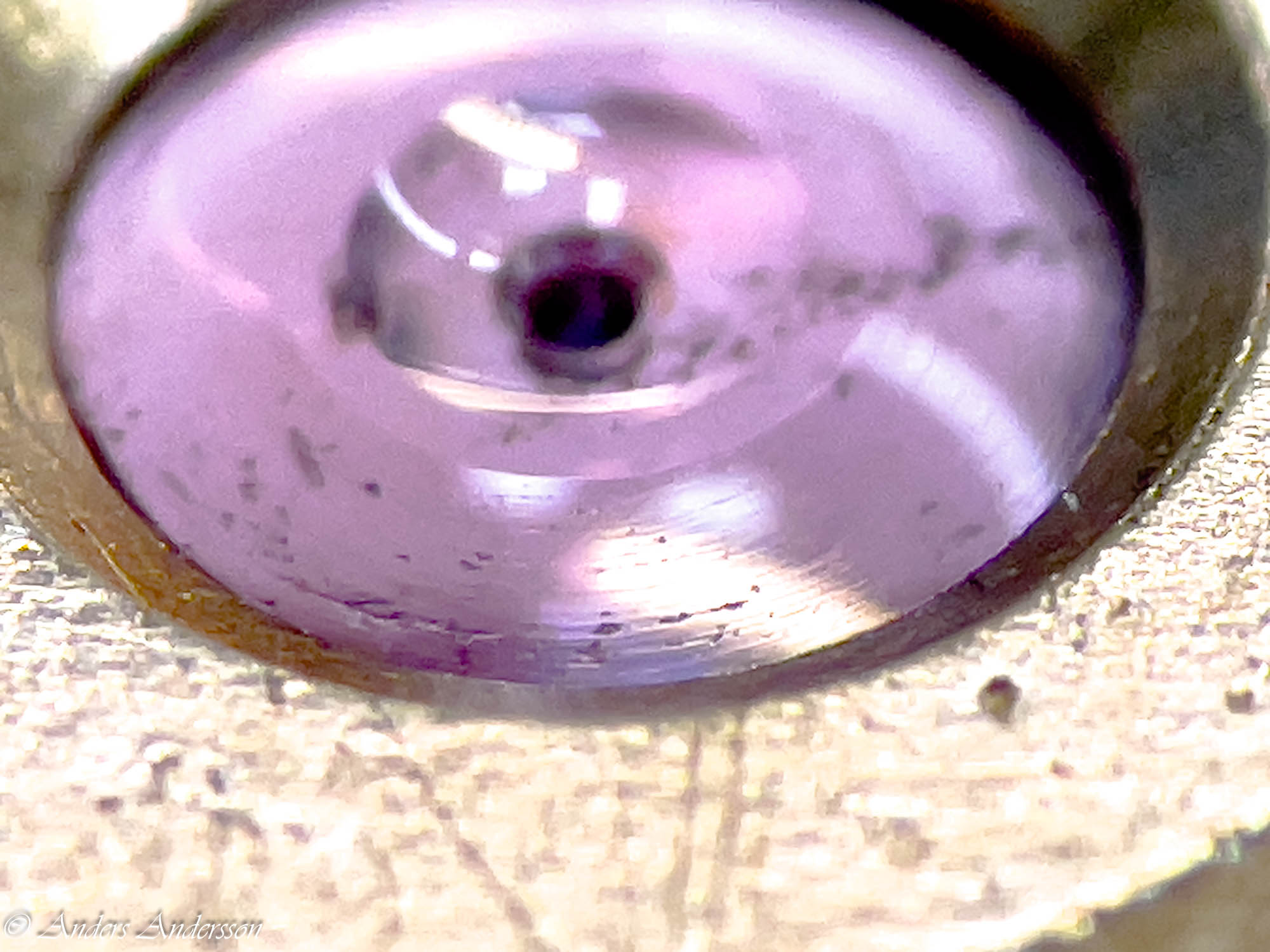 När jag känner på stenen är den helt lös trots att kanten är nedvikt. Jag började fundera på om fattningen varit fylld med till exempel schellack som någon tvättat bort? Kollade i litteraturen och frågade kollegor om de hade hört talas om det men ingen hade sett det förut. Det verkar märkligt att stenarna skulle vara lösa ända från 1857, för då borde klockan alltid gått konstigt. Men just nu har jag ingen annan förklaring än att stenarna är dåligt infattade.