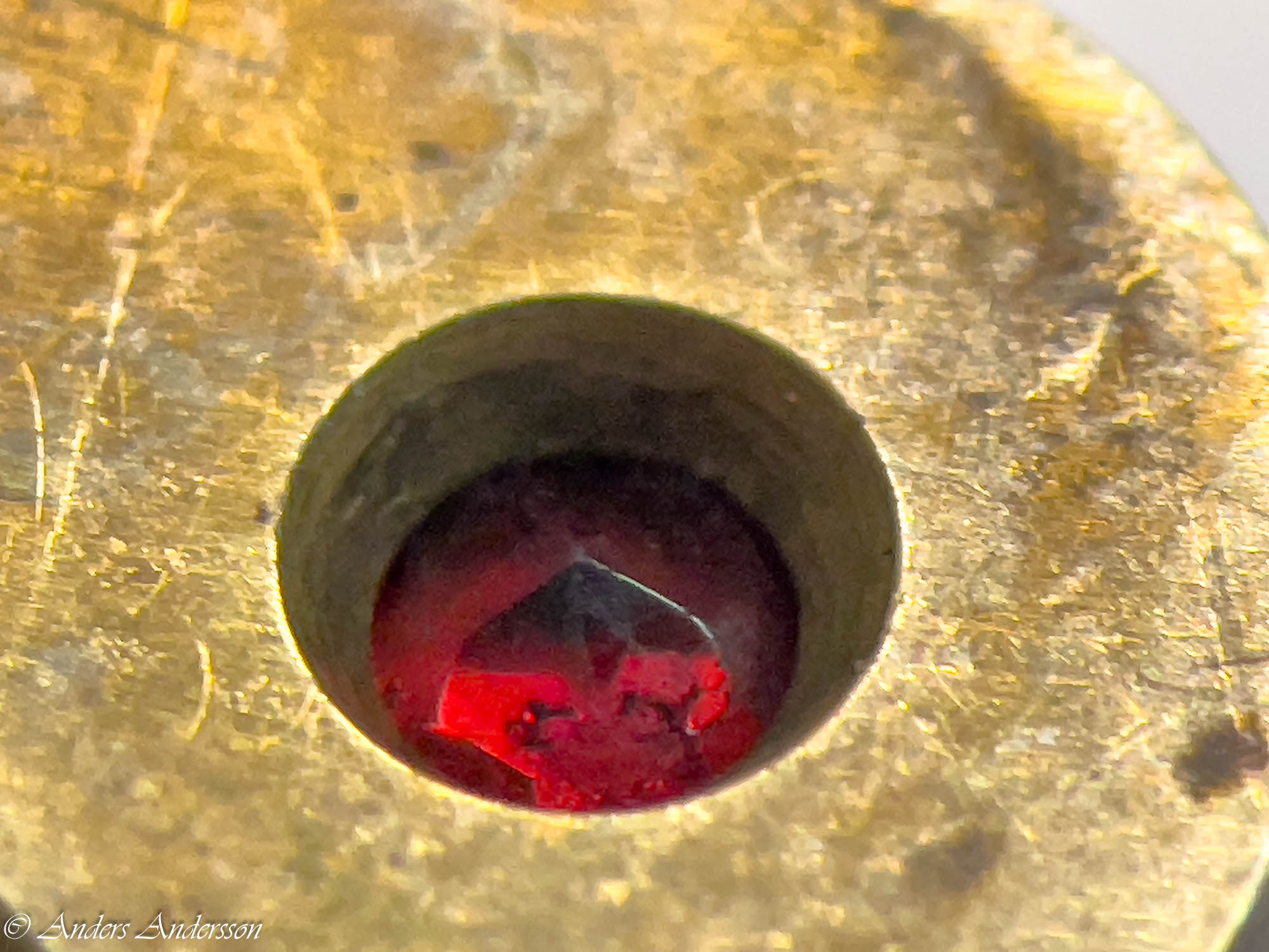 Den vackert slipade motstenen för kronhjulet. Här har man valt en ovanlig, djupröd sten av hög kvalité till skillnad mot de mer rosa, vanligare stenarna.