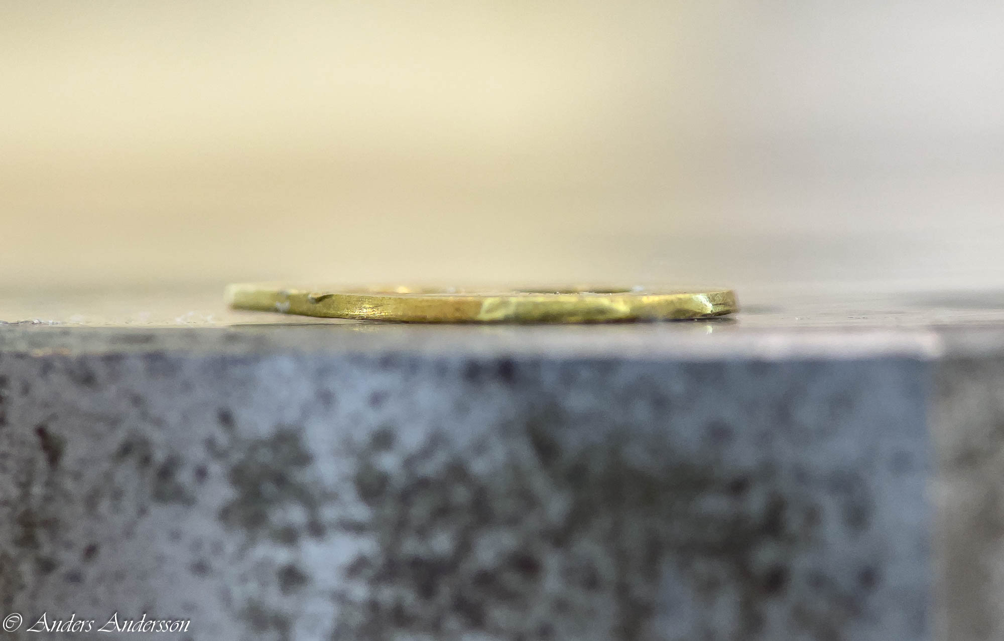 Så här ser fattningarna ut. För att böja ned kanten som håller stenen har man förmodligen satt upp bryggan i svarven. Sedan låter man svarven rotera snabbt samtidigt som man trycker ett kanten av ett spetsigt verktyg mot kanten som då viks ner mot stenen, samtidigt poleras kanten. Man ser tydligt den polerade ytan här.
