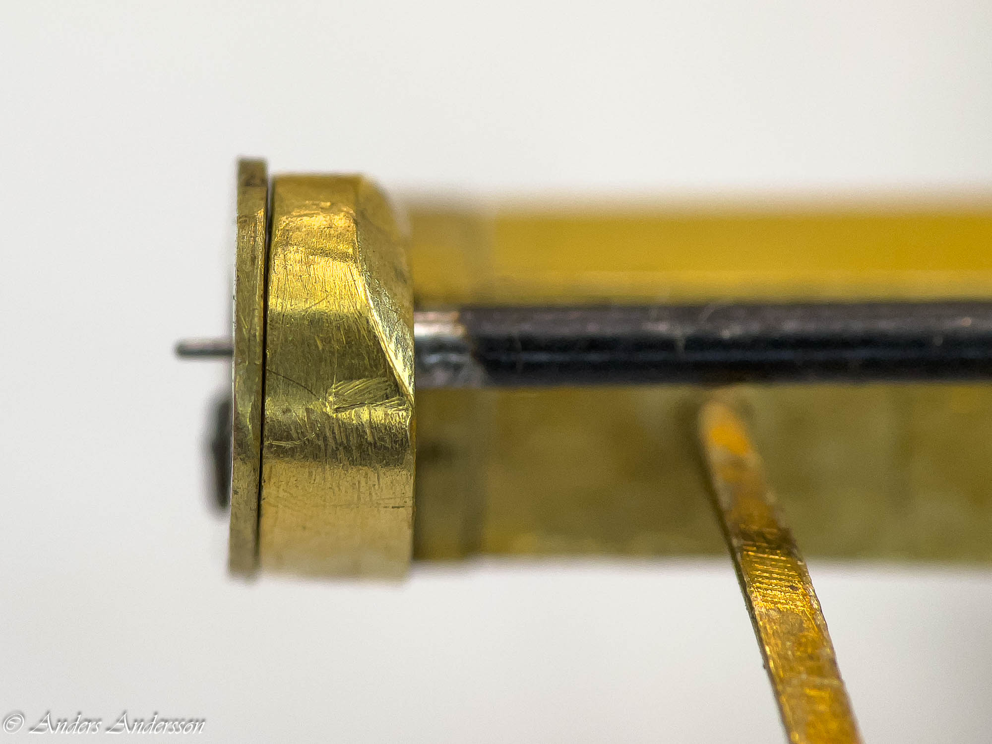 Nu är det dags att i tur och ordning ta itu med de fel jag upptäckt tidigare. Jag börjar med den övre stenfattningen för gånghjulet. Hur kan en sten som en gång fattats sitta löst i sin fattning?