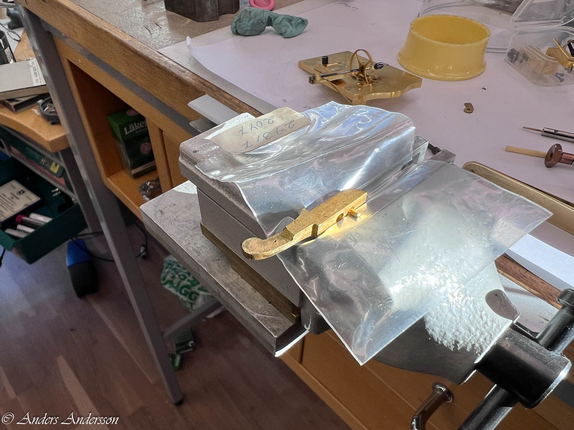 Planfilning och justering av kloven. Plastpåsen i skruvstycket skyddar mot repor och skav.