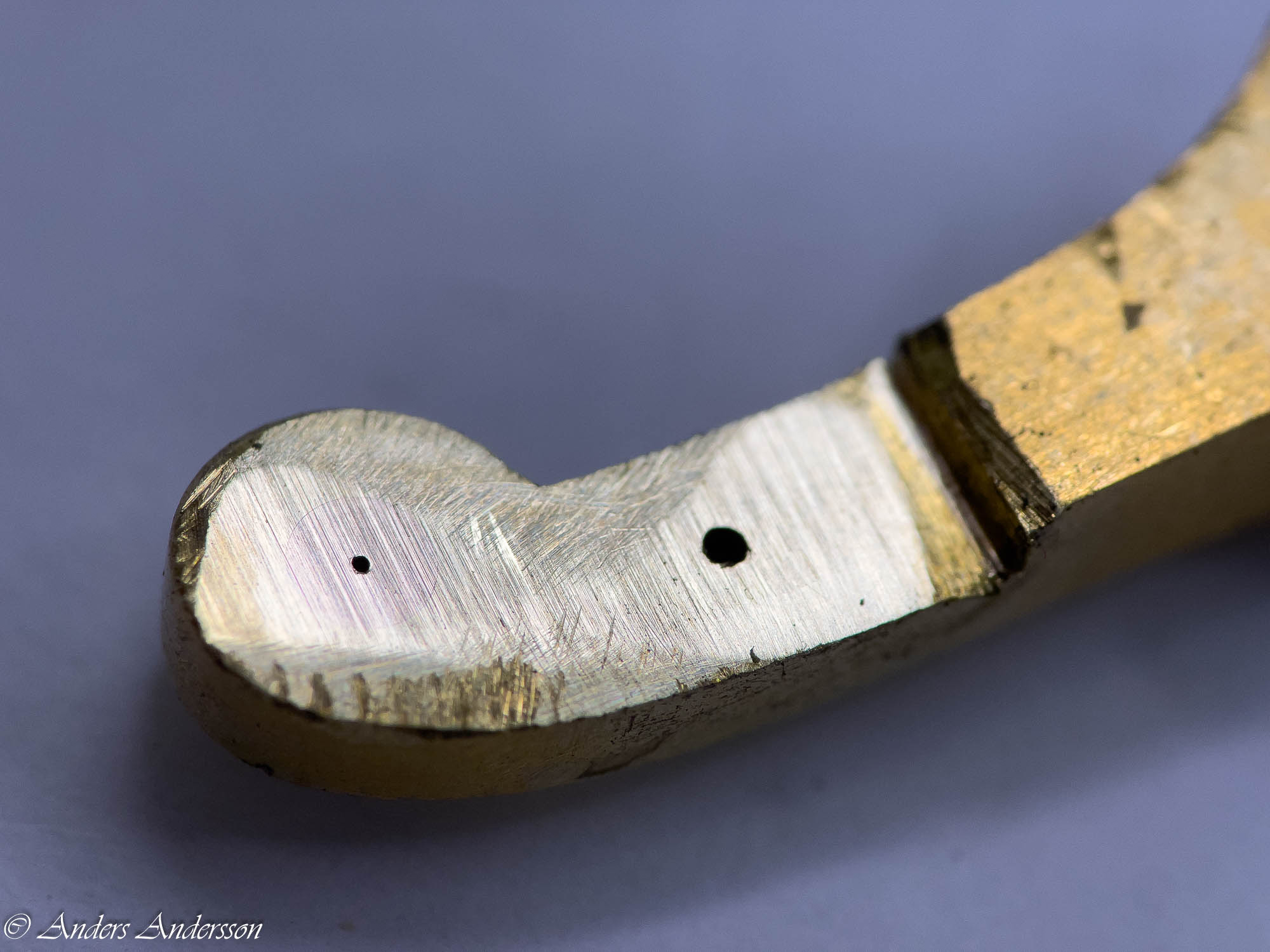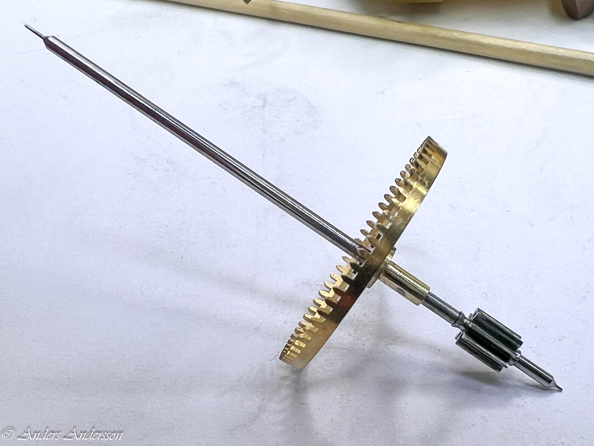 När jag kontrollerade hur gånghjulet fungerade med den nyinfattade stenen upptäckte jag den första överraskningen. Luften i kronhjulet / sekundhjulet var alldeles för stor. Eftersom ingreppet mot gånghjulet är vridet 90° mot kronhjulet är det viktigt att luften är liten så att ingreppet blir korrekt.