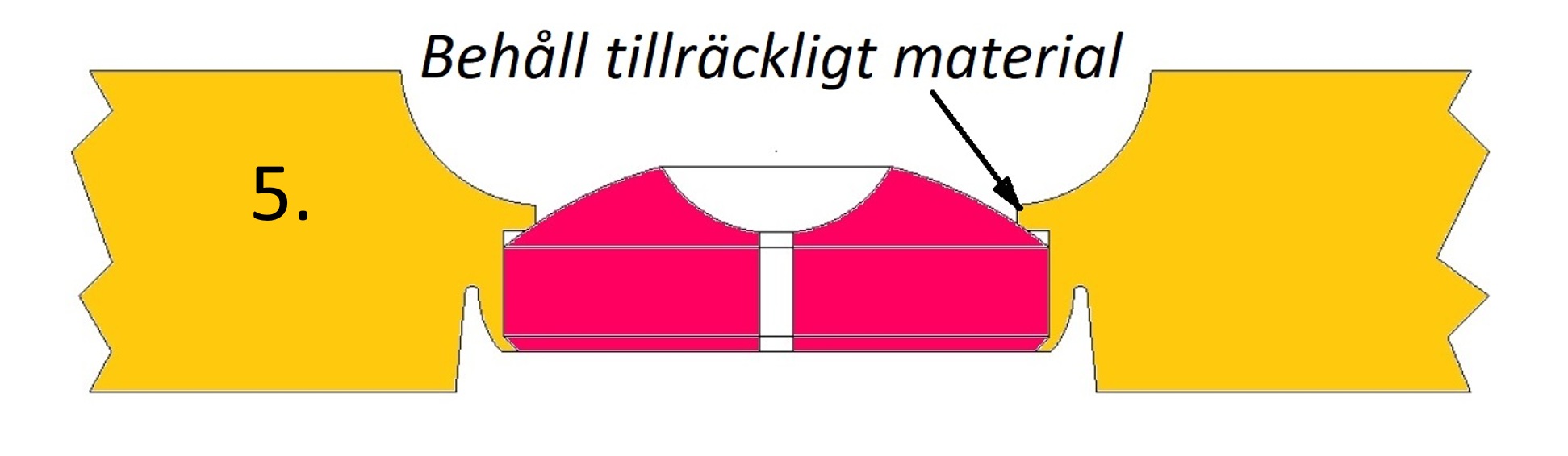 5. Arbetsstycket vänds och lackas upp. Försänkningen svarvas med en speciell halvrund stickel där den plana sidan vänds mot stenen. Försänkningen svarvas till ungefär dubbel storlek av hålet. Tänk på att behålla tillräckligt material så fattningen inte blir ostabil. Polera försänkningen.