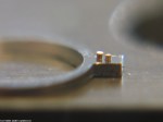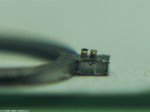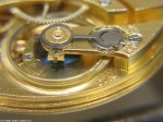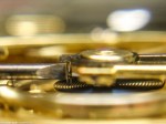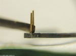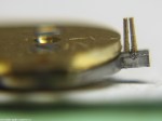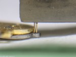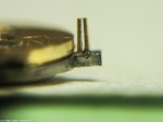 - Nu ska bara avståndet mellan stiften justeras. På en breguetspiral ska ruckstiften sitta så tätt som möjligt, spiralen ska kunna röra sig i höjdled men ej i sidled. Ruckstiften skall sticka ut en halv spiralbredd.