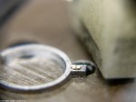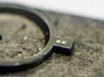 - Lägg ruckarmen med den polerade sidan nedåt på ett glas. Håll om de uppstickande ruckstiften med en bred och kraftig korntång. Slå på änden av korntången tills ruckstiften är helt plana.