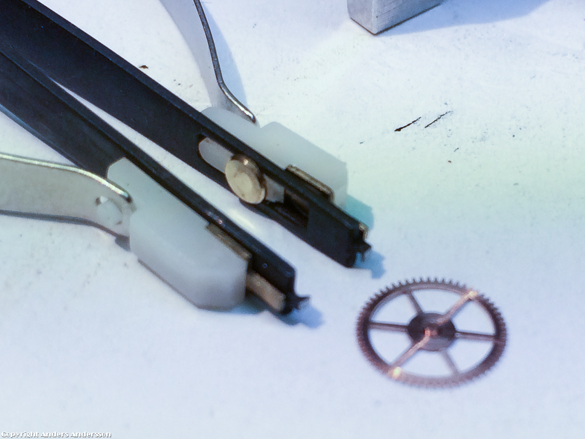 20150203-iPhone-0054 Publicerat 6 februari, 2015 kl. 1200 × 900 i Ulysse Nardin N 115 S Ett spciellt verktyg används för att ta bort det sexskänklade hjulet som driver sekunden.