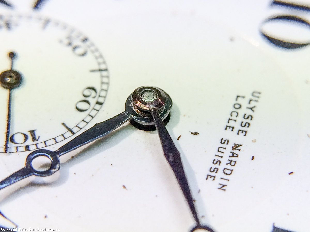 20150203-iPhone-0094 Publicerat 7 februari, 2015 kl. 1200 × 900 i Ulysse Nardin 233725 Detalj av urtavlan. Olika färg på visarna antyder att de bytts ut vid något tillfälle.