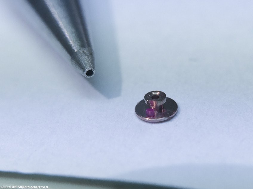 20141130-iPhone-0269 Publicerat 18 februari, 2015 kl. 1200 × 900 i En Omega med problem – del 2. Balansen. Sedan är det dags att sätta fast liverrullen. Tänk på att inte skada den, använd korrekt stans.
