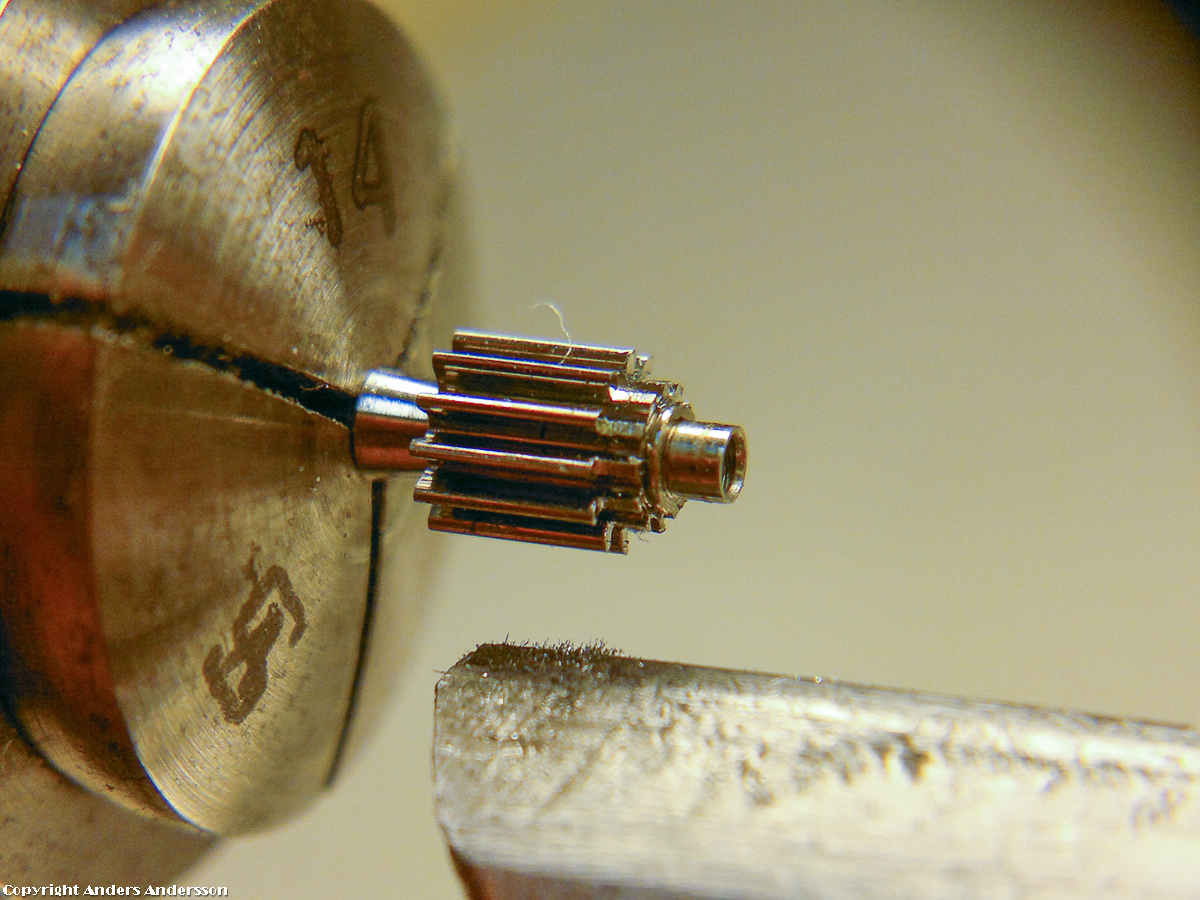 Driven svarvad och klar. Försökt att svarva om stället där niten skall vara så att det skall gå att nita igen. Svarvat ner driven ca 0,1 mm så att det bildas en ny yta. Hjulet kommer ca 0,1 mm längre ner, ytan för niten blir 0,1 mm längre. Gjort ett ”instick” i driven så att den blir lite ”taggig” i ytterdelen. Taggarna skall hugga tag i den mjukare mässingen i hjulet.