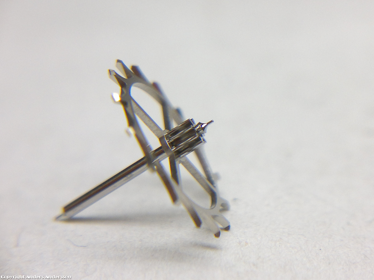 20140310-mobilbilder-1996 Publicerat 11 mars, 2015 kl. 1200 × 900 i Ulysse Nardin med 72 år gammalt fabrikationsfel Gånghjulet. Tappar för motstenar – trumpetformade. Se även spetsarna på gånghjulständerna – tunnade – liten friktion.