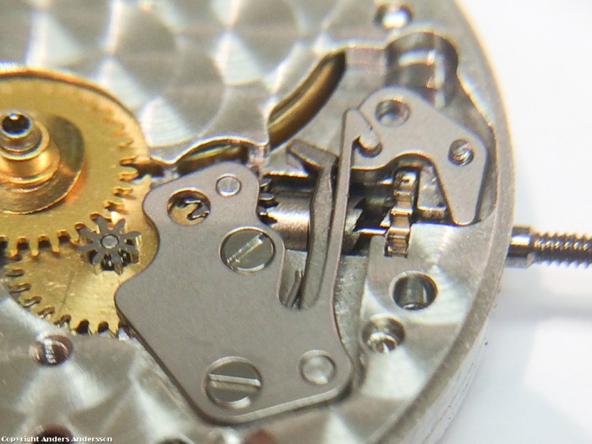 Uppdraget. Här i visarställäge. När man drar ut kronan skjuter regeln visarställarmen åt sidan vilket medför att muffhjulet skjuts åt vänster så att det kommer i ingrepp med visarställhjulet så att klockan kan ställas. Den stora brickan med två skruvar och en lång fjädrande arm kallas tirettfjäder – den håller dels hjulen under på plats, dels sköter om att regeln stannar i sina lägen – uppdrag eller visarställning.