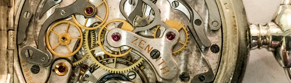 - Nollställararmen ligger emot både minuträknarhjulet och kronografsekundhjulet. Man ser spetsen på hjärtat – pekar åt vänster. Under ser du kr. sekundhjulet. Det stora hjulet under är centrumhjulet – på det sitter minutvisaren – går ett varv/timma. De två hjulen överst till vänster driver kronografen – det högra av dem sitter på en flyttbar arm som rör sig när man trycker av/på kronografen.