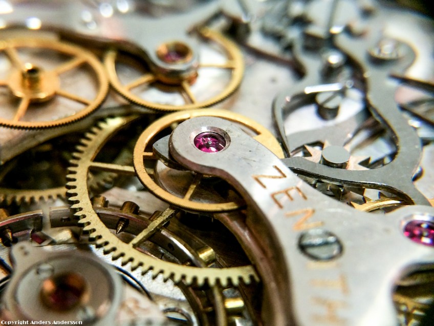 Nollställararmen ligger emot både minuträknarhjulet och kronografsekundhjulet. Man ser spetsen på hjärtat – pekar åt vänster. Under ser du kr. sekundhjulet. Det stora hjulet under är centrumhjulet – på det sitter minutvisaren – går ett varv/timma. De två hjulen överst till vänster driver kronografen – det högra av dem sitter på en flyttbar arm som rör sig när man trycker av/på kronografen.