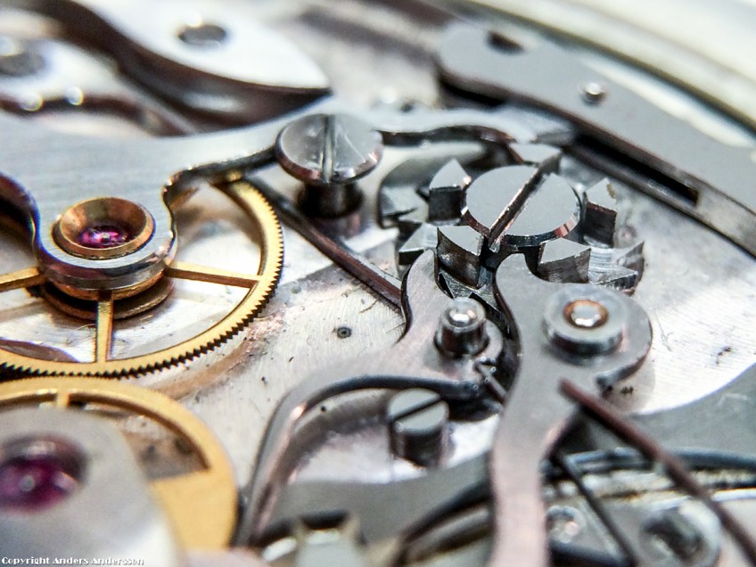 Pelarhjulet till höger. ”Sköter” om start – stopp – nollställning. Kl 12 på pelarhjulet är armen för tidtagning på/av lyft – drivningen av kronografsekunden är stoppad. Kl 6 på pelarhjulet har nollställarmen fallit ned – klockan nollställd. Kl 8 på pelarhjulet har armen som blockerar kronografsekundhjulet lyfts så att det går fritt under nollställningen.