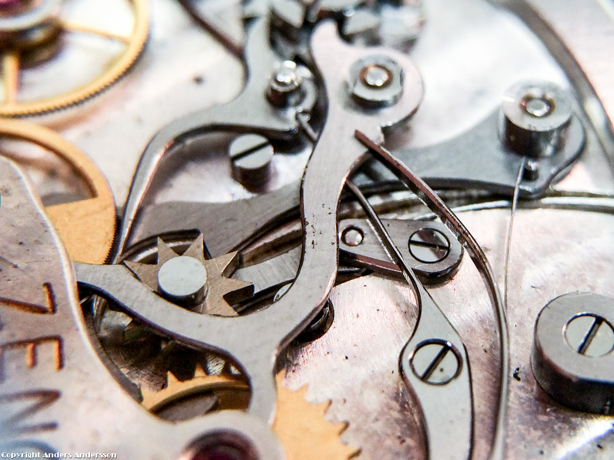 Nollställararm – blockeringsarm. Den horisontala armen är armen som matar fram minuträknaren. Finessen med denna ovanliga konstruktion av minutframmatningen är att den är väldigt exakt och den matar fram precis när sekundvisaren rör 0-strecket. Annars brukar det ta 0,5 – 1 sekund för växlingen.