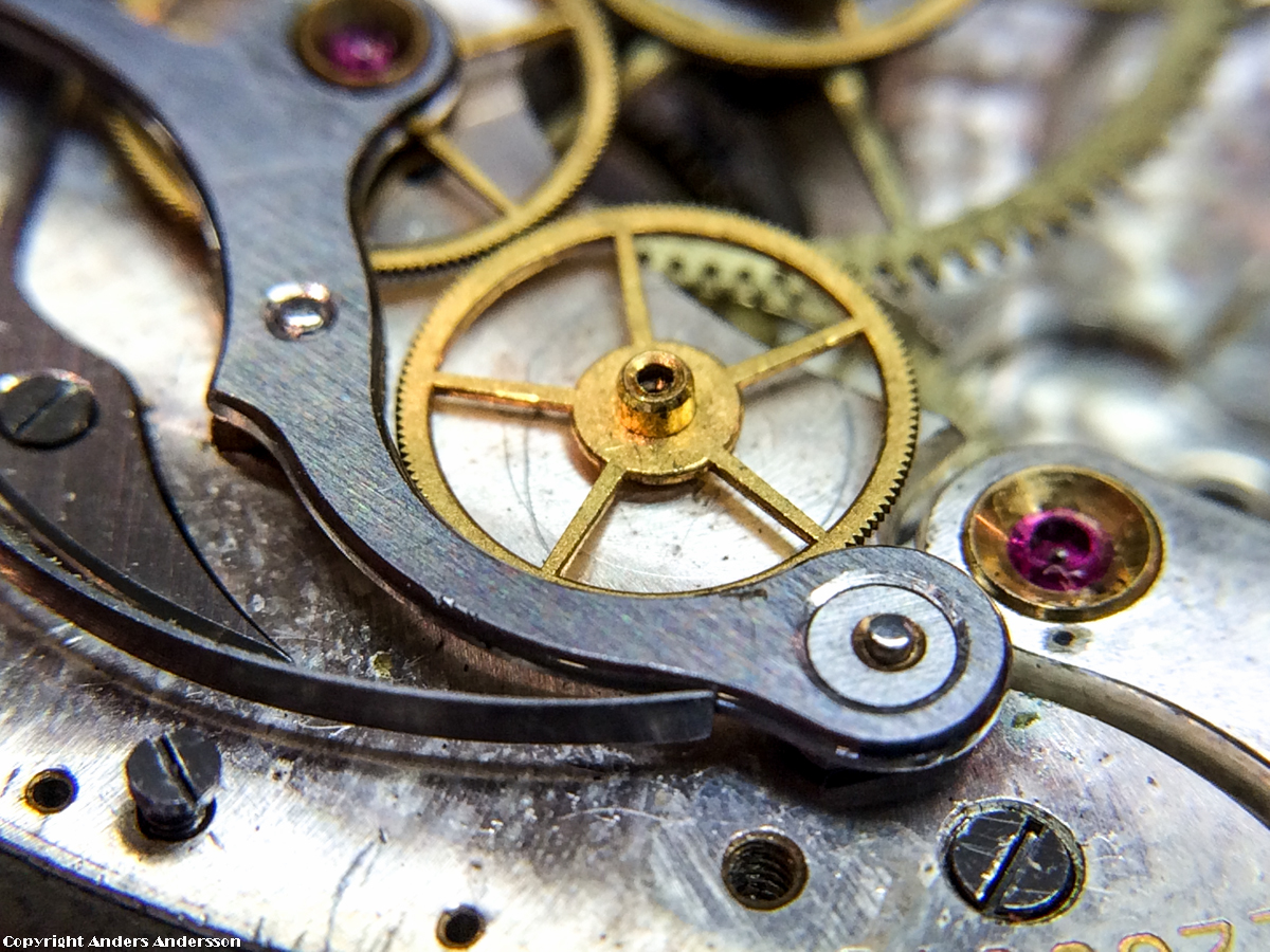 20150601-iPhone-0348 Publicerat 3 juli, 2015 kl. 1200 × 900 i Zenith chronograph 19”’ – del 1 Kopplingsarmen och dess fjäder. Drivhjulet för kronografen.