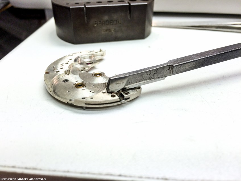 20150601-iPhone-0404 Publicerat 3 juli, 2015 kl. 1200 × 900 i Zenith chronograph 19”’ – del 1 Någon gjort grader på undersidan av bryggan. Skär bort dem med en stickel. Kontrollerar planheten igen.