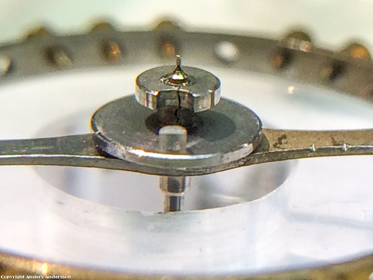 20150601-iPhone-0429 Publicerat 3 juli, 2015 kl. 1200 × 900 i Zenith chronograph 19”’ – del 1 Ajdå! Ytterligare fel. Liverrullen spräckt. Förmodligen är balansaxeln utbytt vid något tillfälle och då passade inte liverrullen riktigt.