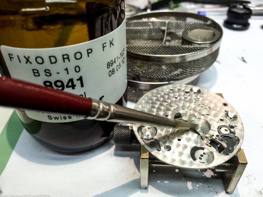 20150601-iPhone-0442 Publicerat 3 juli, 2015 kl. 1200 × 900 i Zenith chronograph 19”’ – del 1 Efter rengöring epilamiserar jag verket. Detta för att oljan skall stanna där jag lägger den. Annars kan olja och fett ”fly” ifrån sina lagerställen och smörjningen blir dålig.
