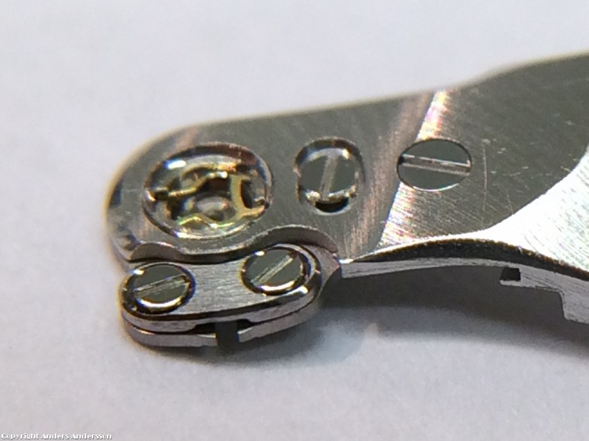 20151020-iPhone-0119 Publicerat 8 november, 2015 kl. 1200 × 900 i Patek Philippe 23-300PM Spiralstolpen löper i ett spår under brickan med två skruvar. Detta för att spiralen lätt skall centrera sig. Kontrollera spåret så att stolpen kan röra sig fritt.