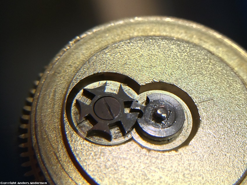 20160111-iPhone-0220 Publicerat 16 januari, 2016 kl. 1200 × 900 i Ett fickur med stopp i verket Klart. När fjädern dras upp roterar fingret motsols ca sex varv tills det tar stopp. När klockan går roterar fjäderhuset runt kärnan/fingret tills det tar stopp igen.