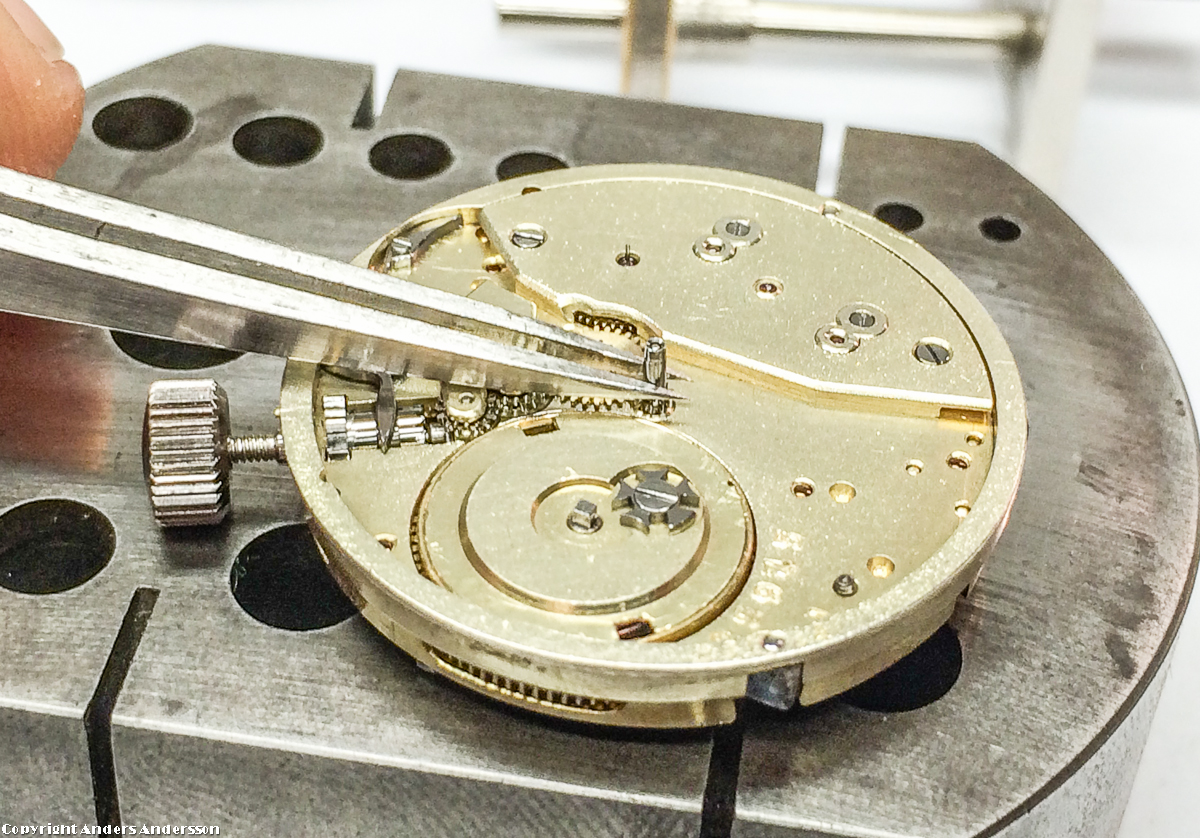 20160704-iPhone-0054 Publicerat 19 juli, 2016 kl. 1200 × 838 i Ett hundra urår Minutröret monteras. Jag lägger verket på stålplanet med centrumaxeln på en plan del. Brukar hållen korntången som på bilden och sedan knacka med en hammare på korntången för att fästa minutröret.