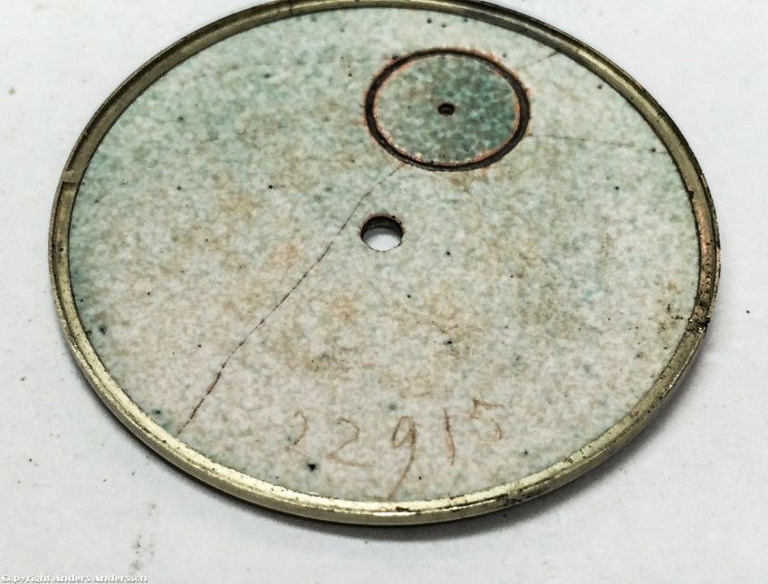 20160704-iPhone-0060 Publicerat 19 juli, 2016 kl. 1200 × 914 i Ett hundra urår Undersidan av tavlan. Den har inga tavelpelare utan en nysilverring svarvas och anpassas så att tavlan fästs med friktion mot verket. Tavlan emaljerades på båda sidor för att inte få spänningar.