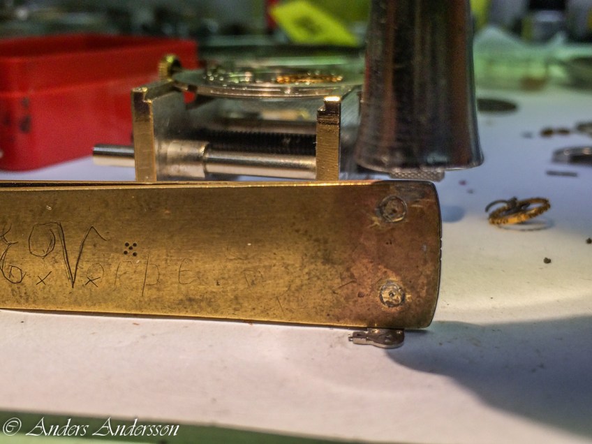 Jag lade balanskloven på ett stålplan och kontrollerade så att den var helt plan och inte böjd. Naturligtvis var den böjd! Tog min mässingskorntång på högkant och slog med hammaren på den för att böja tillbaka kloven. Det mjuka arbetsunderlaget gör att kloven böjs fint.