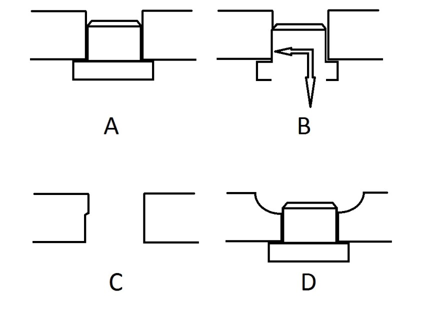 Några enkla skisser som beskriver vad som händer om en tapp inte sticker ut i hela sin längd i sin lagring. Detta brukar man kalla för ”underslitning”. A visar att tappen inte sticker ut tillräckligt långt. B visar vad som händer när hålet börjar slitas. Samtidigt som hålet slits sidledes trycks även axeln nedåt genom tappens avfasning. När det är riktigt illa blockeras axeln totalt. C visar hur hålet ser ut i genomskärning. Hålet ser olika ut om du tittar på in- eller utsidan. Så vid en hastig blick från utsidan ser ju hålet helt runt och perfekt ut. D man skulle gjort en försänkning för att undvika detta fel.