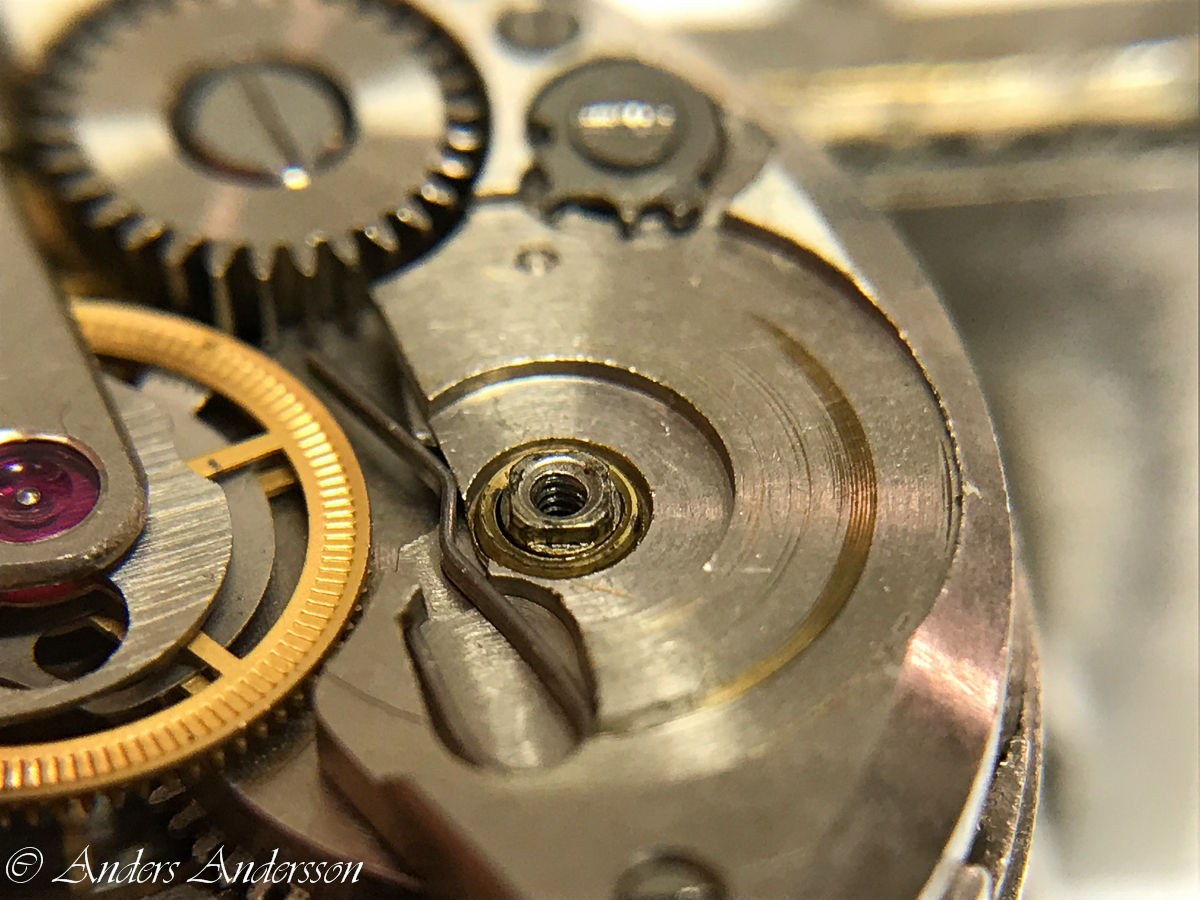 20170920-iPhone-0145 Publicerat 1 oktober, 2017 kl. 1200 × 900 i ETA 1168 ovanligt, enkelt Märke efter slitage i fjäderhusbryggan, hålet för fjäderhuset redan omfodrat – men nu slitet igen.